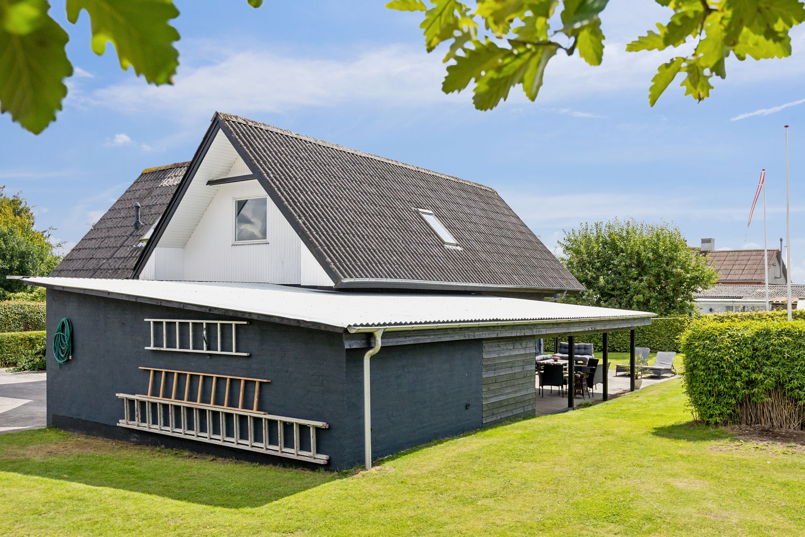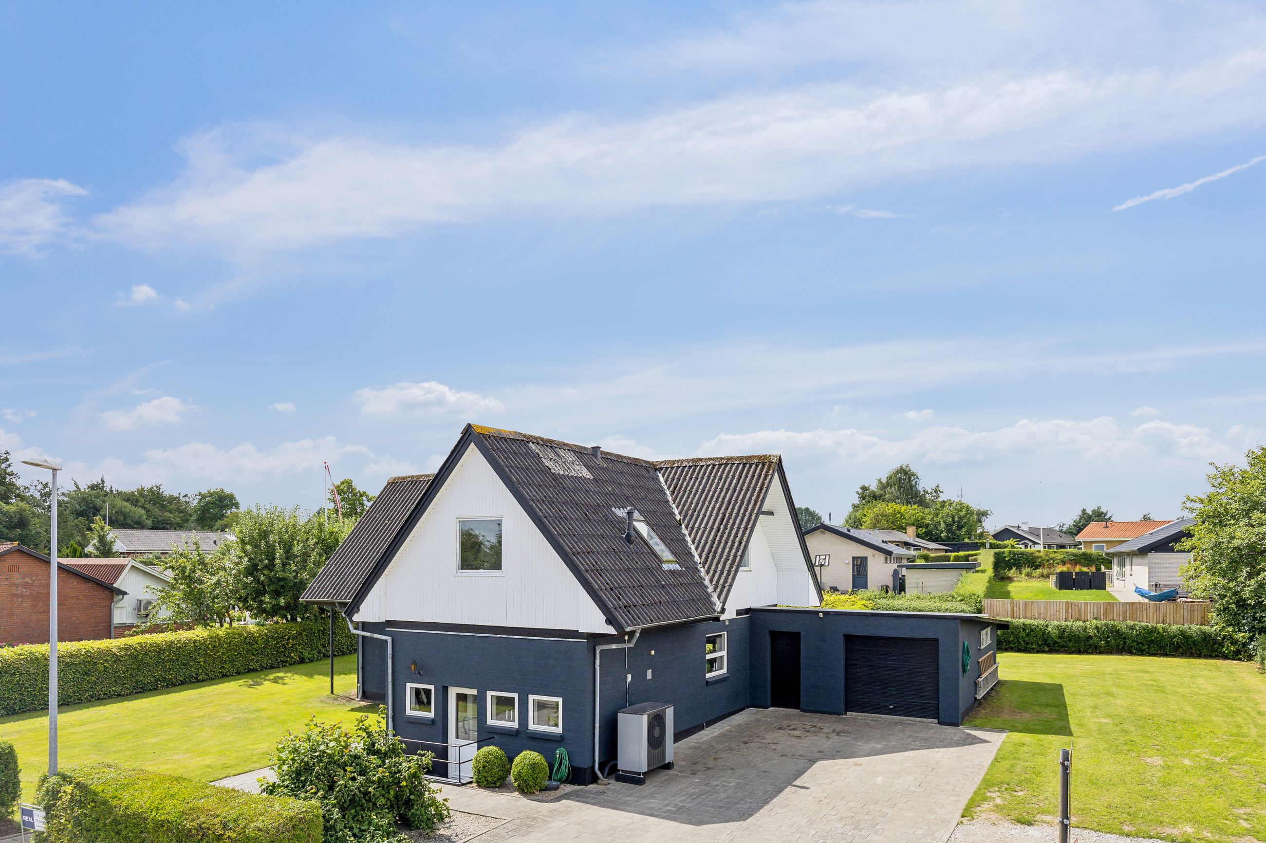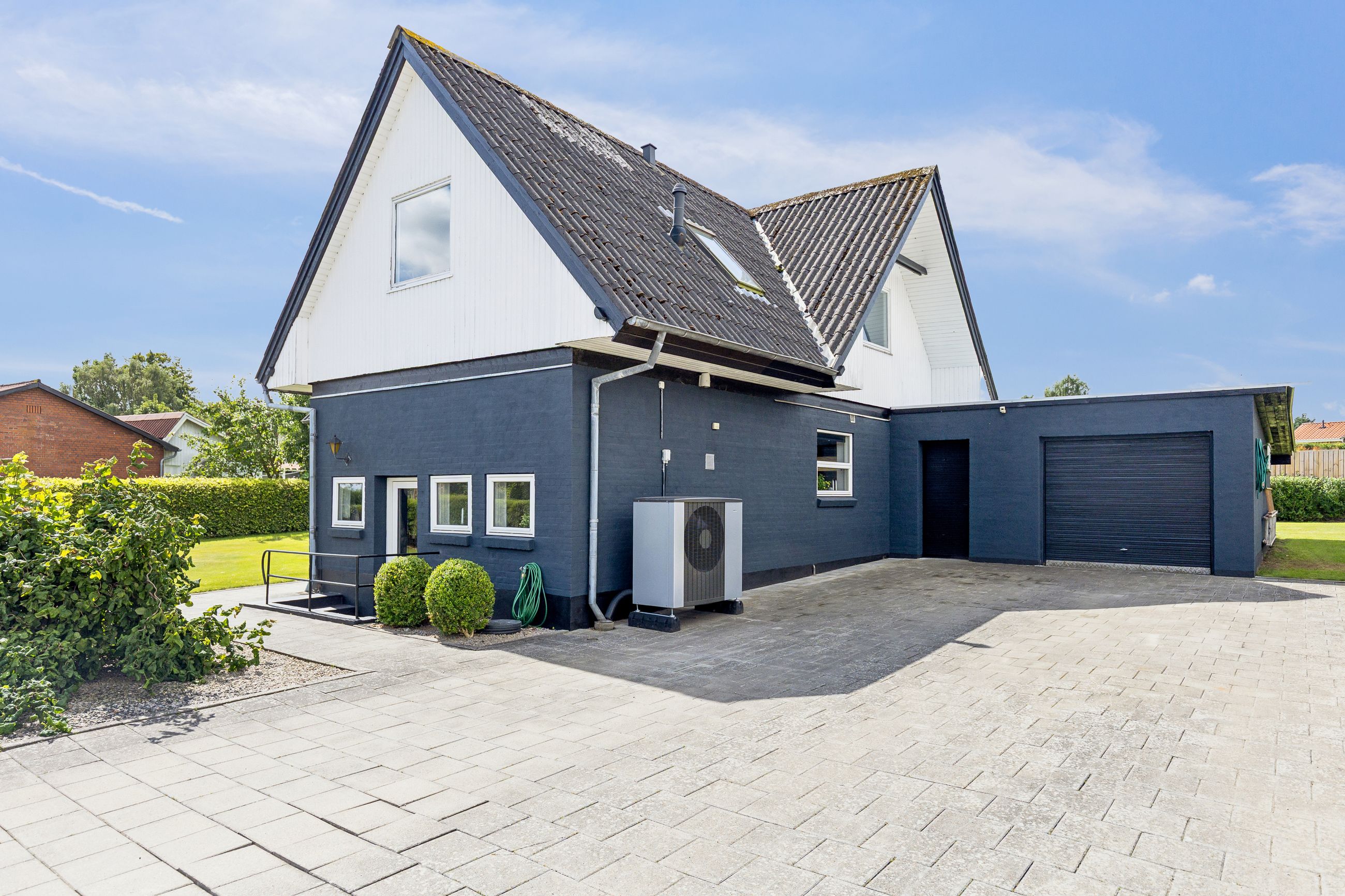Udenfor finder du en nem have anlagt i græs – let at vedligeholde men samtidig rigelig plads til leg og aktiviteter for børnene. Ejendommen inkluderer også en garage, så bilen kan stå tørt året rundt.