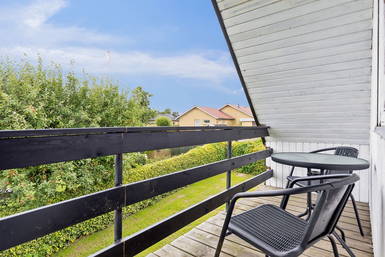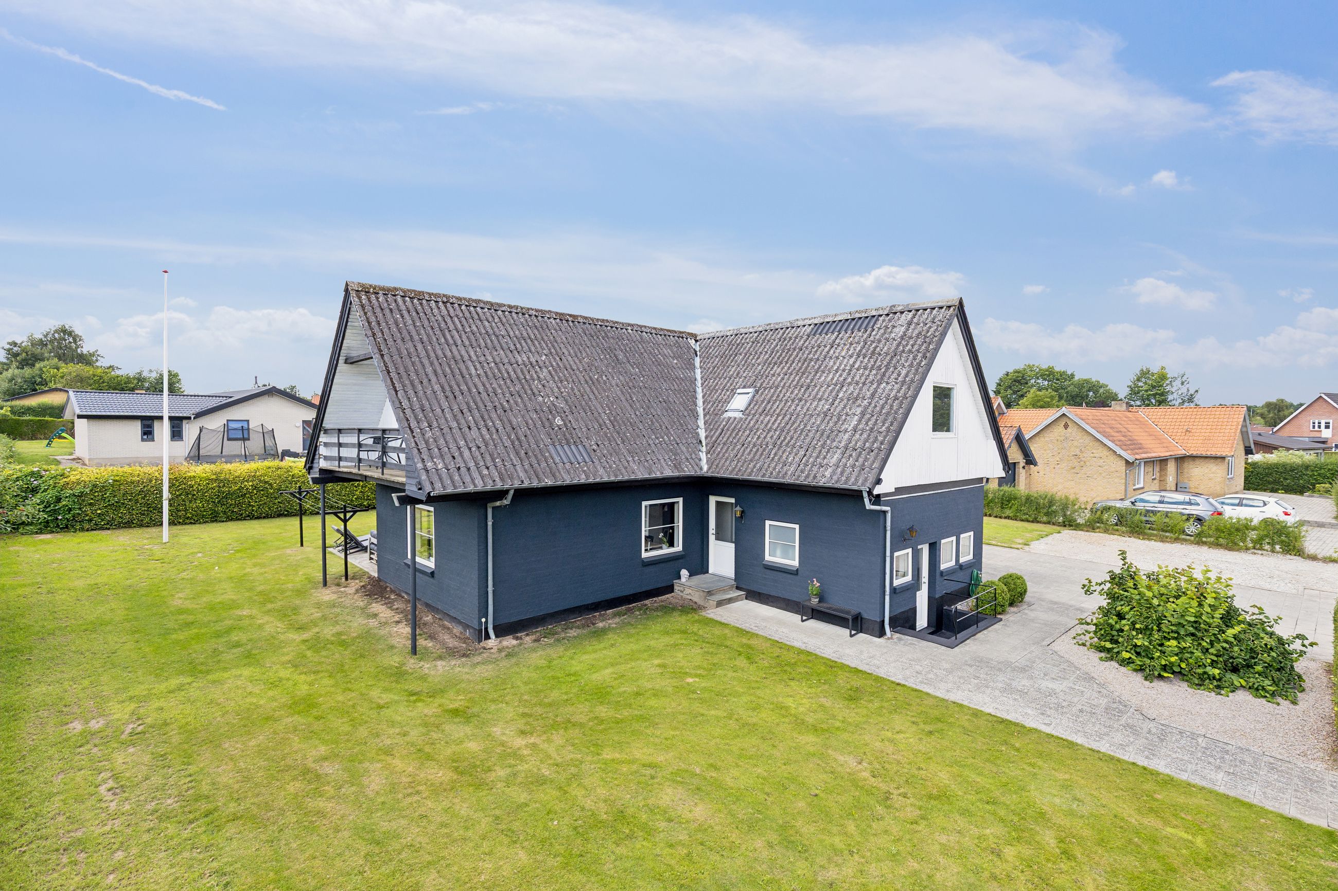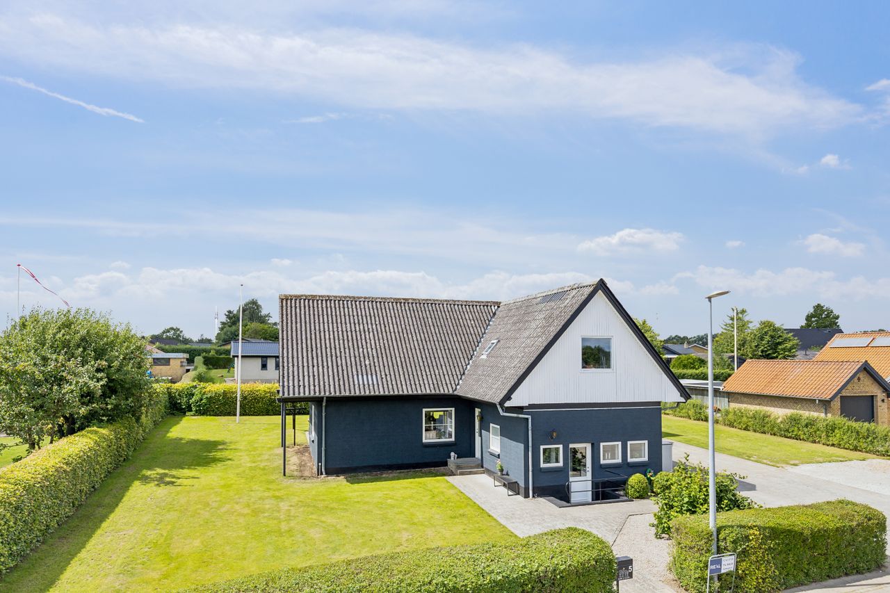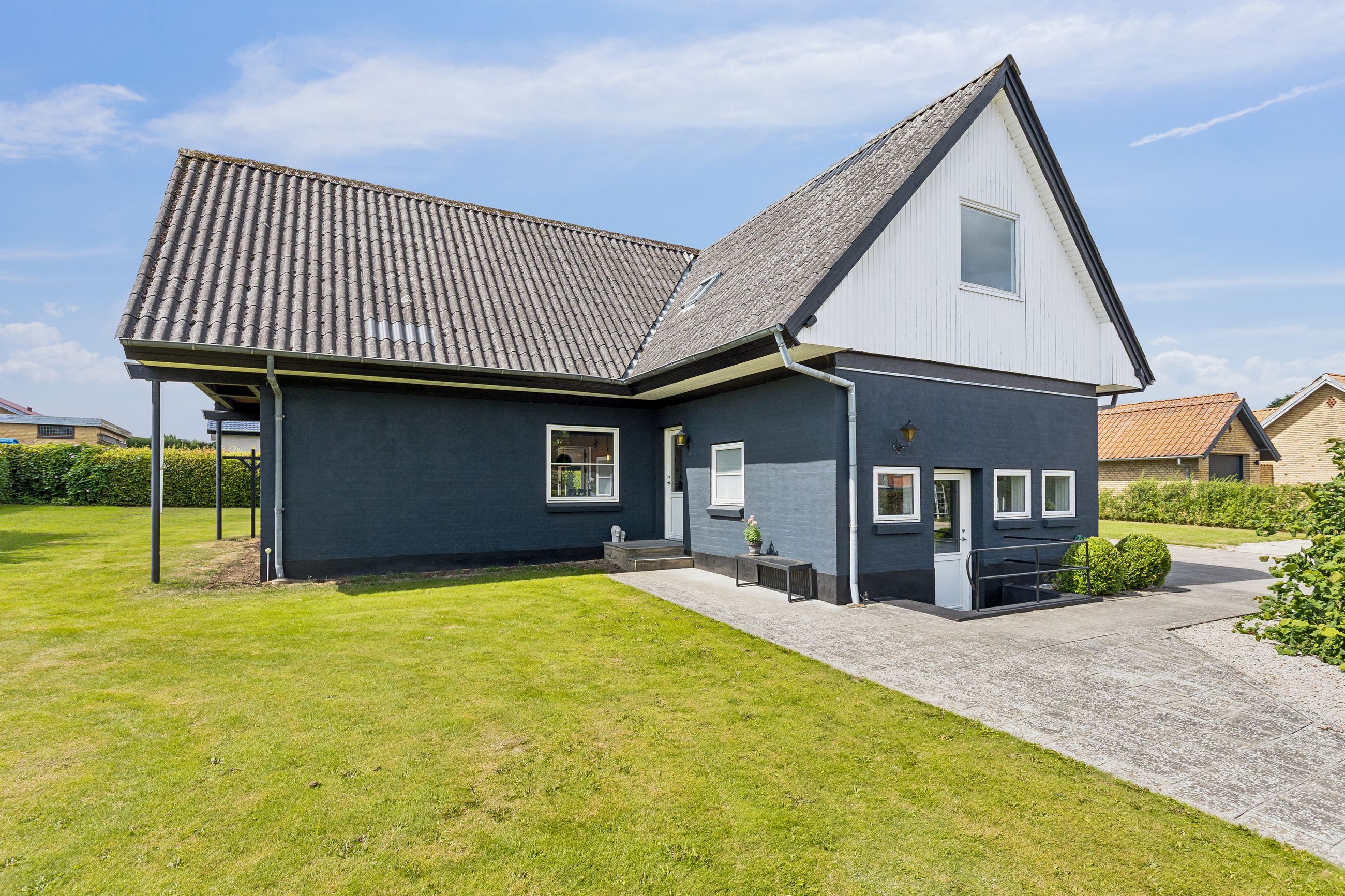 Udenfor finder du en nem have anlagt i græs – let at vedligeholde men samtidig rigelig plads til leg og aktiviteter for børnene. Ejendommen inkluderer også en garage, så bilen kan stå tørt året rundt.