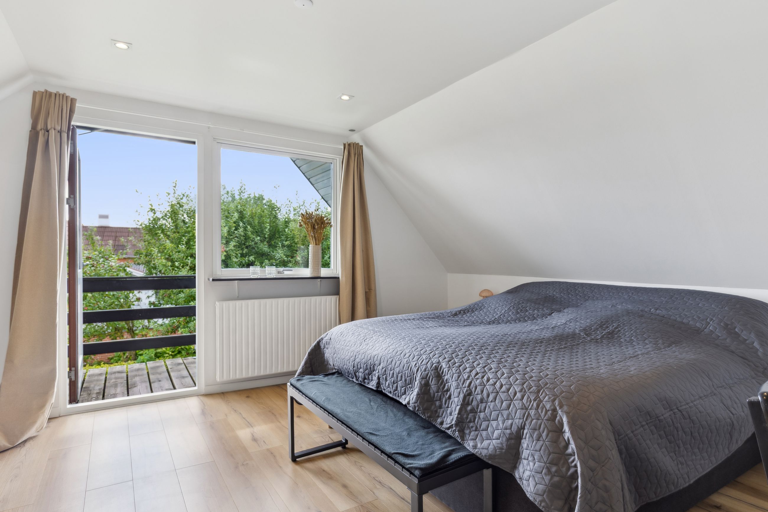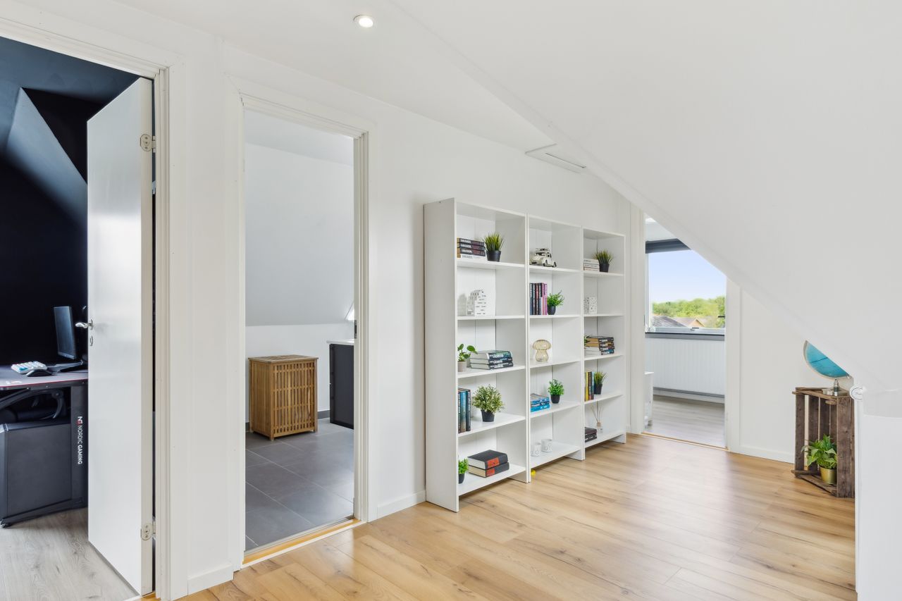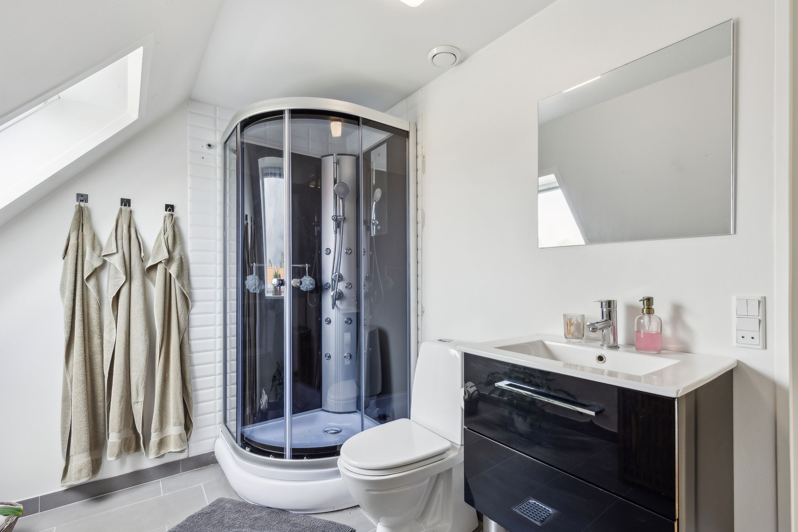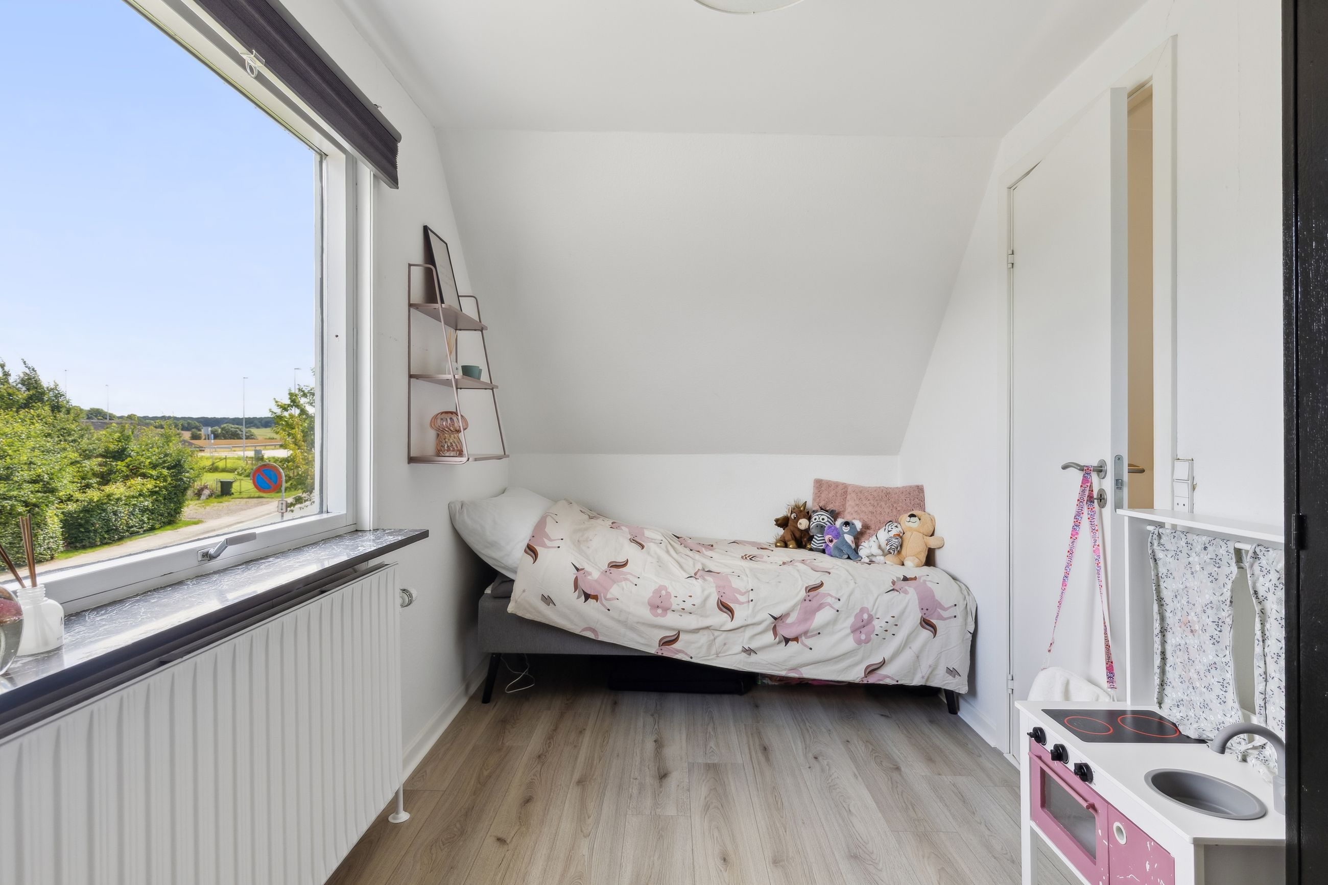 På første sal venter et stort forældre soveværelse med egen udgang til en overdækket altan – her kan man trække sig tilbage efter en lang dag og nyde udsigten. Derudover er der tre gode værelser på denne etage, alle velegnede som børneværelser eller kontorpladser alt efter behov. Et ekstra badeværelse med bruseniche sikrer minimal ventetid om morgenen.