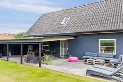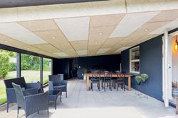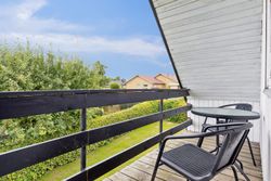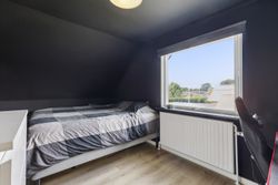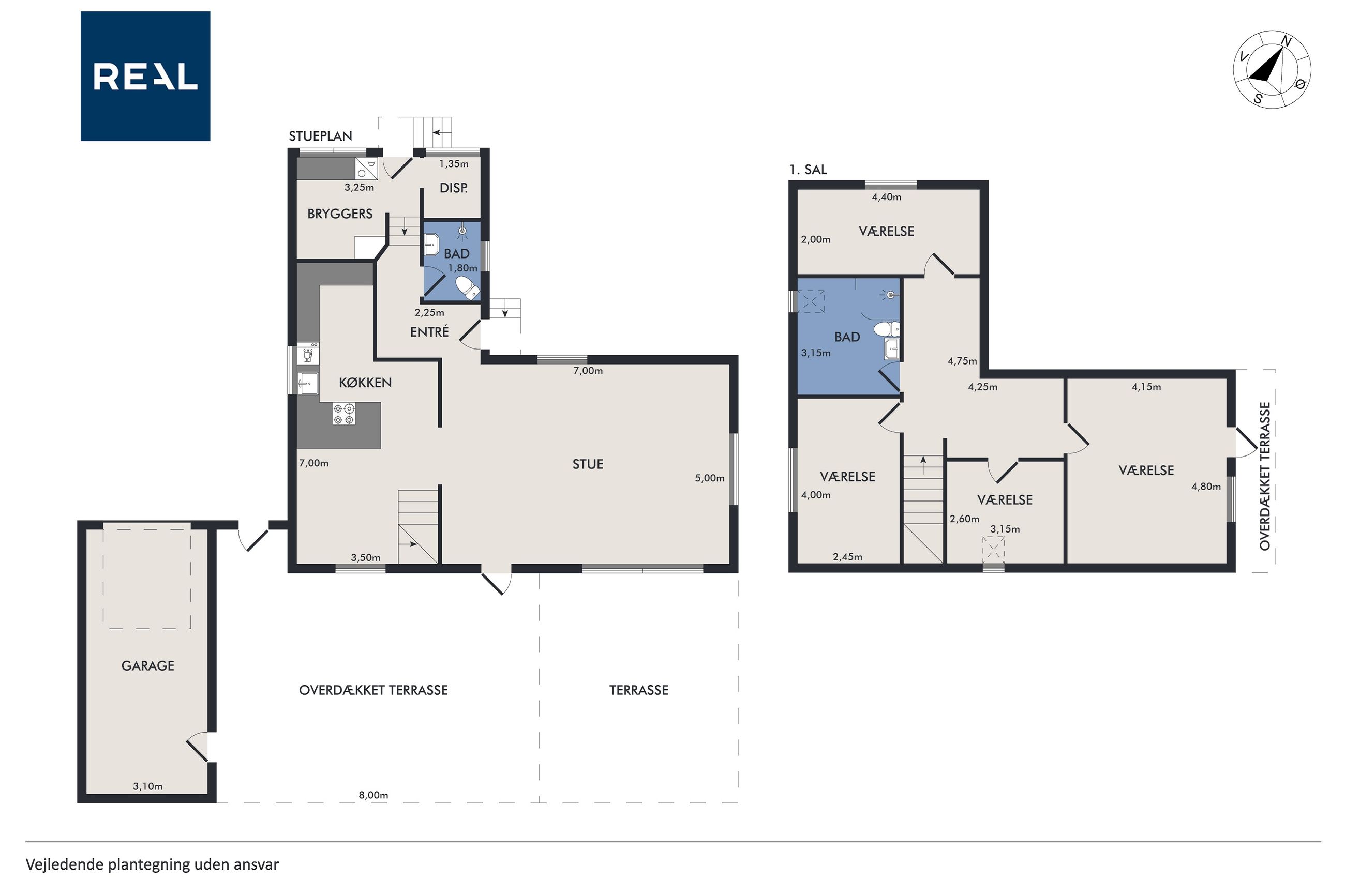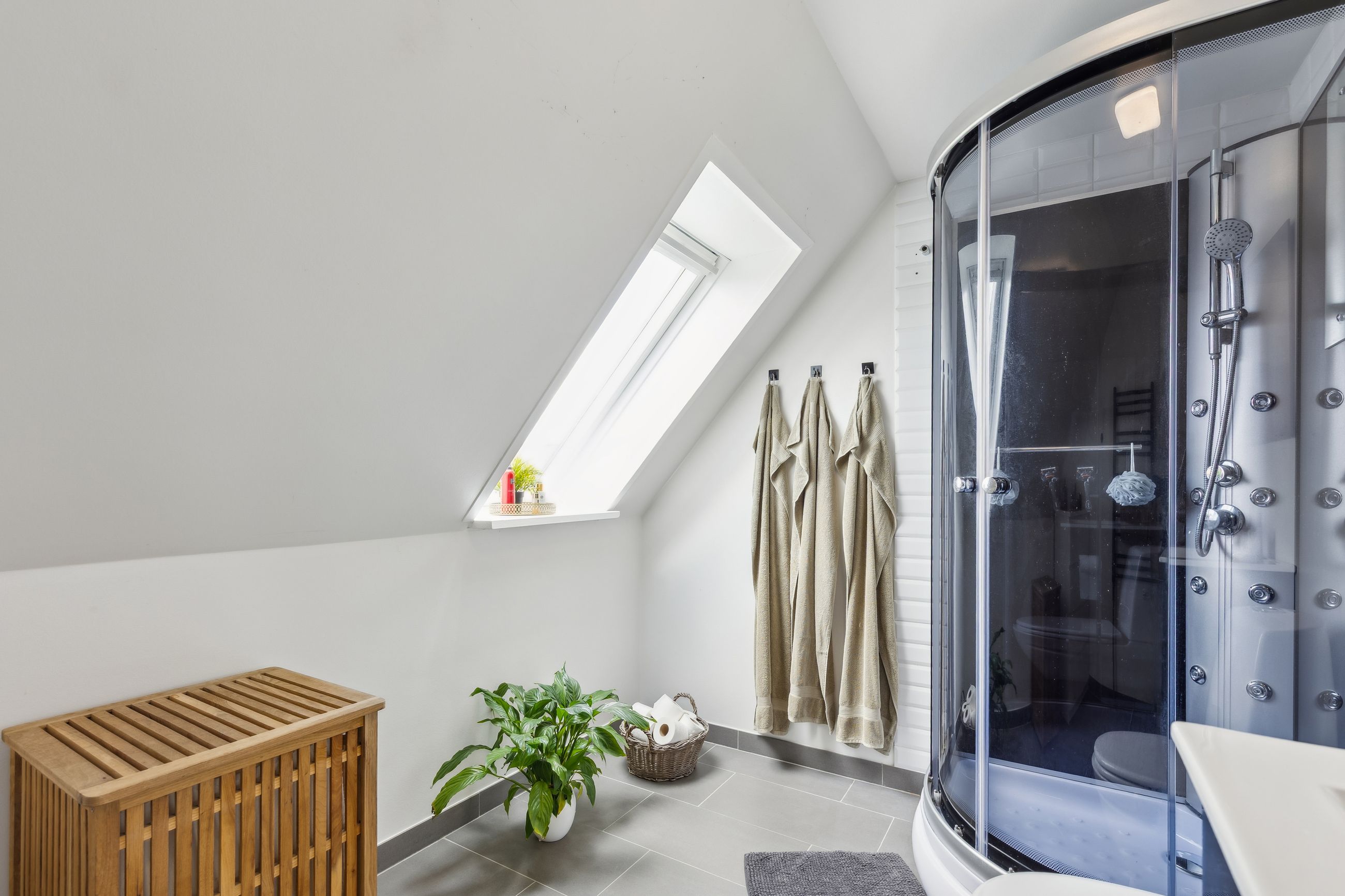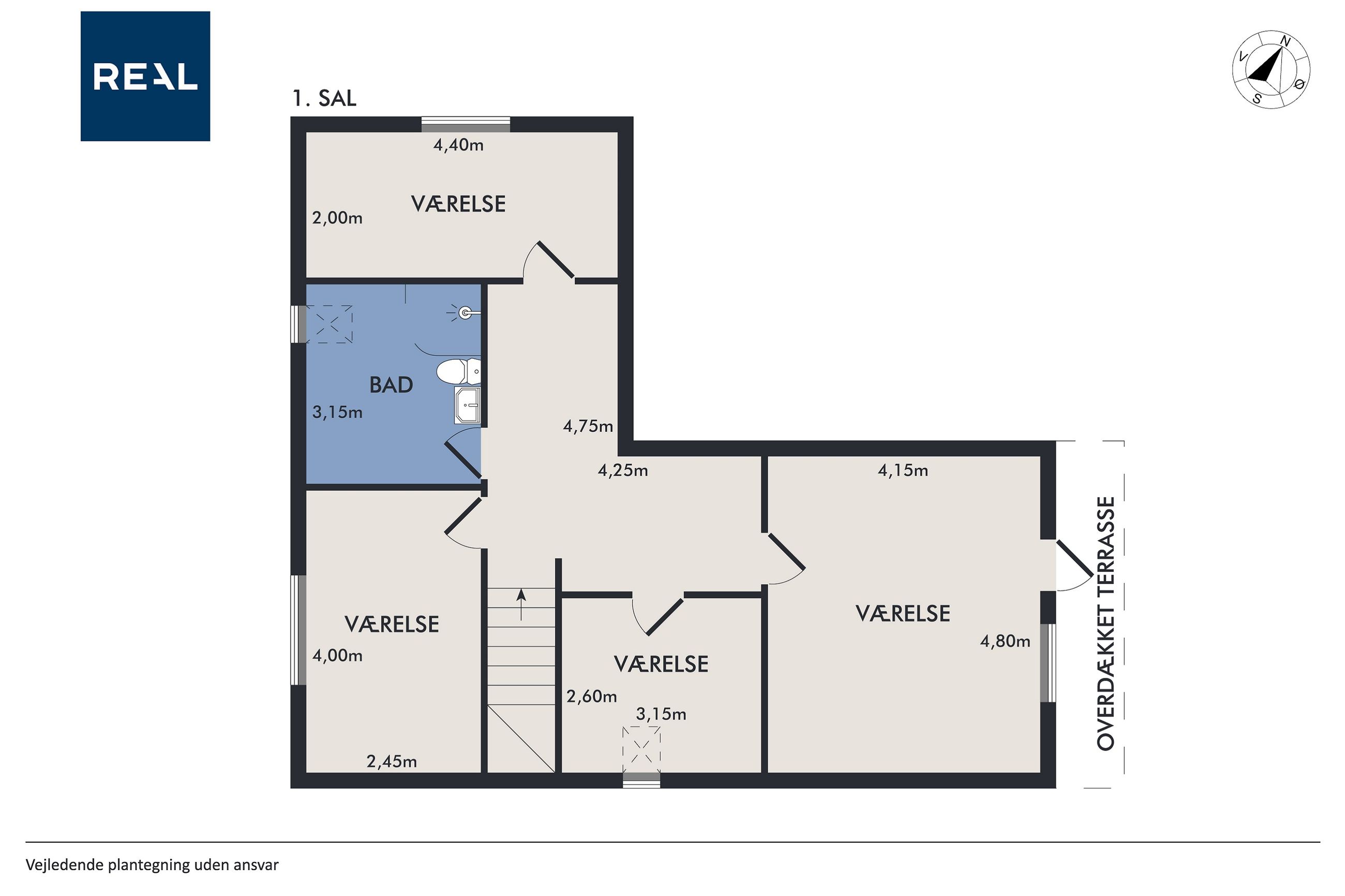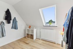 På første sal venter et stort forældre soveværelse med egen udgang til en overdækket altan – her kan man trække sig tilbage efter en lang dag og nyde udsigten. Derudover er der tre gode værelser på denne etage, alle velegnede som børneværelser eller kontorpladser alt efter behov. Et ekstra badeværelse med bruseniche sikrer minimal ventetid om morgenen.
