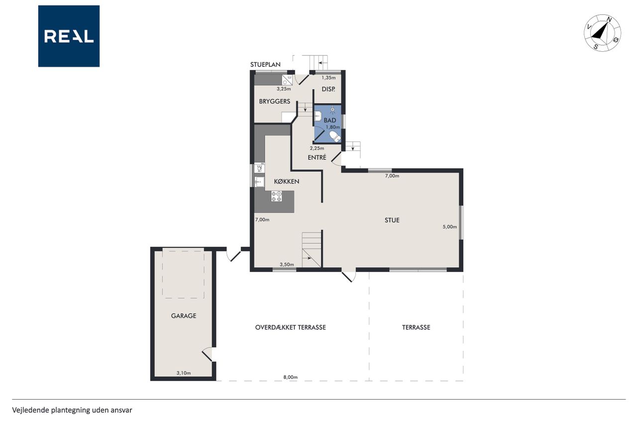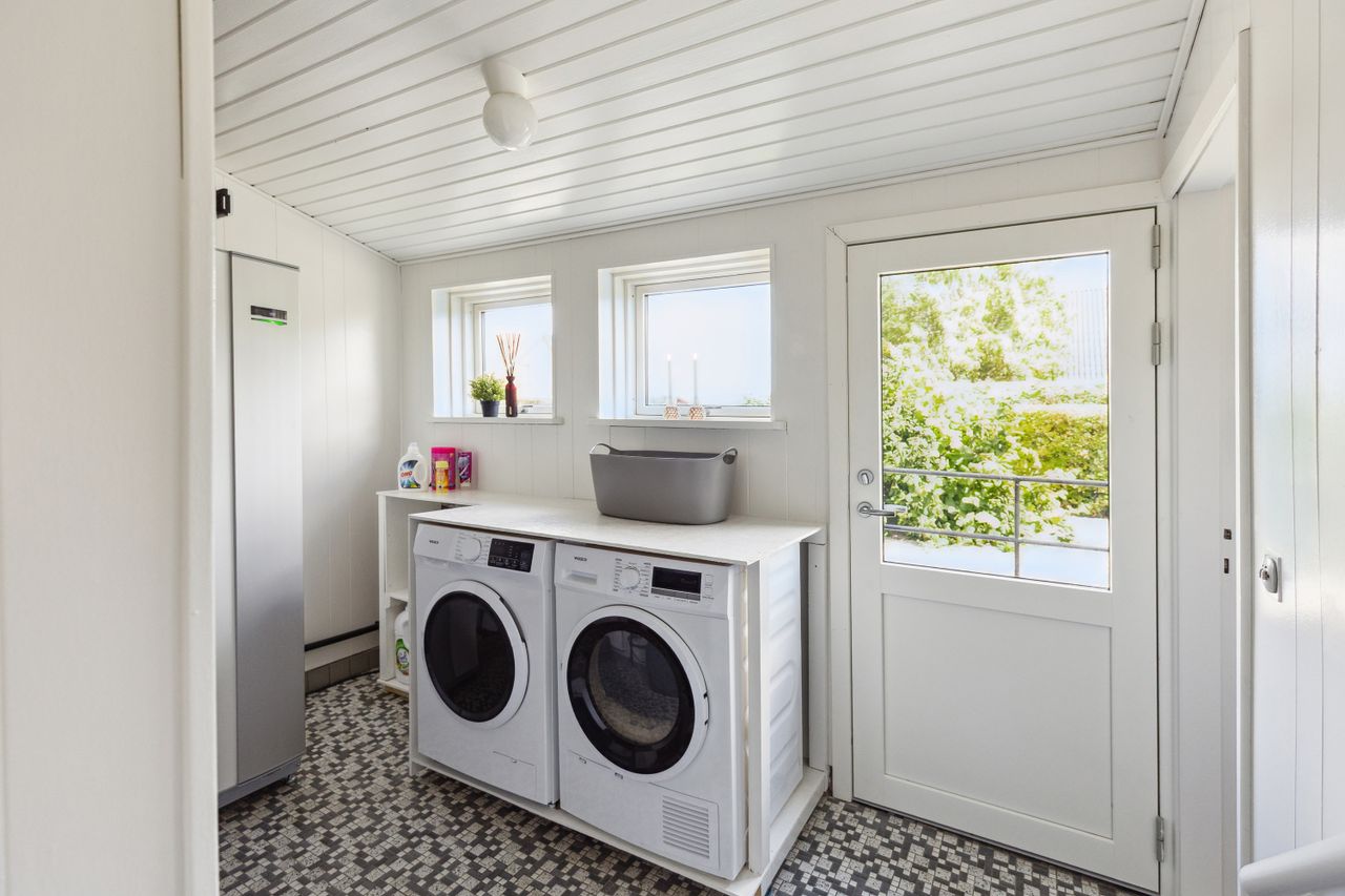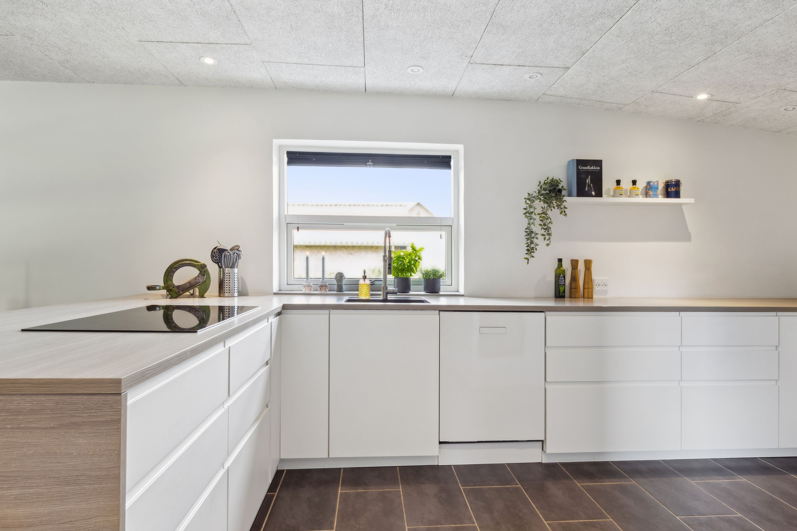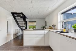 Køkkenet ligger i åben forbindelse med en stor stue, fra er der direkte udgang til en dejlig terrasse – det perfekte sted at nyde morgenkaffen eller lange sommeraftener med venner og familie. I stueplan finder du også et badeværelse samt et bryggers med god opbevaringsplads.