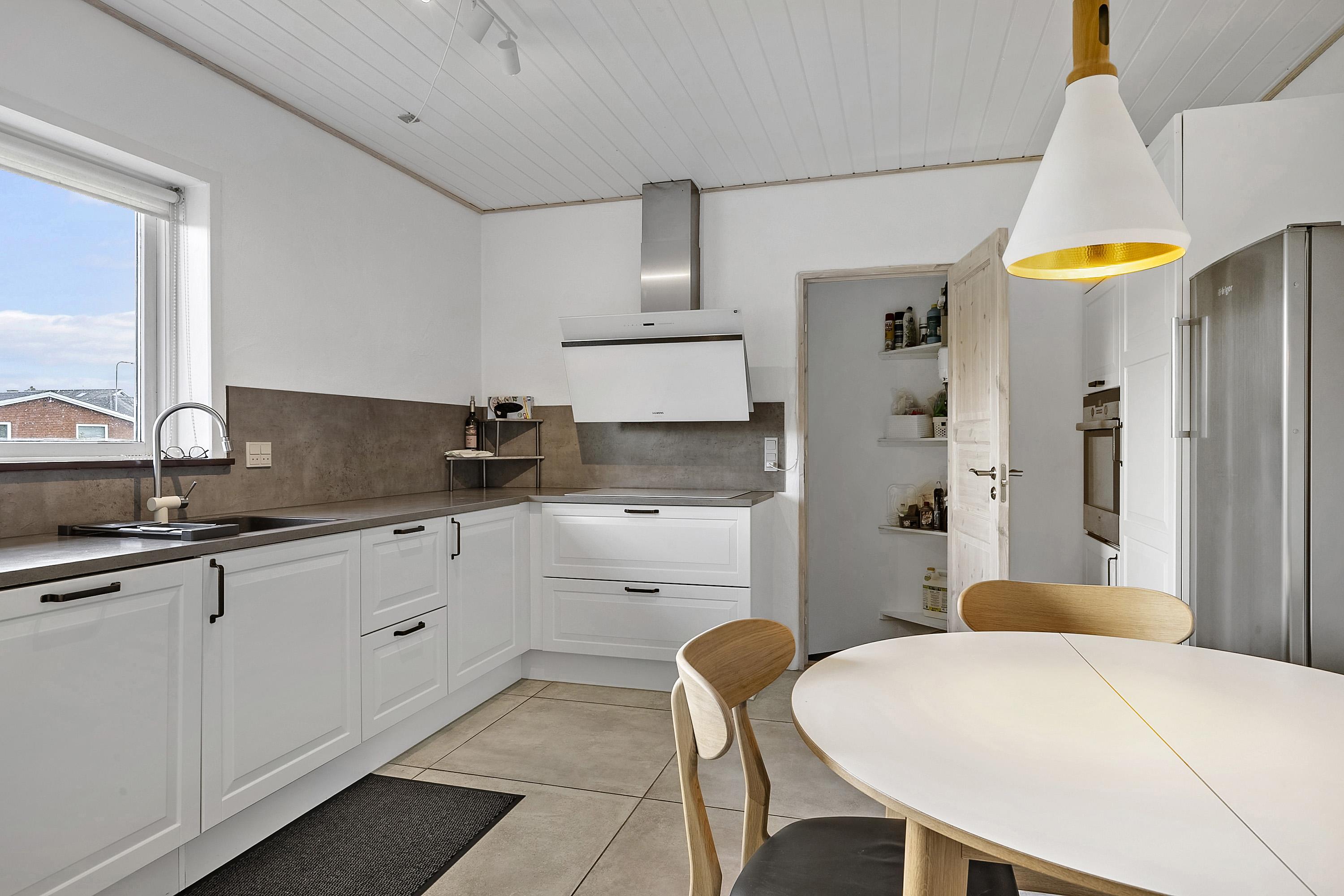 Det nyrenoverede køkken fremstår lyst og stilrent med store