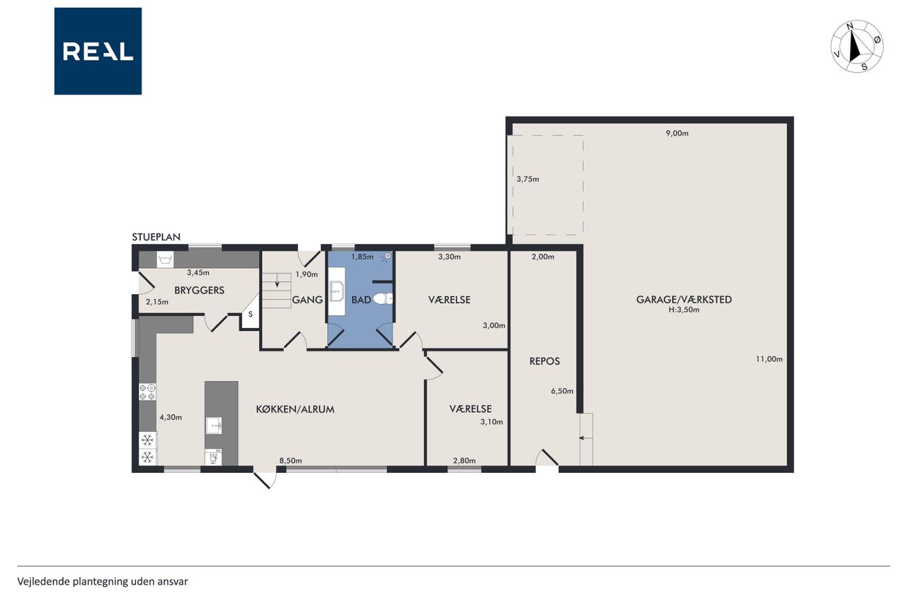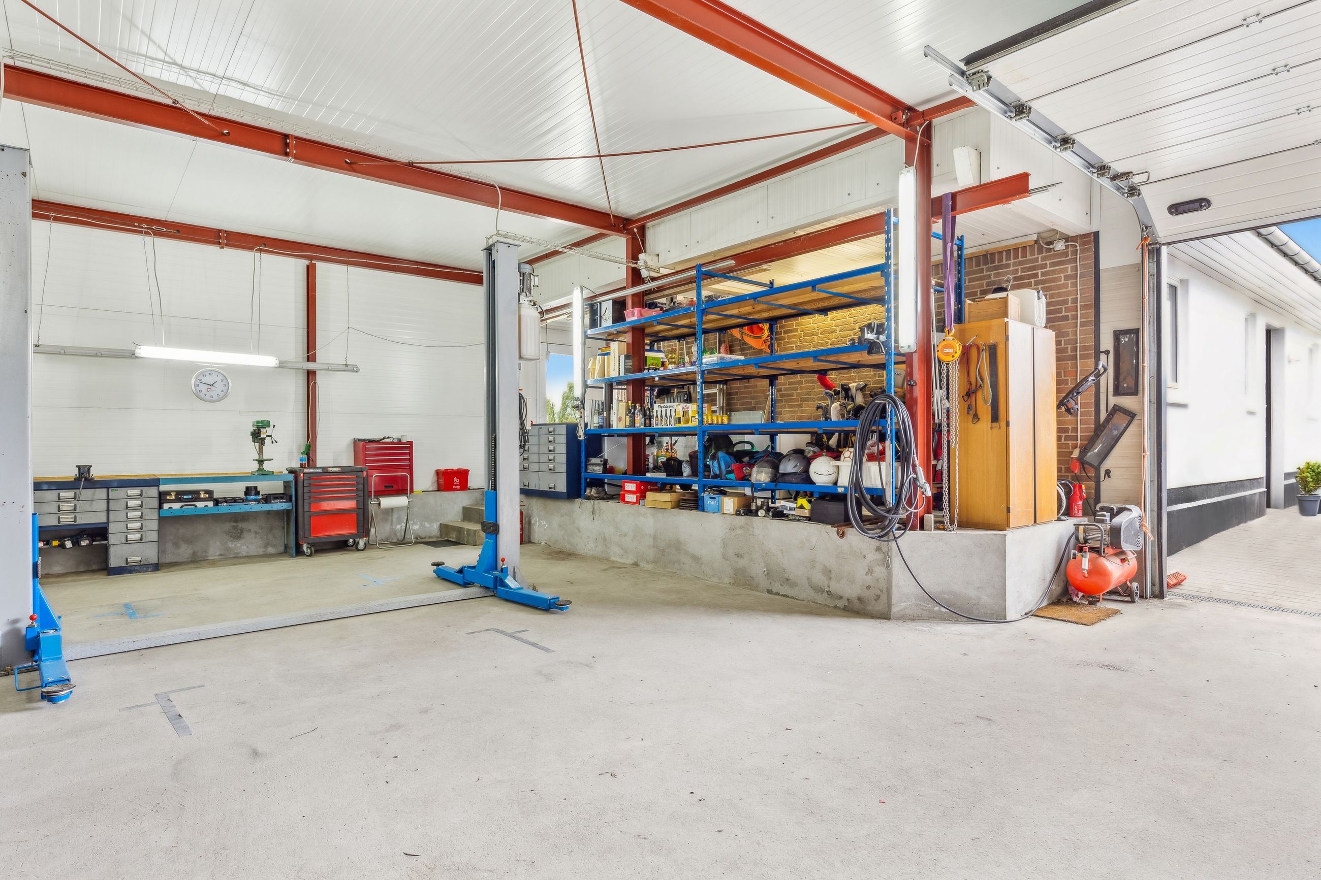 Til ejendommen hører også en ekstraordinær garage med højt til loftet. Her er der rigeligt med plads til både værksted, opbevaring og eventuelt en lift til bilen – en drøm for både gør-det-selv-folk og bilentusiaster.