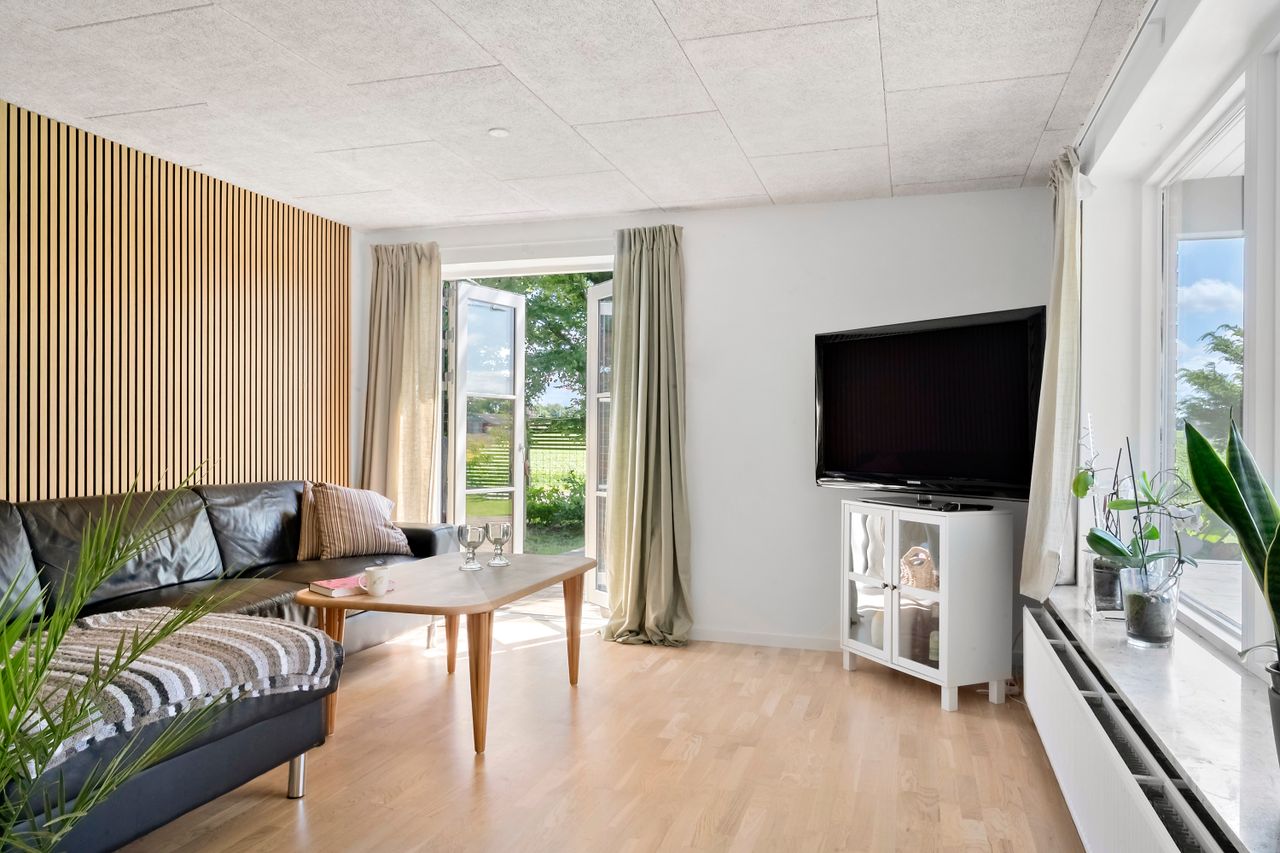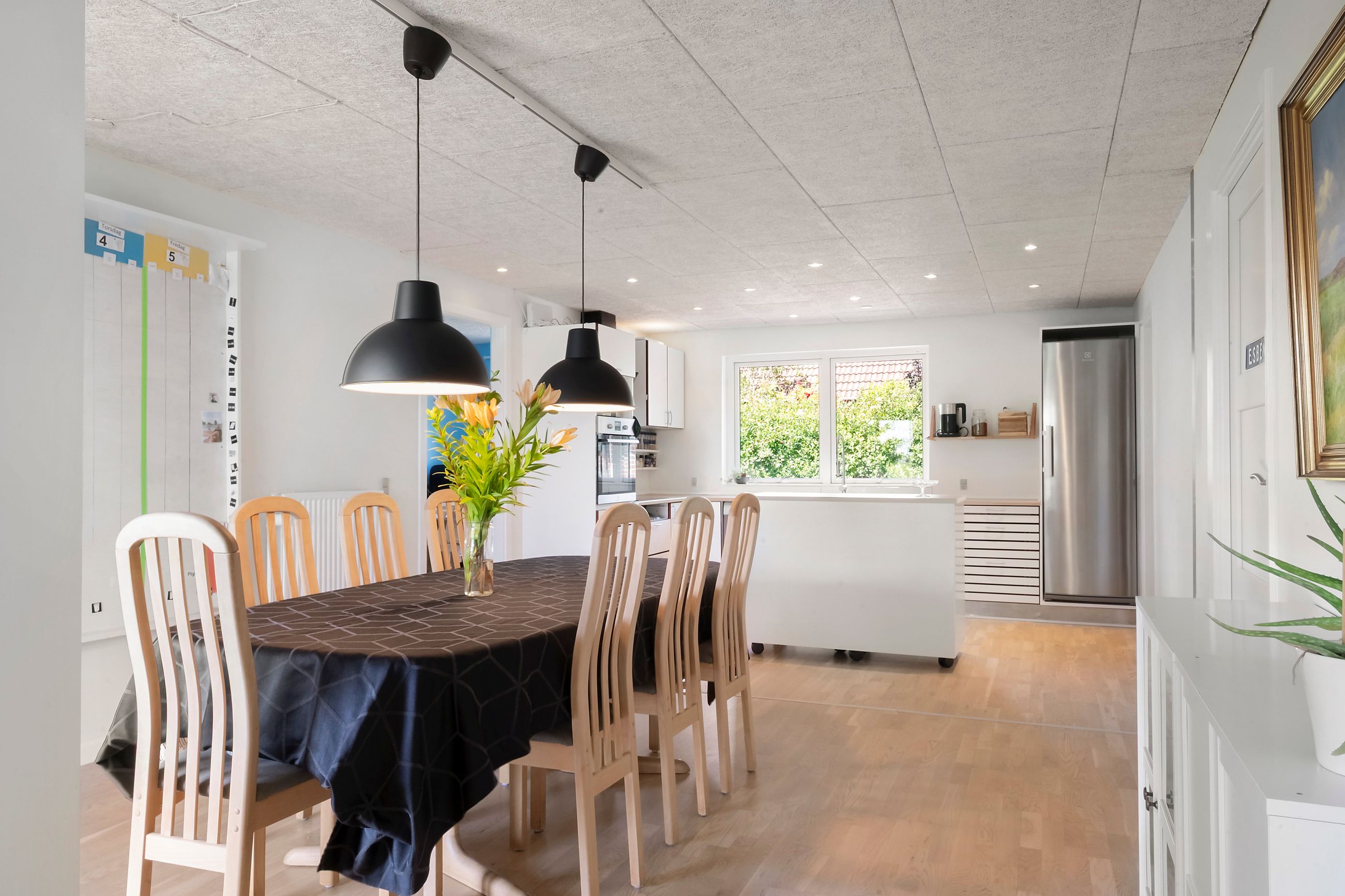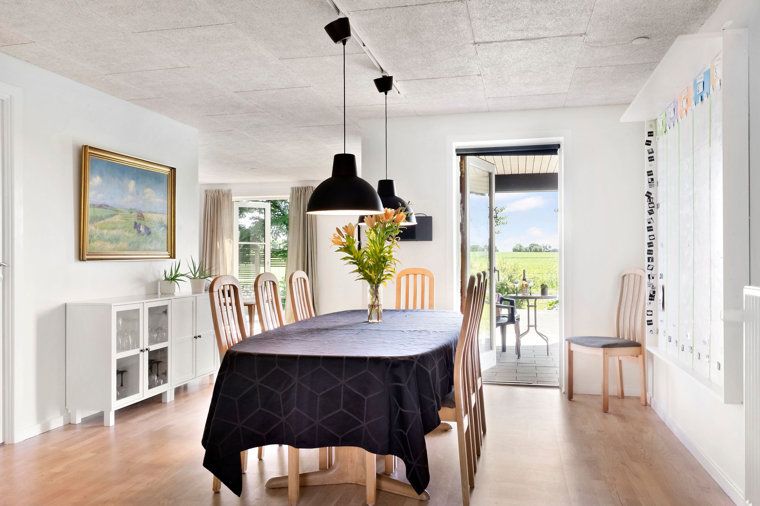 Husets hjerte er det store, lyse køkken-alrum med køkkenø og rigelig bordplads, der inviterer til madlavning og nærvær. Herfra er der direkte udgang til den sydvendte terrasse med overdækning hvor man kan sidde og nyde udsigten til haven og markerne – forestil dig morgenkaffen her med fuglesang og kig til de åbne vidder. Stuen er hyggelig og lys med store vinduer og dør ud til den store sydvendte terrasse, hvor der er plads til både spisemiljø og loungemøbler, så du kan nyde de lange sommeraftener i fredelige omgivelser.