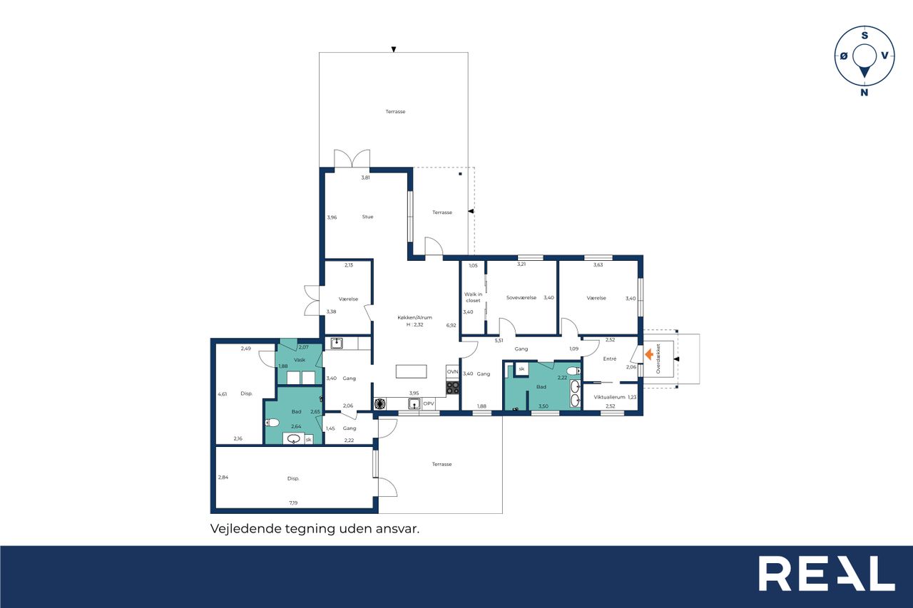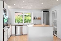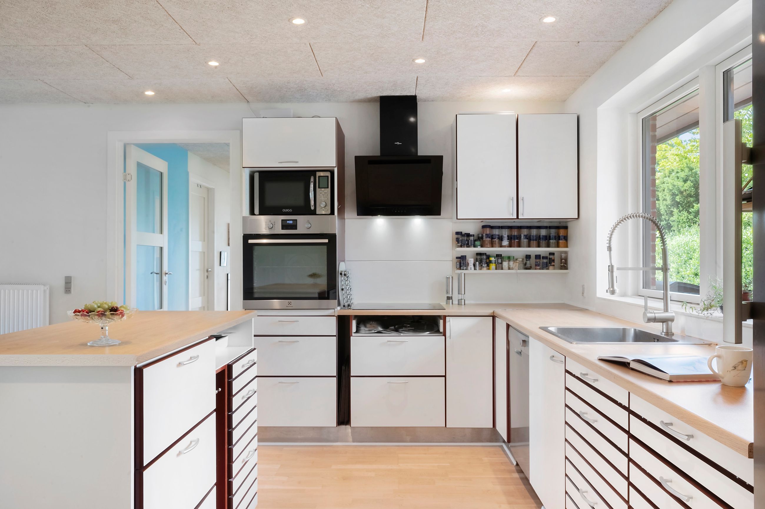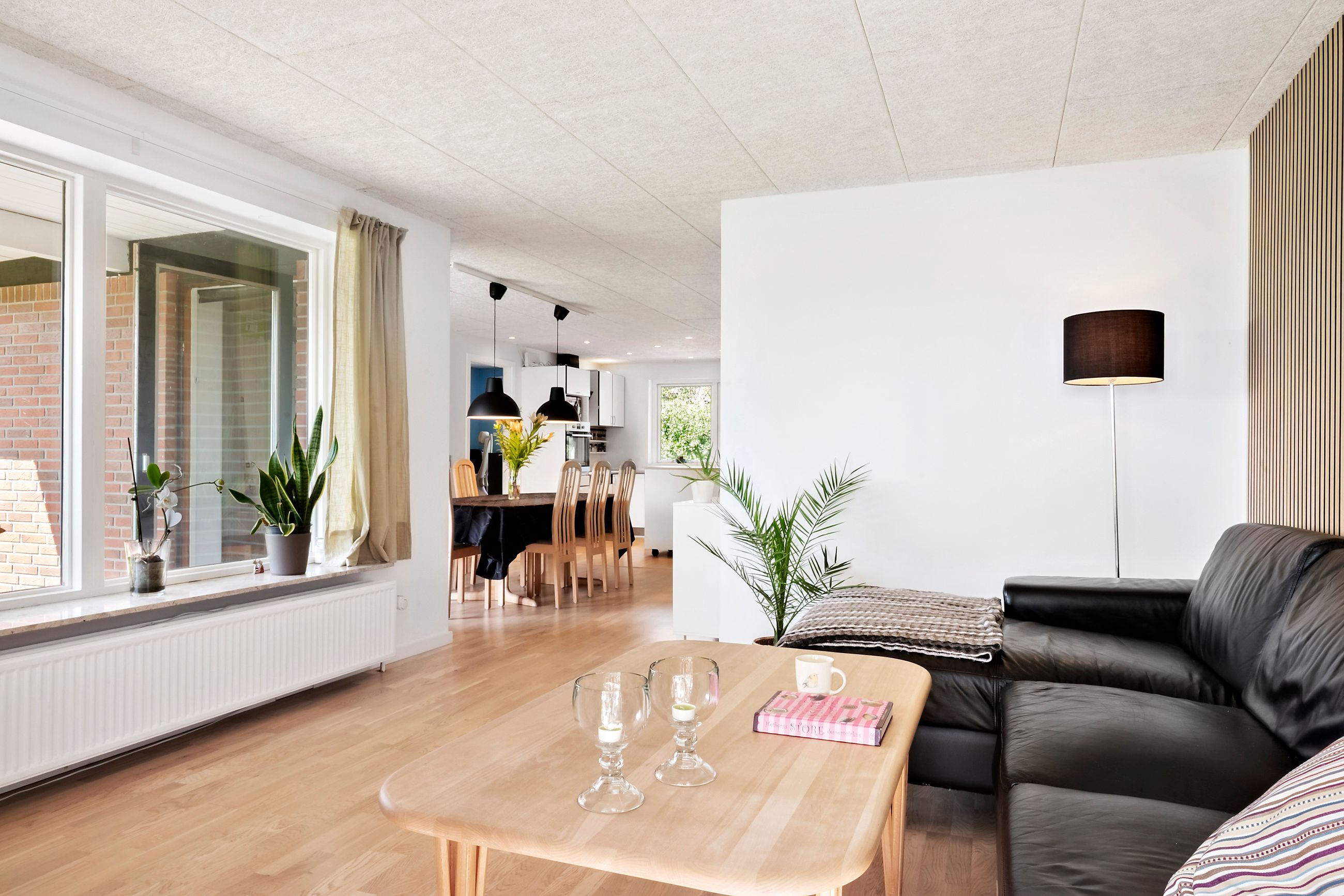 Husets hjerte er det store, lyse køkken-alrum med køkkenø og rigelig bordplads, der inviterer til madlavning og nærvær. Herfra er der direkte udgang til den sydvendte terrasse med overdækning hvor man kan sidde og nyde udsigten til haven og markerne – forestil dig morgenkaffen her med fuglesang og kig til de åbne vidder. Stuen er hyggelig og lys med store vinduer og dør ud til den store sydvendte terrasse, hvor der er plads til både spisemiljø og loungemøbler, så du kan nyde de lange sommeraftener i fredelige omgivelser.