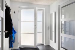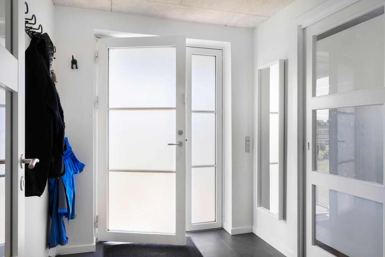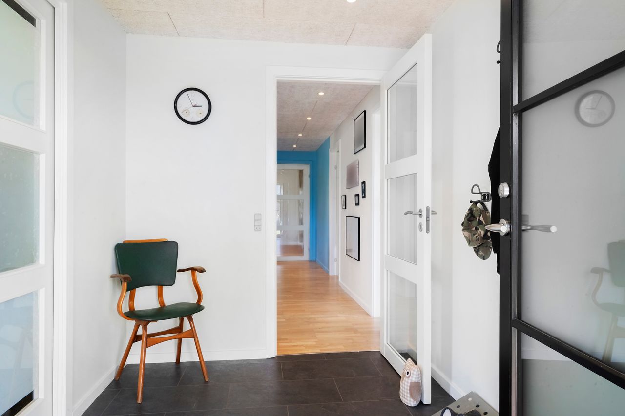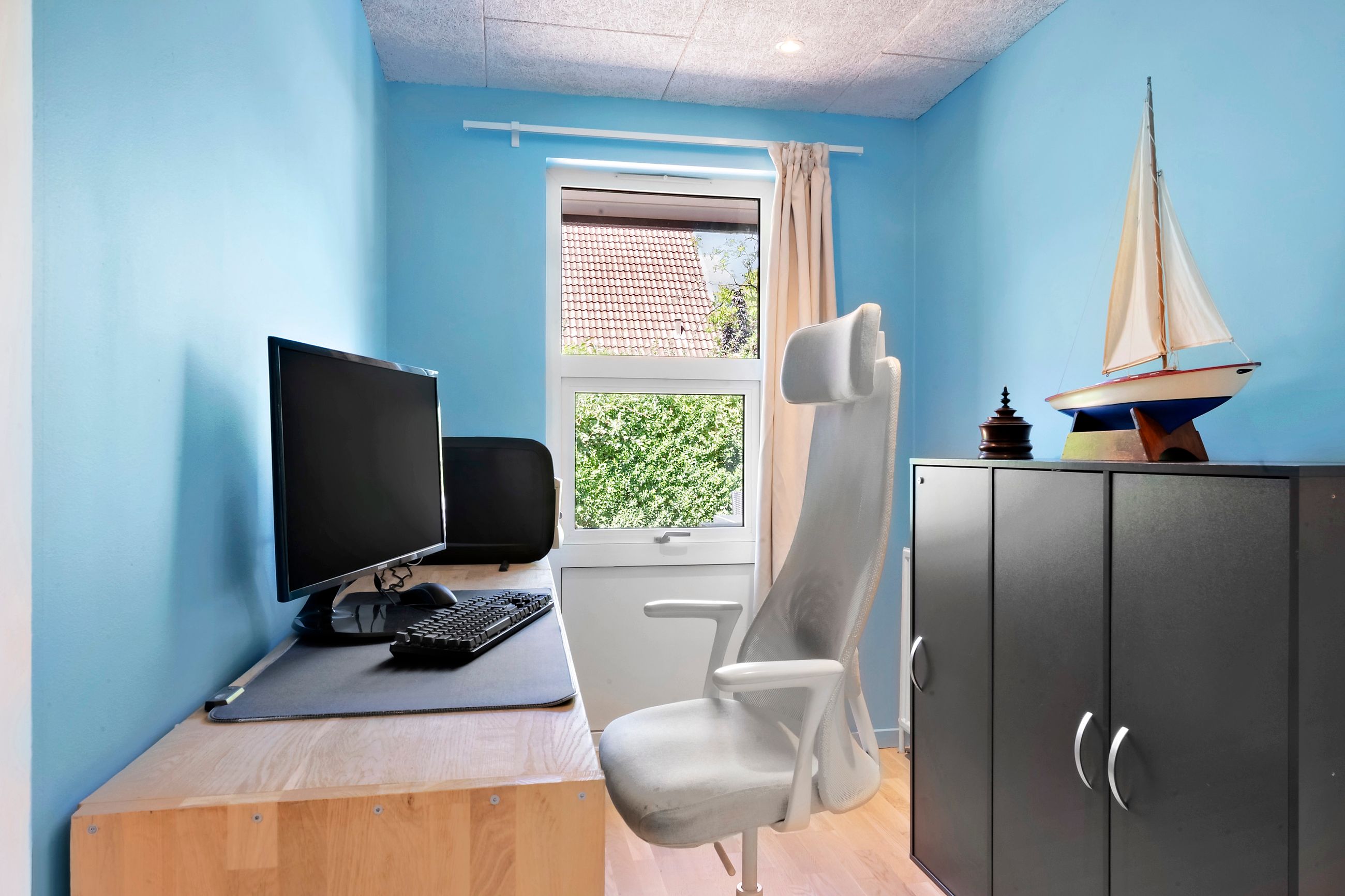 Den tidligere entré er i dag indrettet som et praktisk hjemmekontor med et dejligt lysindfald – perfekt til hjemmearbejde uden at gå på kompromis med roen.
