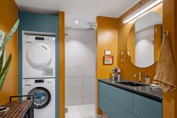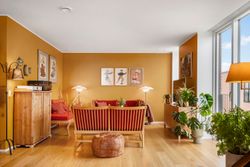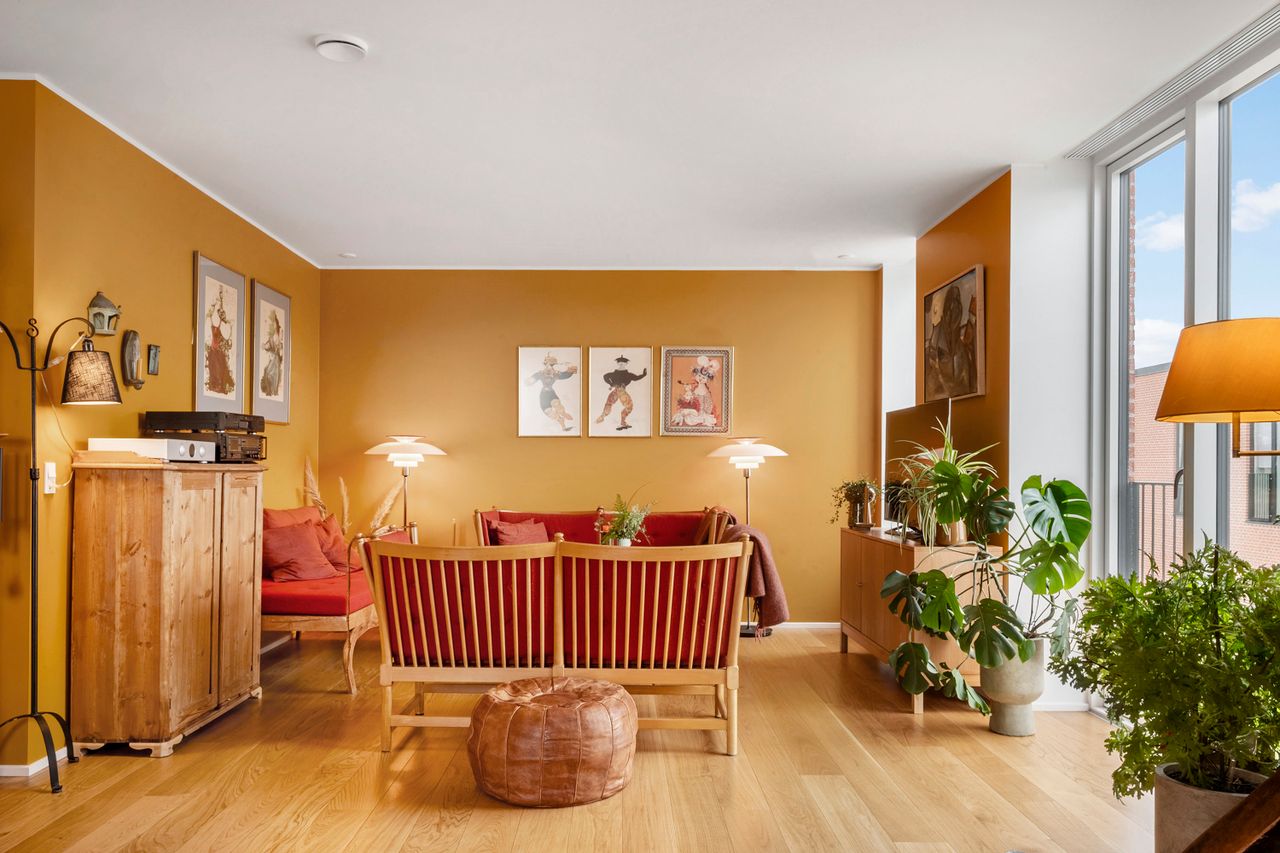 Med sine 134 veludnyttede kvadratmeter byder boligen på både rummelighed og harmoni. Det åbne køkken-alrum skaber en naturlig ramme om hverdagen – her er plads til madlavning, nærvær og samtaler, mens lyset strømmer ind gennem store vinduespartier. De to soveværelser er lyse og indretningsvenlige, og badeværelset er funktionelt og stilrent, med både brus og vaskesøjle, som gør hverdagen nem.