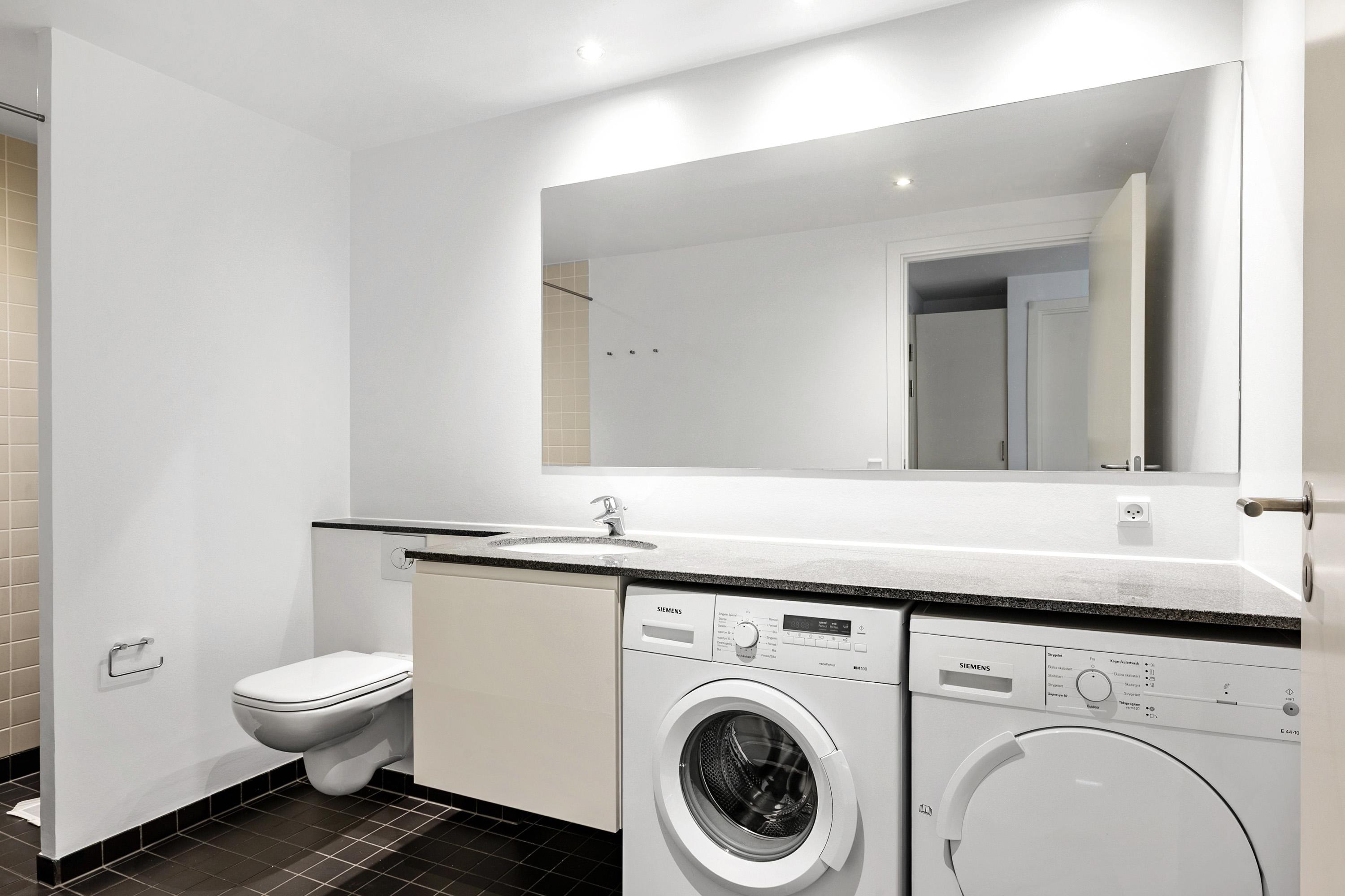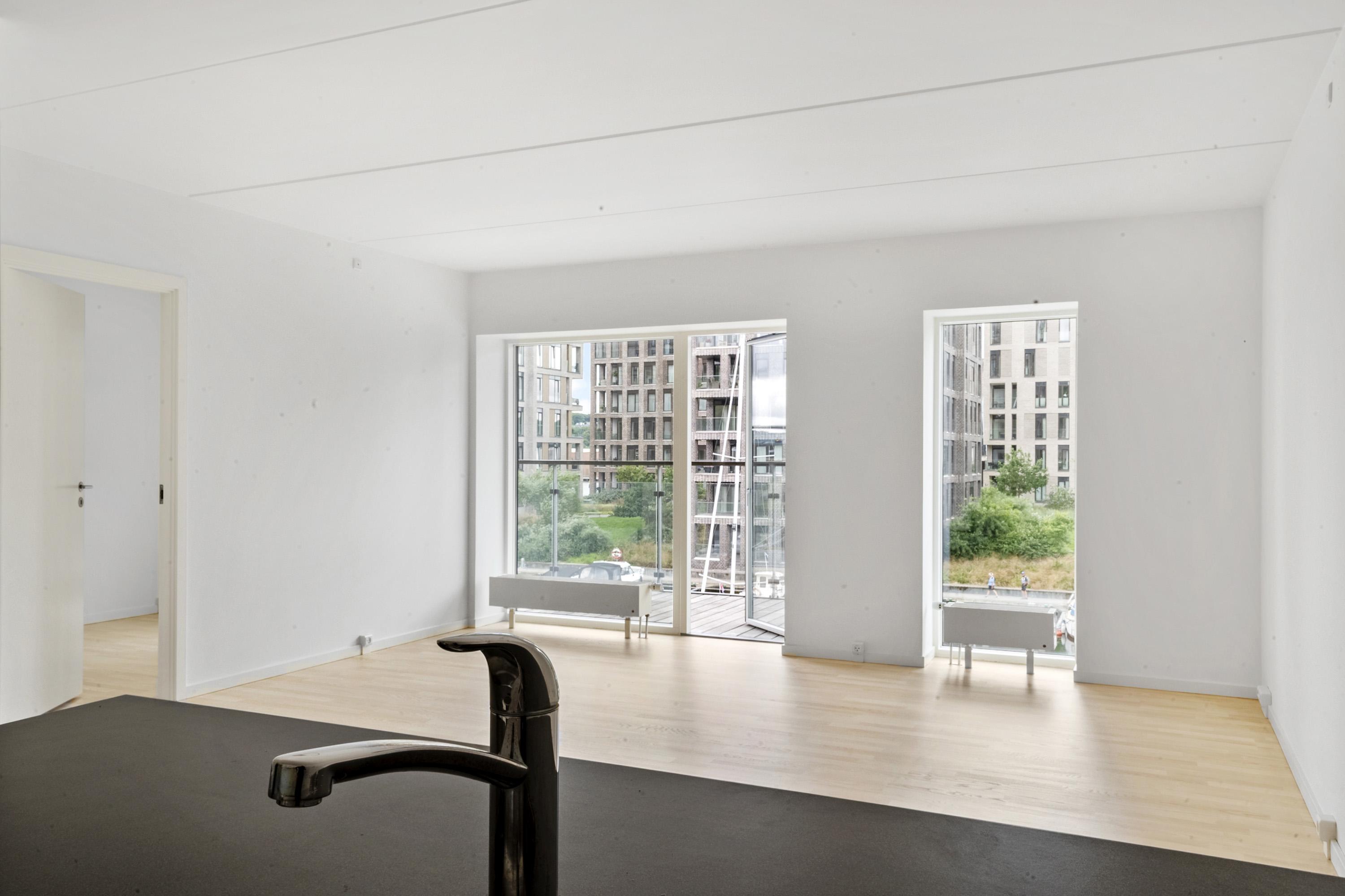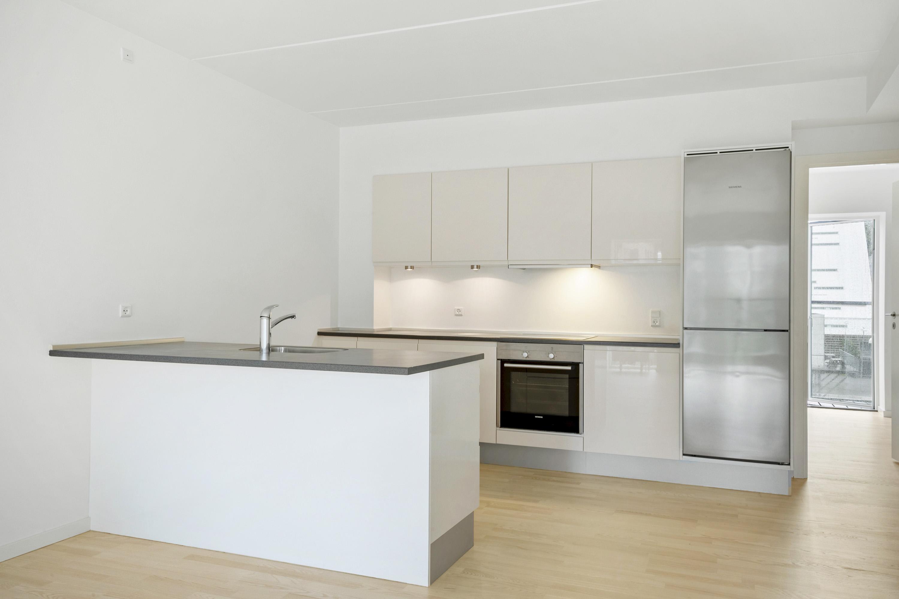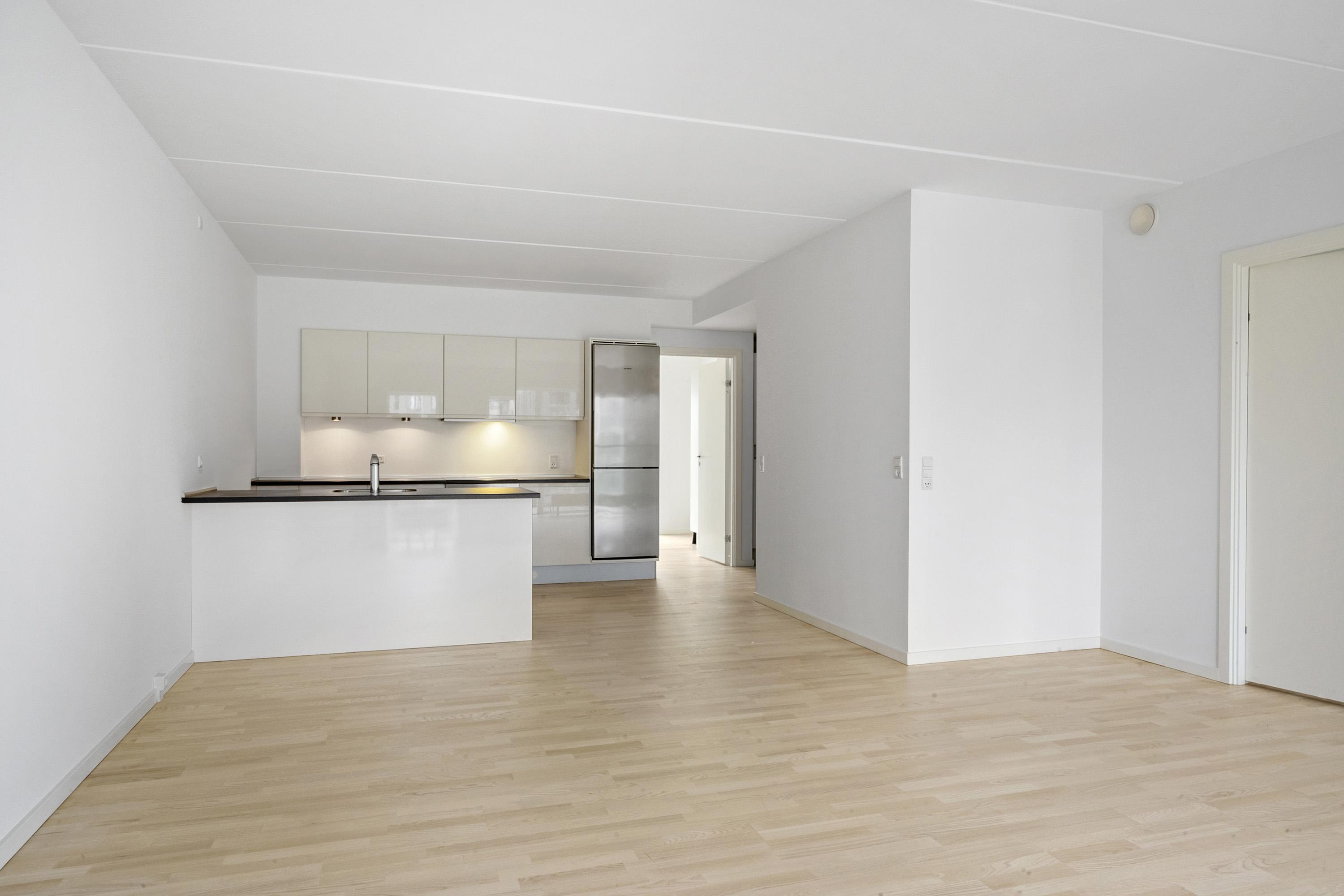 Lejligheden byder på et lyst og indbydende køkken-alrum, hvor køkkenet er åbent og giver plads