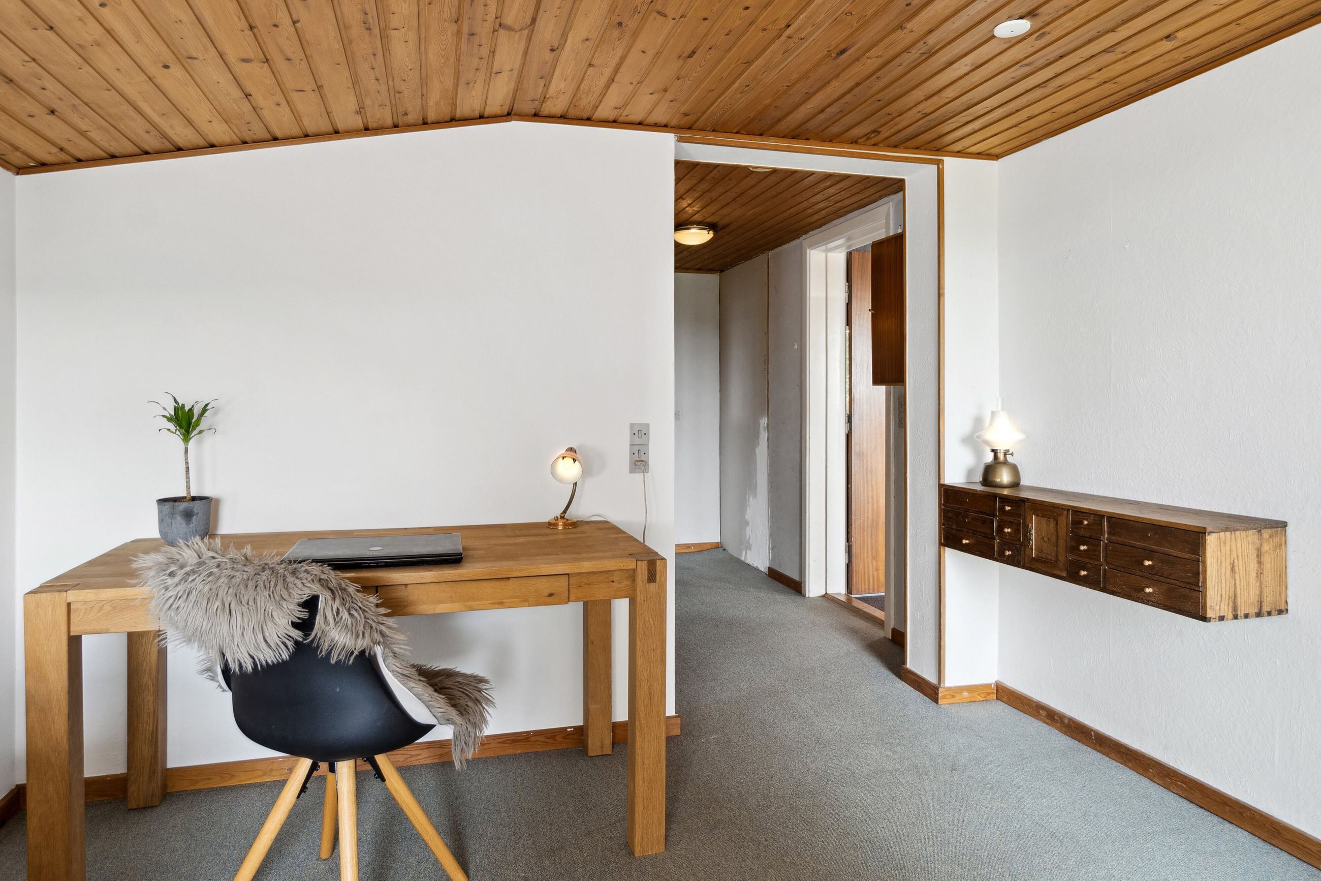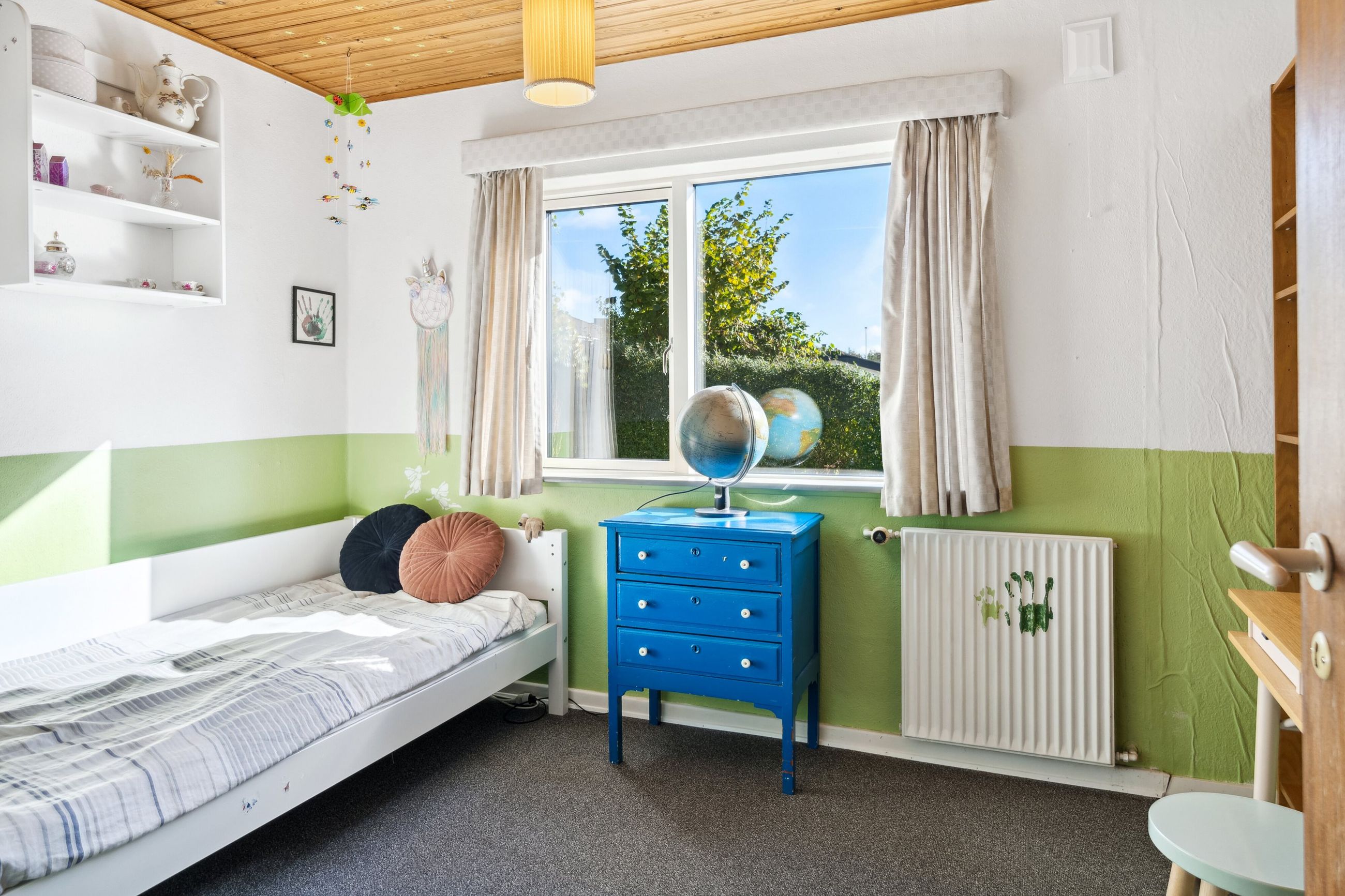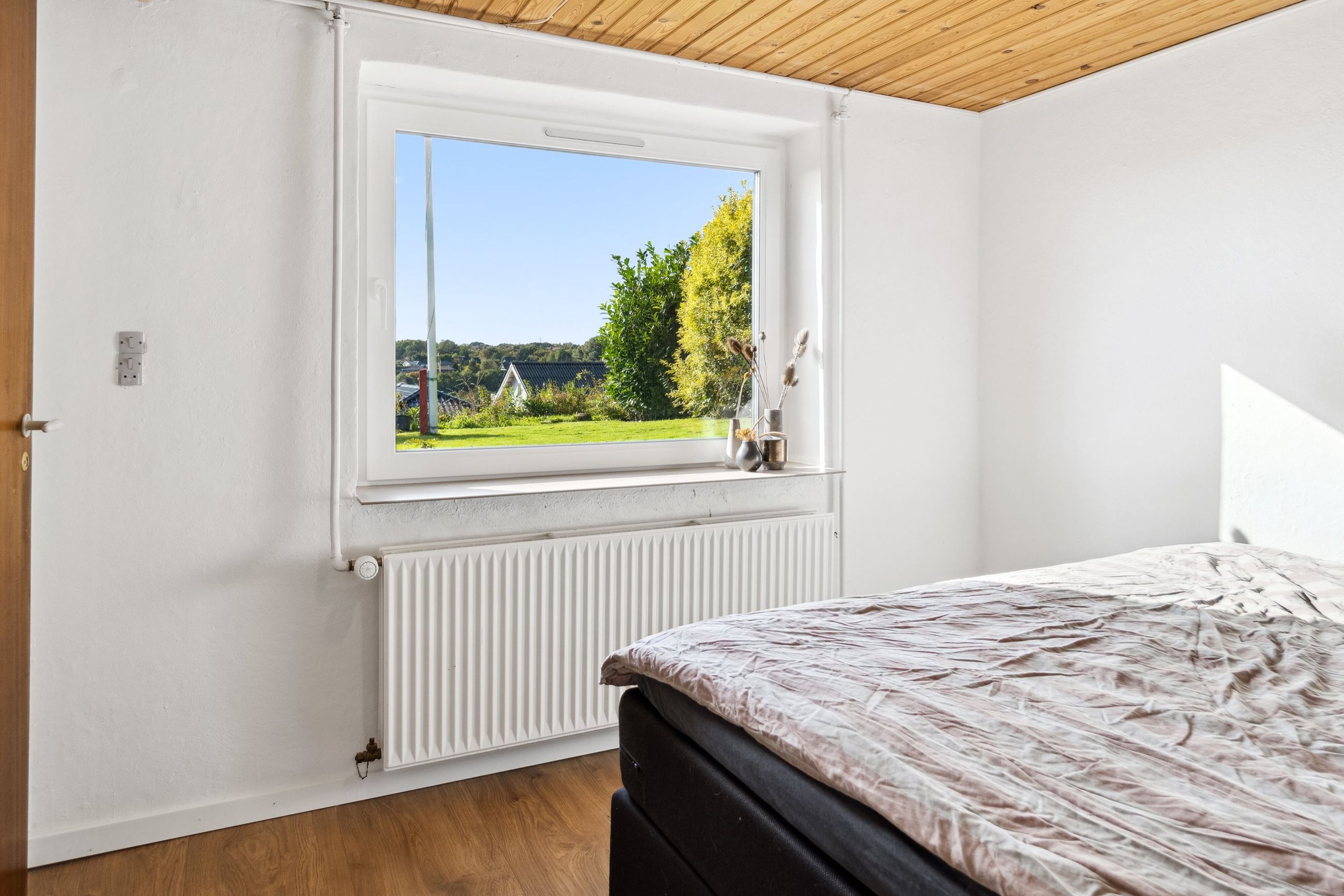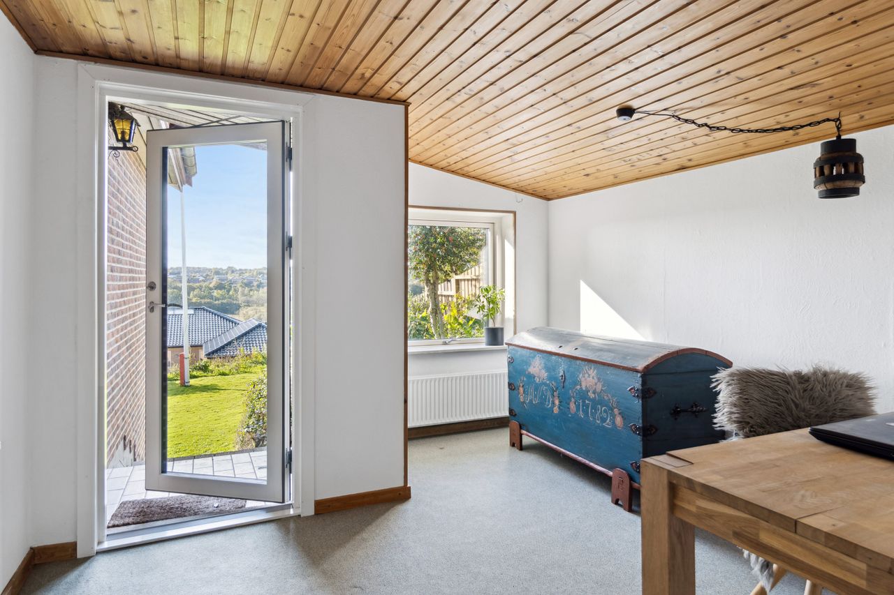 Etagen rummer desuden to gode, regulære værelser – det ene med direkte udgang til haven – samt et ekstra værelse, ideelt til hjemmekontor eller gæsteværelse. Hertil kommer et badeværelse og et praktisk bryggers med god opbevaringsplads.