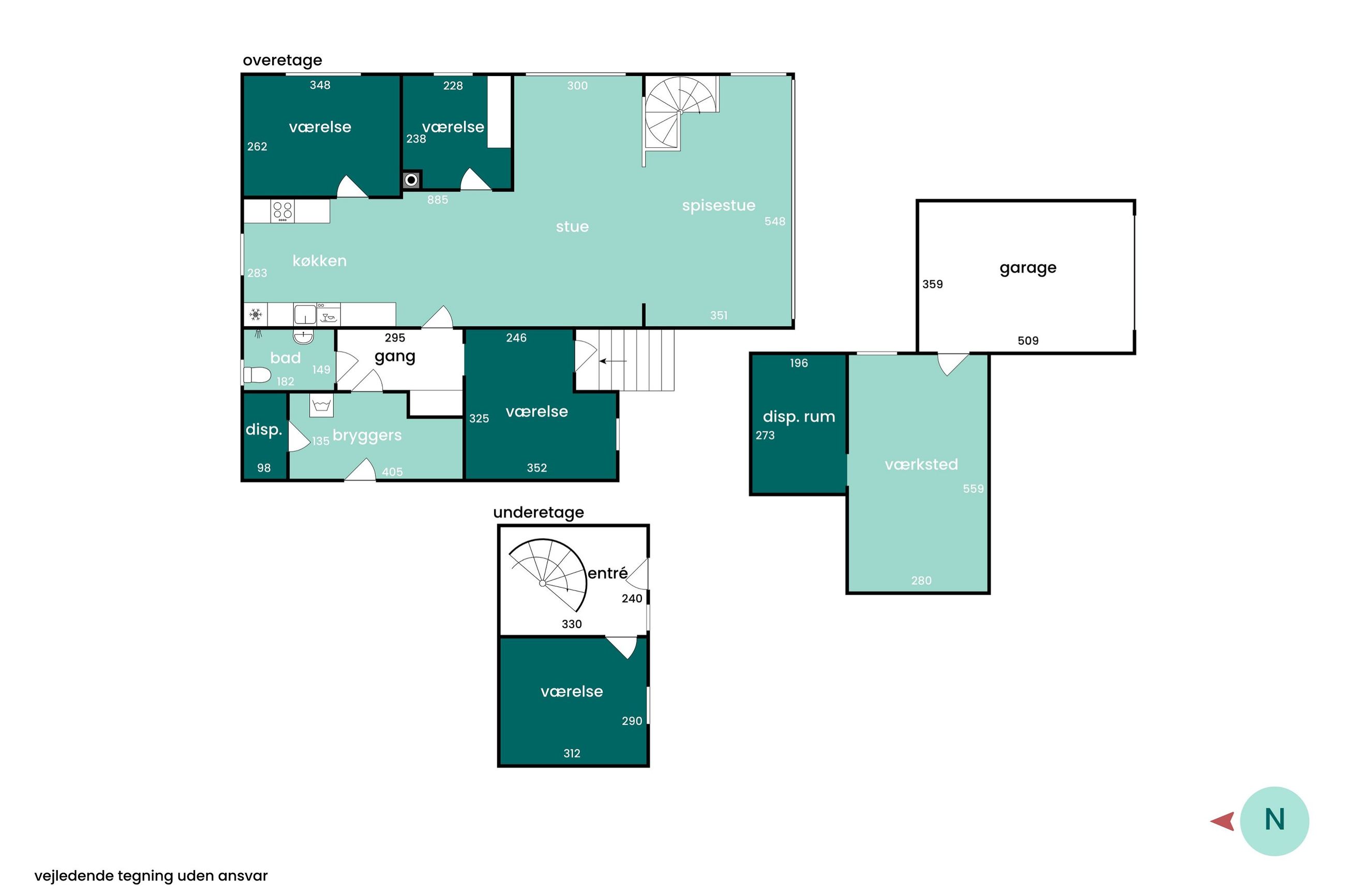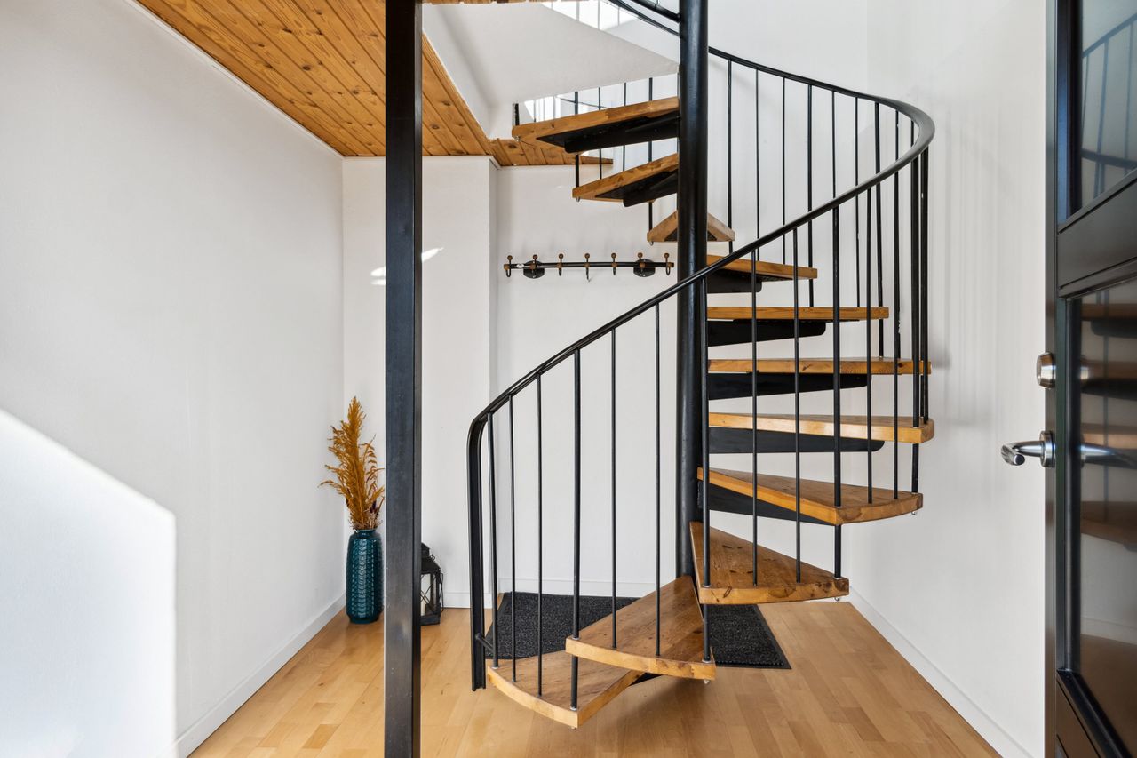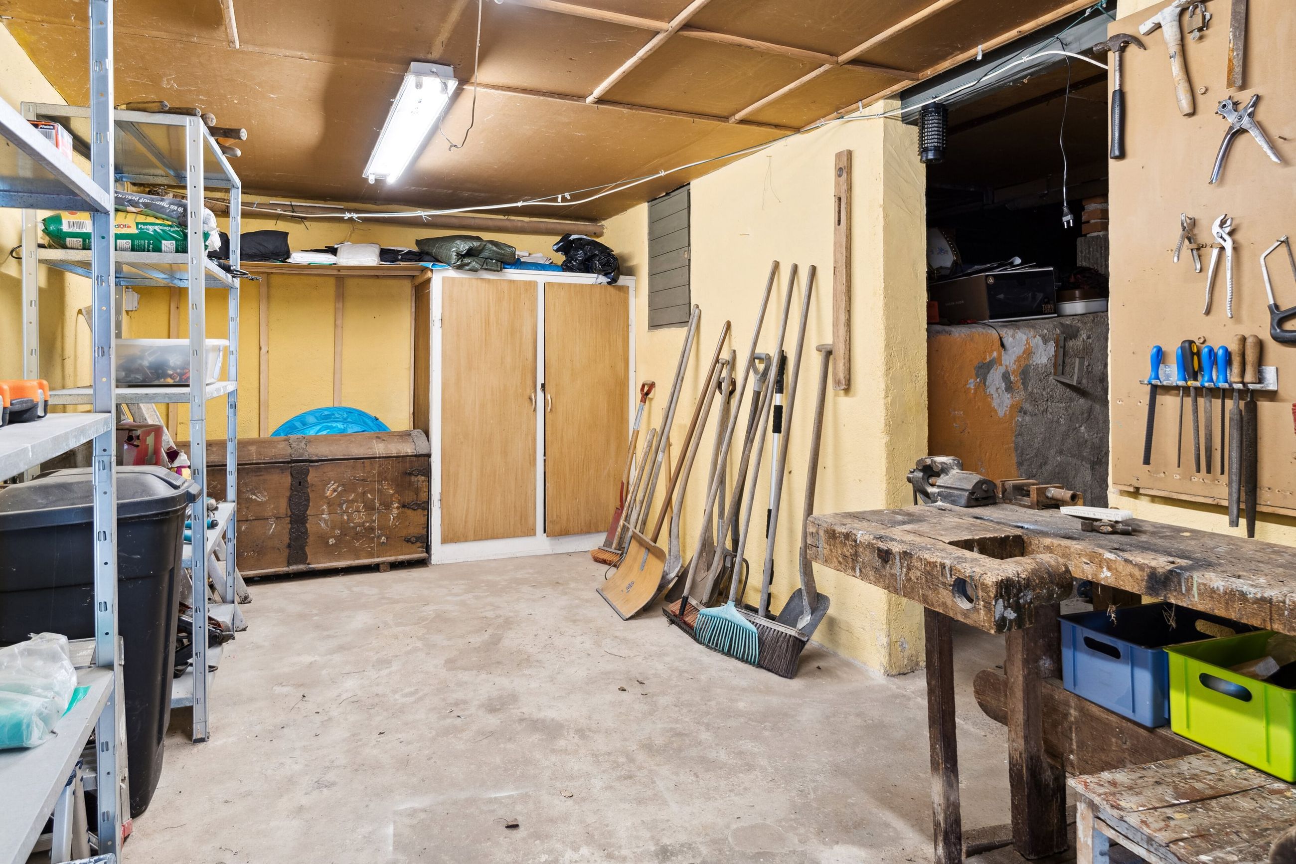 Fra stuen fører en charmerende, rund trappe dig ned til underetagen, hvor der findes endnu et værelse – oplagt som forældresoveværelse. Herudover byder ejendommen på en rummelig garage med tilhørende værksted og et disponibelt rum, der kan bruges til alt fra opbevaring til hobby.