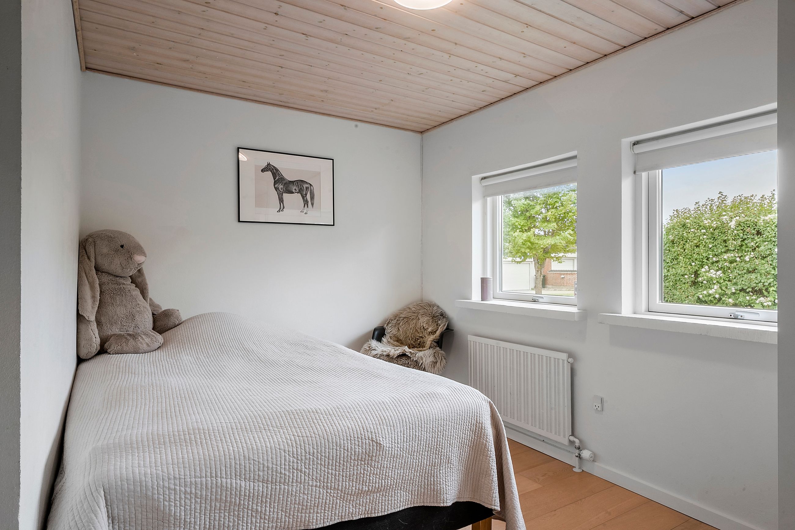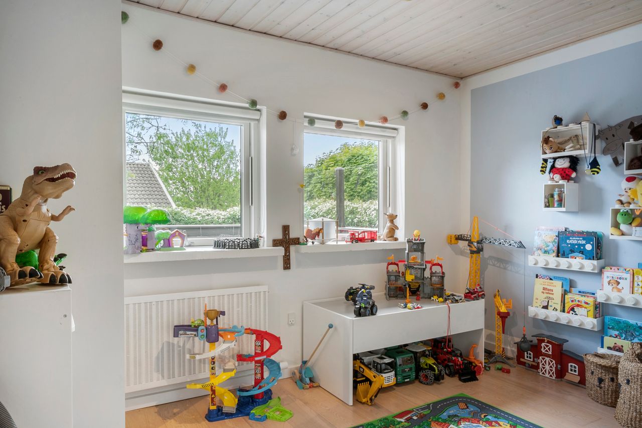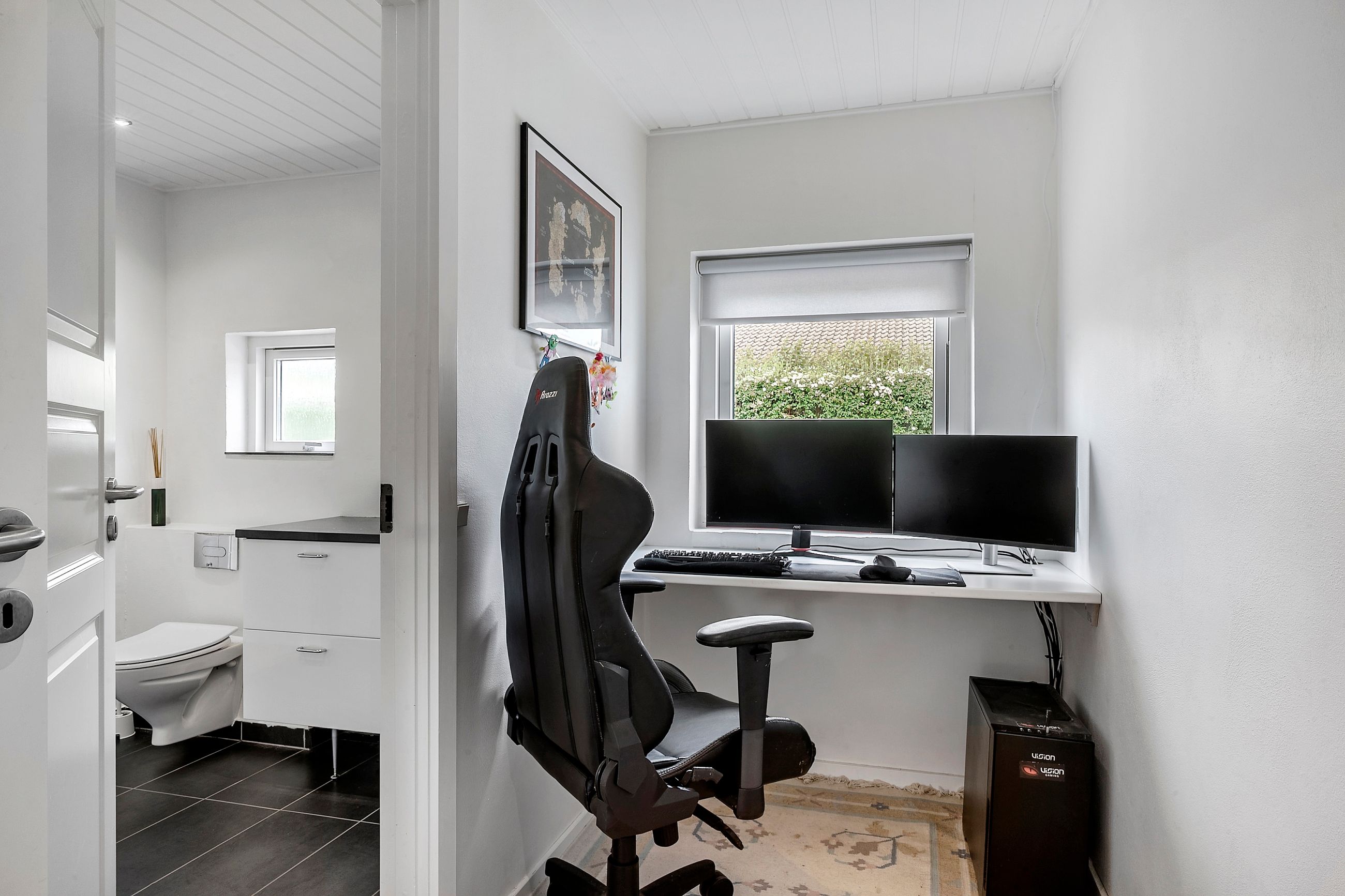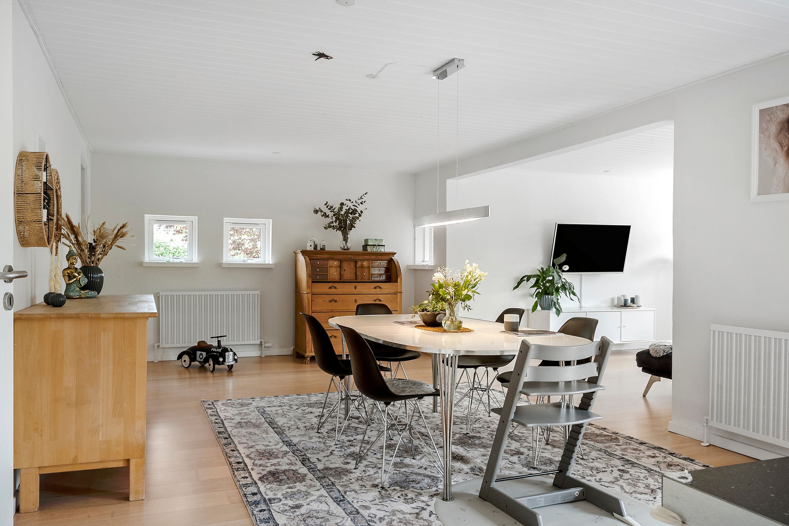 Villaen fra 1983 rummer alt, hvad familien behøver – samlet på ét plan. Det centrale samlingspunkt i hjemmet er det lyse og moderne køkken-alrum, hvor der er god plads til både madlavning og familieliv. Herfra er der adgang til forældreafdelingen, som består af et rummeligt soveværelse med god skabsplads og eget badeværelse i moderne stil. I forlængelse heraf ligger et praktisk kontor, som også kan tilgås fra stuen – perfekt til hjemmearbejde eller lektielæsning.