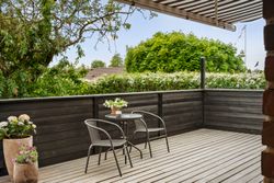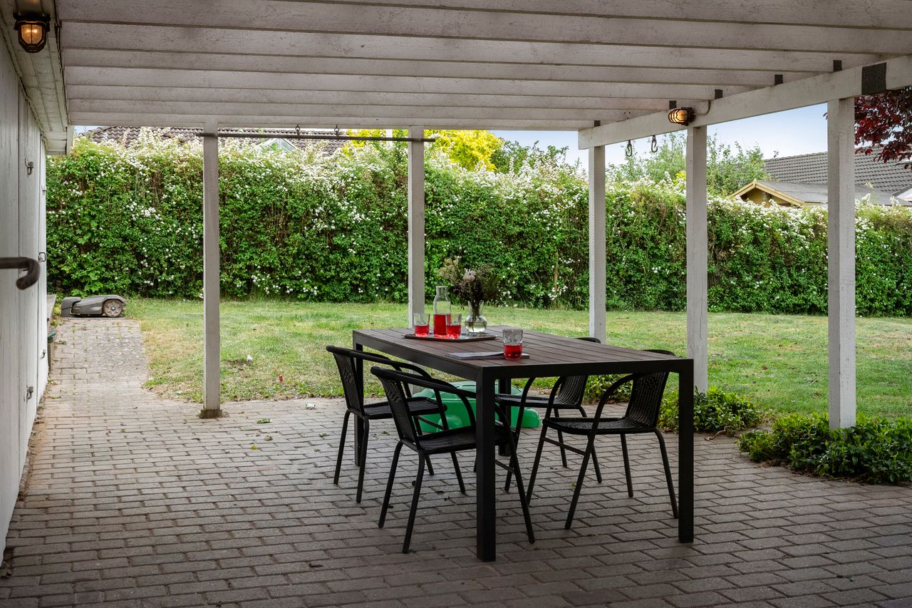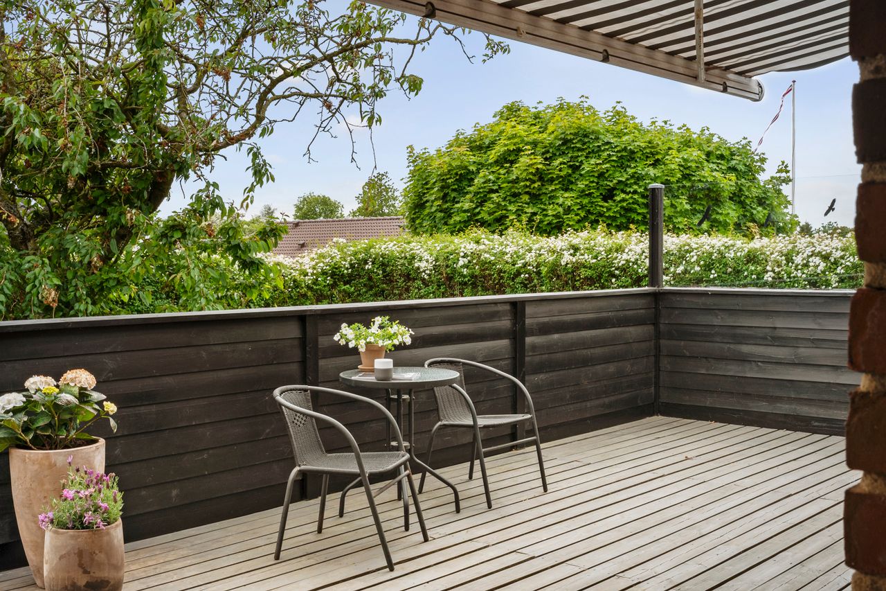 Udelivet er lige så indbydende som boligen. Haven er anlagt med flere hyggelige kroge, en solrig terrasse med udgang fra stuen og en markise, der forlænger sommeren. Derudover er der en overdækket terrasse på husets bagside med adgang til garagen – det hele er nemt at holde og ideelt til både leg, afslapning og samvær.