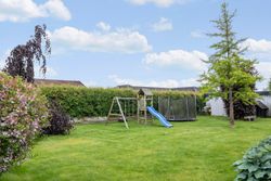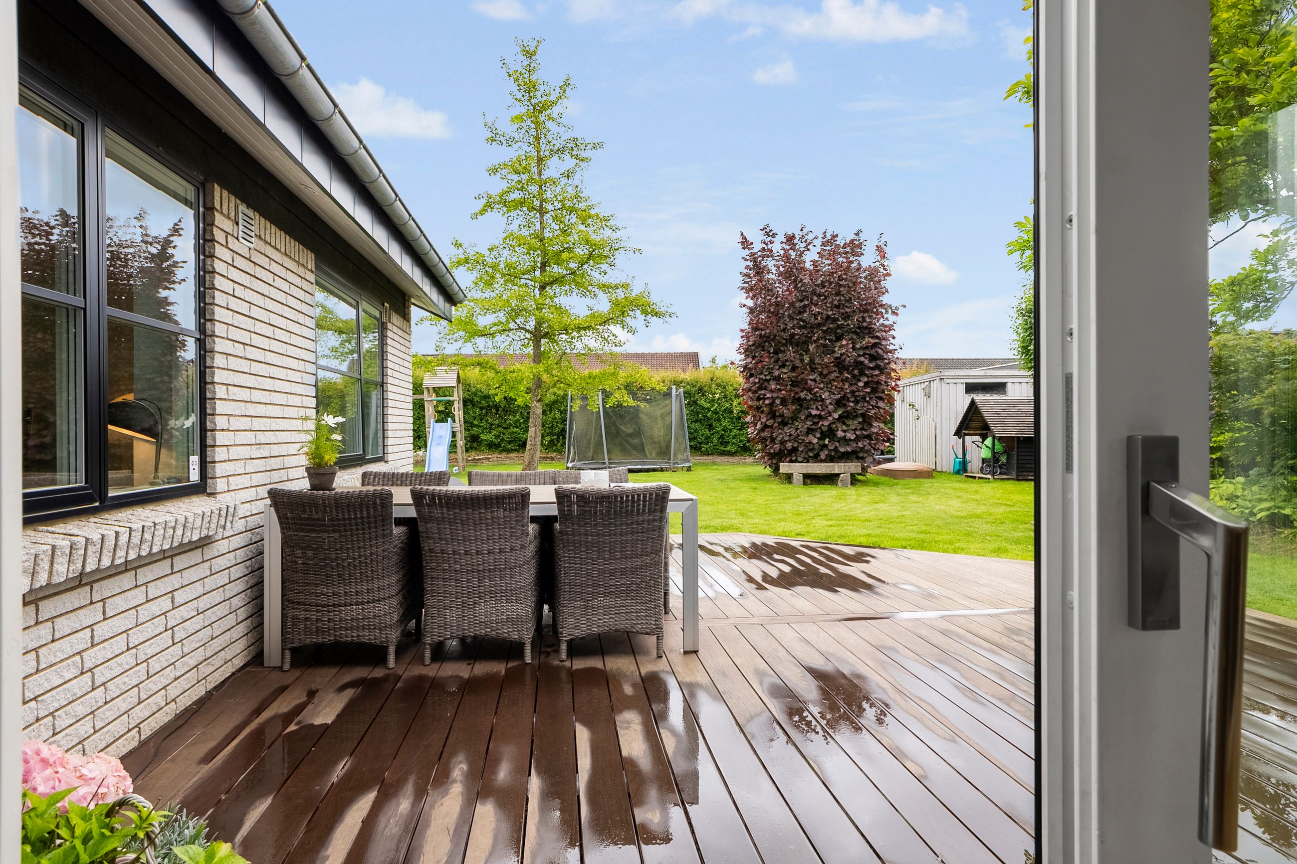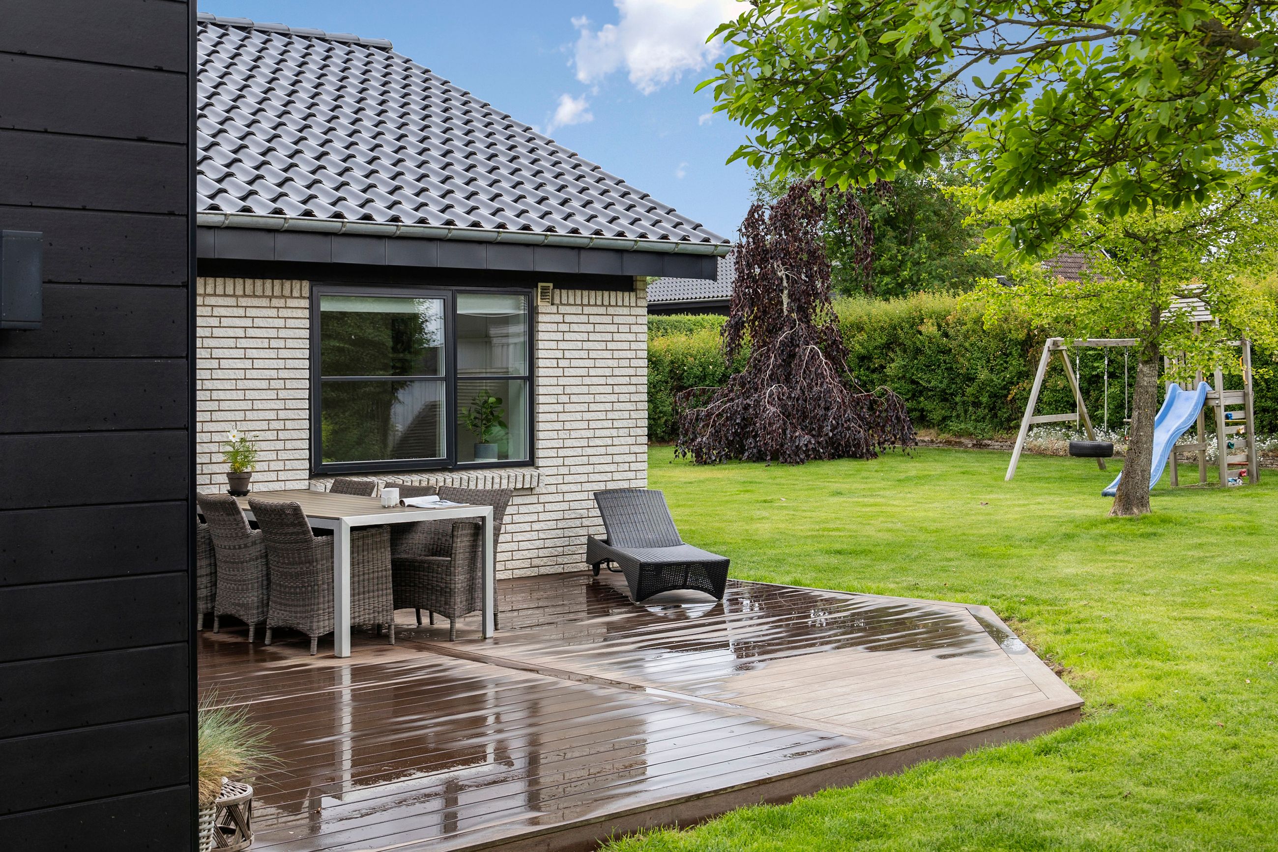 Udenfor venter en hyggelig, privat have med en overskuelig græsplæne og et solrigt terrassemiljø, der indbyder til afslapning og udendørsliv.
