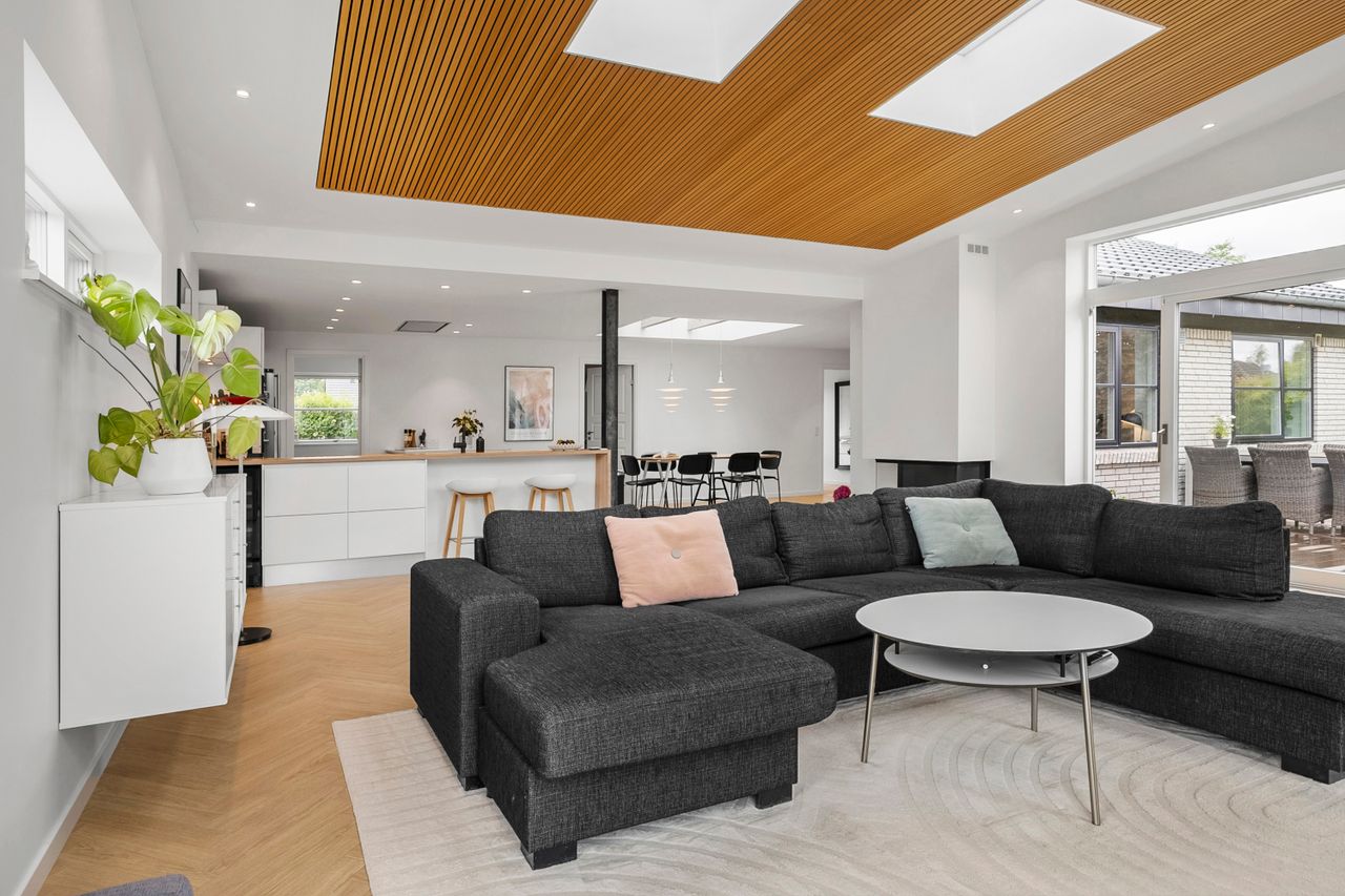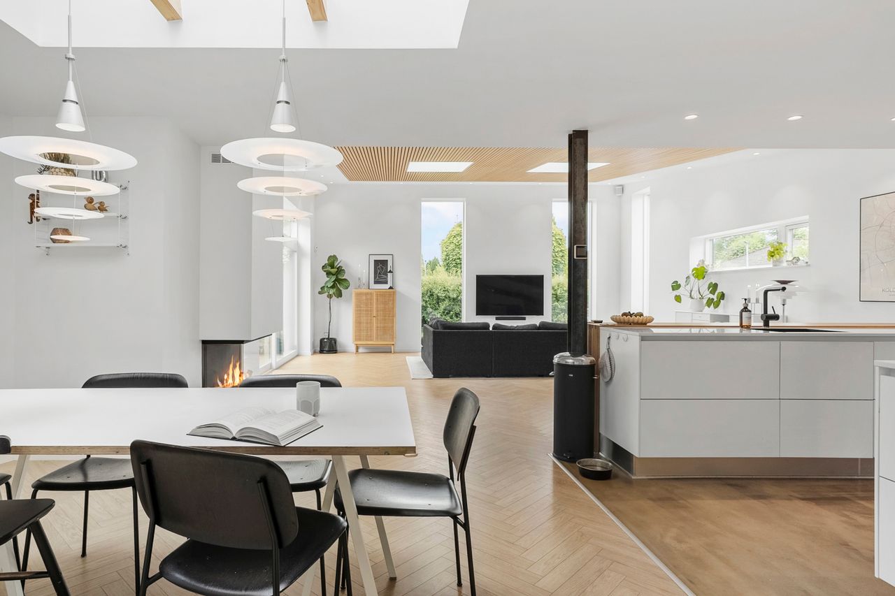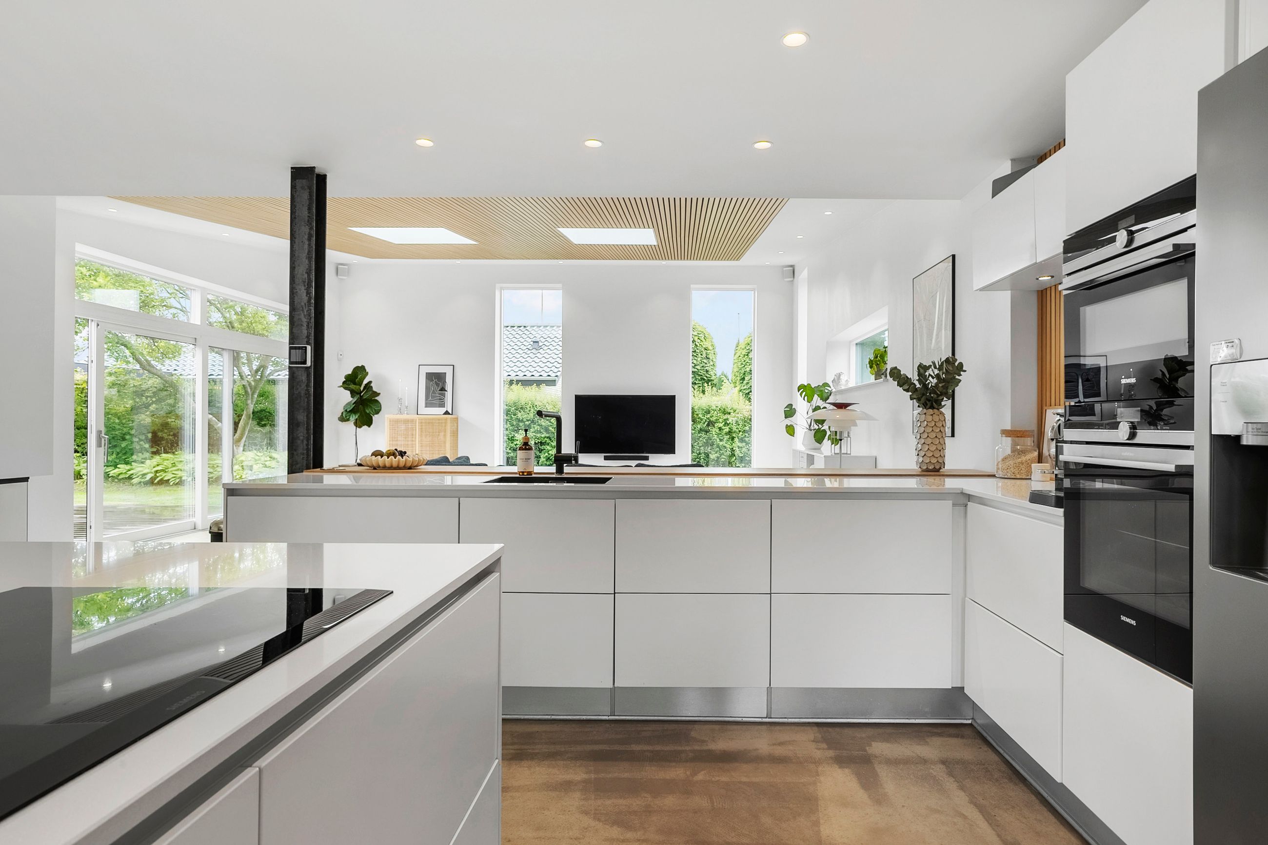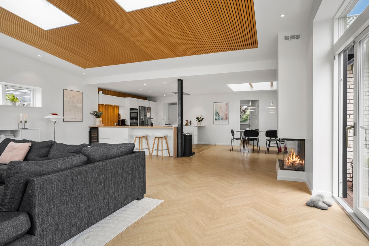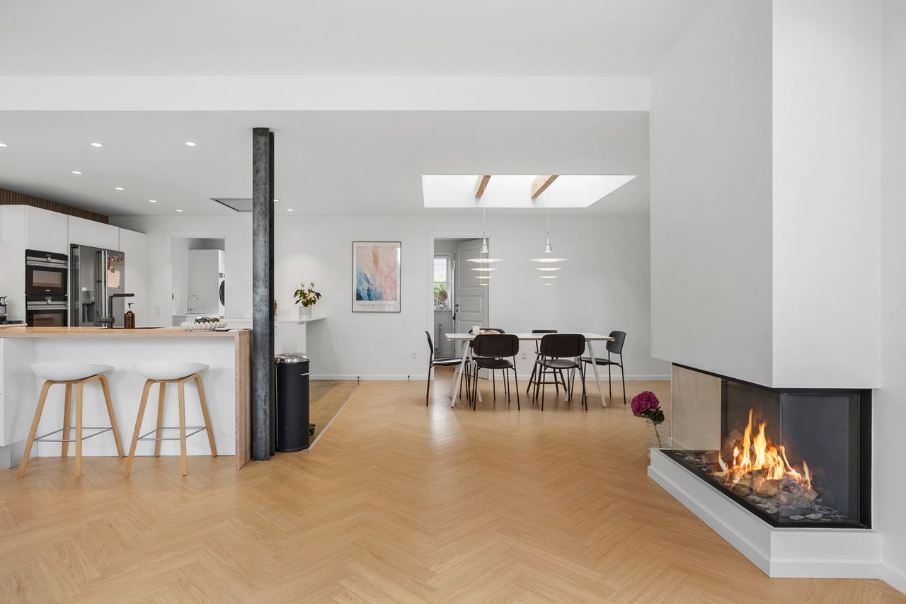 Her er der tænkt over både funktionalitet og æstetik – alt er udført i kvalitetsmaterialer og tidløst design. I bliver budt velkommen i en praktisk entré/bryggers med direkte adgang fra carporten. Herfra træder man ind i boligens hjerte – et imponerende leverum med køkken, alrum og stue i ét. Køkkenet er både stilrent og rummeligt med god plads til madlavning og samvær, mens stuen byder på store vinduespartier, akustikpaneler og et skønt lysindfald, der skaber en behagelig og indbydende atmosfære. En moderne, indbygget gaspejs bidrager med både varme og hygge, og de store skydedøre forbinder rummet direkte med terrassen udenfor – en løsning med sans for både detalje og funktion.