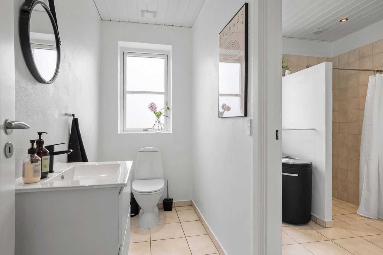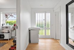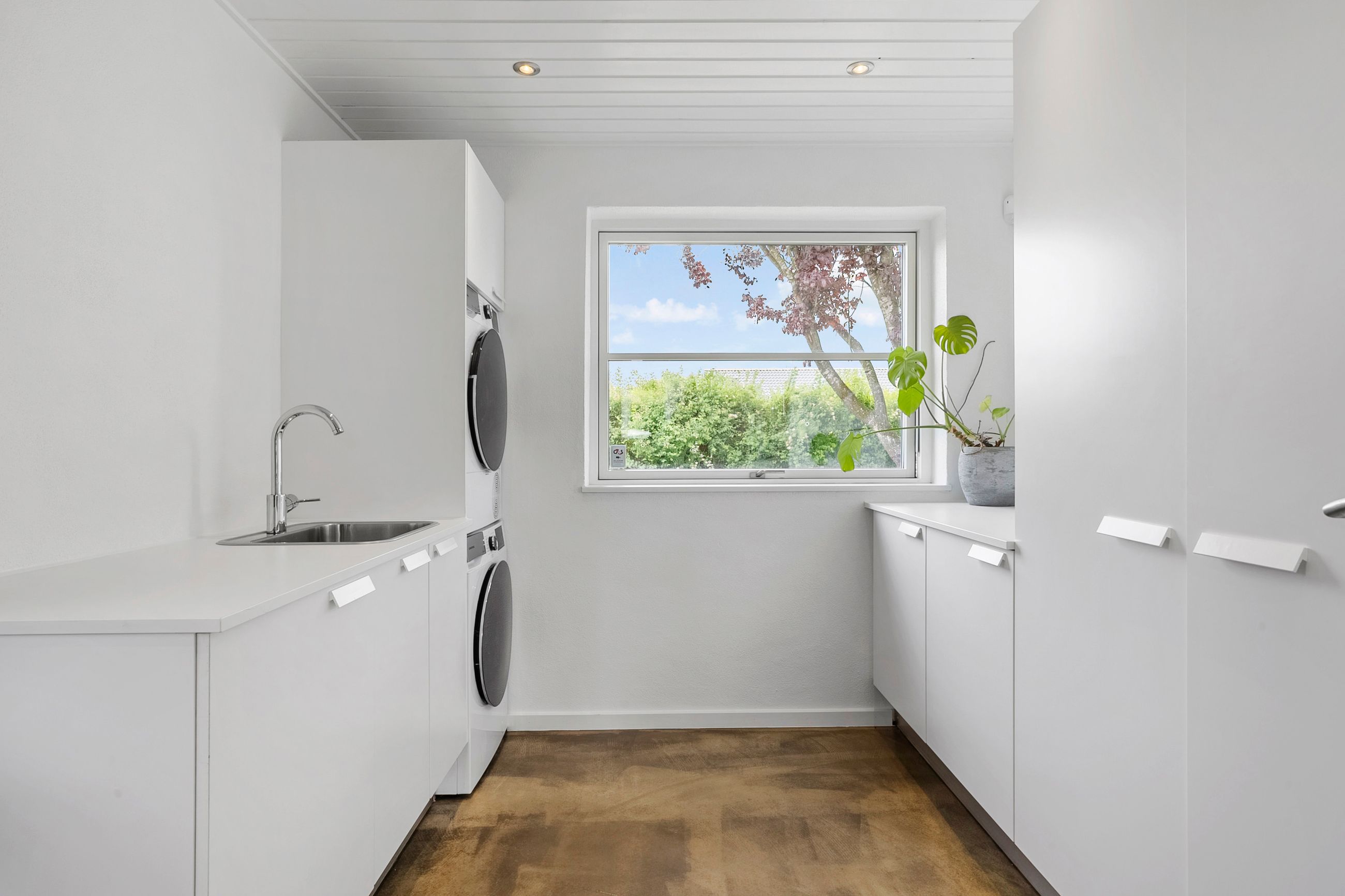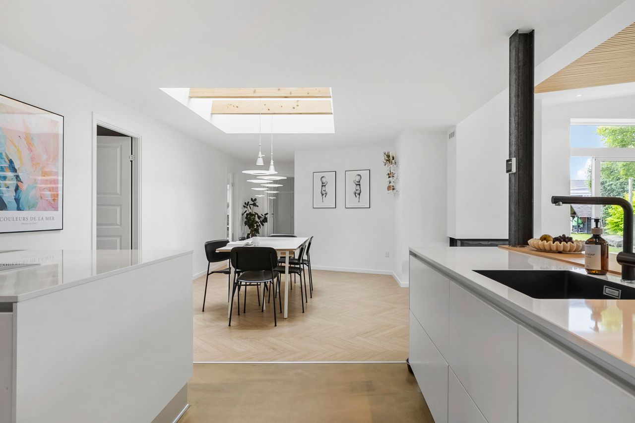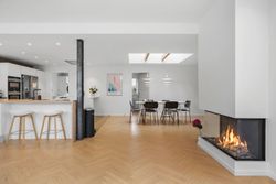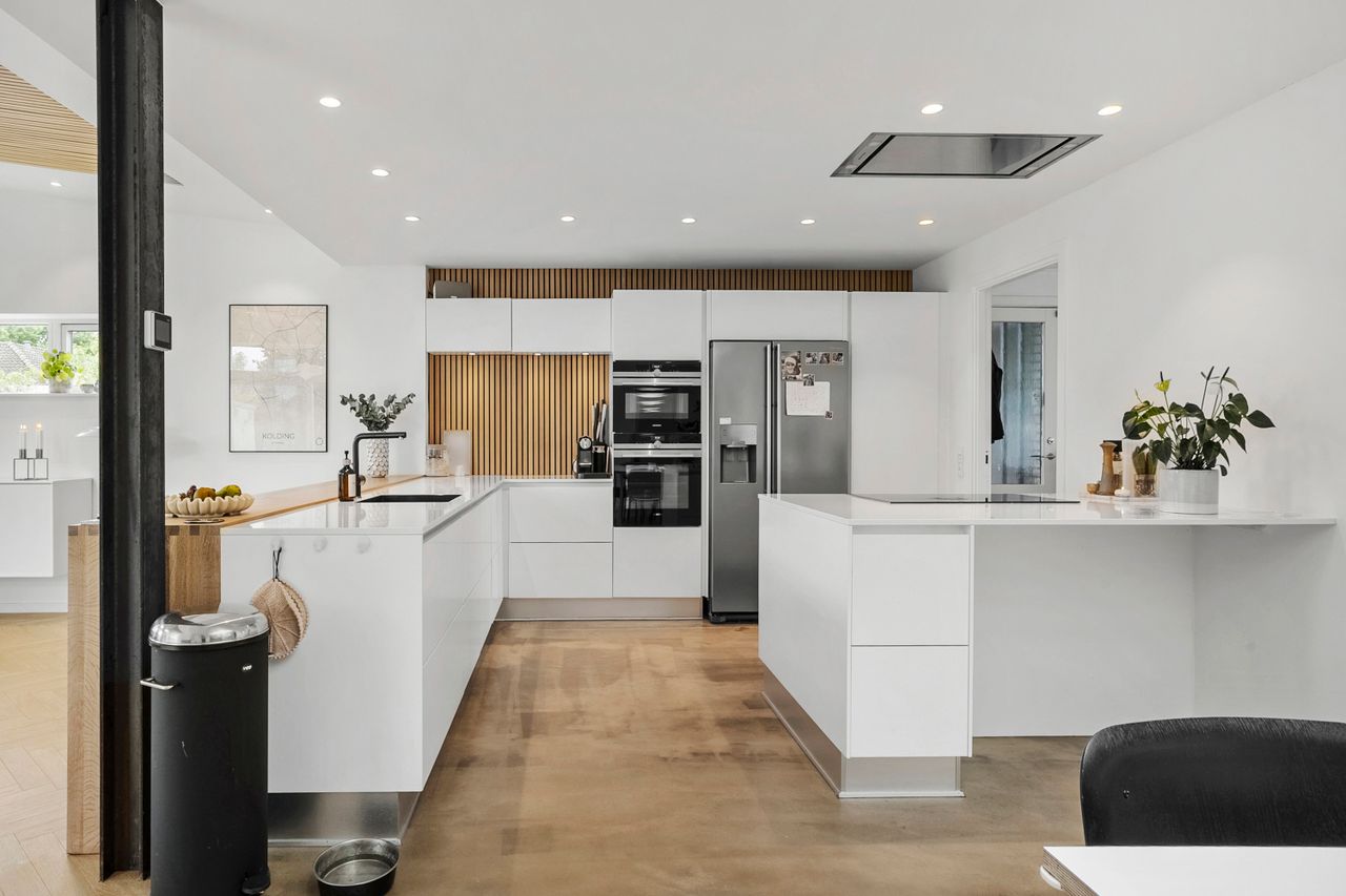 Her er der tænkt over både funktionalitet og æstetik – alt er udført i kvalitetsmaterialer og tidløst design. I bliver budt velkommen i en praktisk entré/bryggers med direkte adgang fra carporten. Herfra træder man ind i boligens hjerte – et imponerende leverum med køkken, alrum og stue i ét. Køkkenet er både stilrent og rummeligt med god plads til madlavning og samvær, mens stuen byder på store vinduespartier, akustikpaneler og et skønt lysindfald, der skaber en behagelig og indbydende atmosfære. En moderne, indbygget gaspejs bidrager med både varme og hygge, og de store skydedøre forbinder rummet direkte med terrassen udenfor – en løsning med sans for både detalje og funktion.