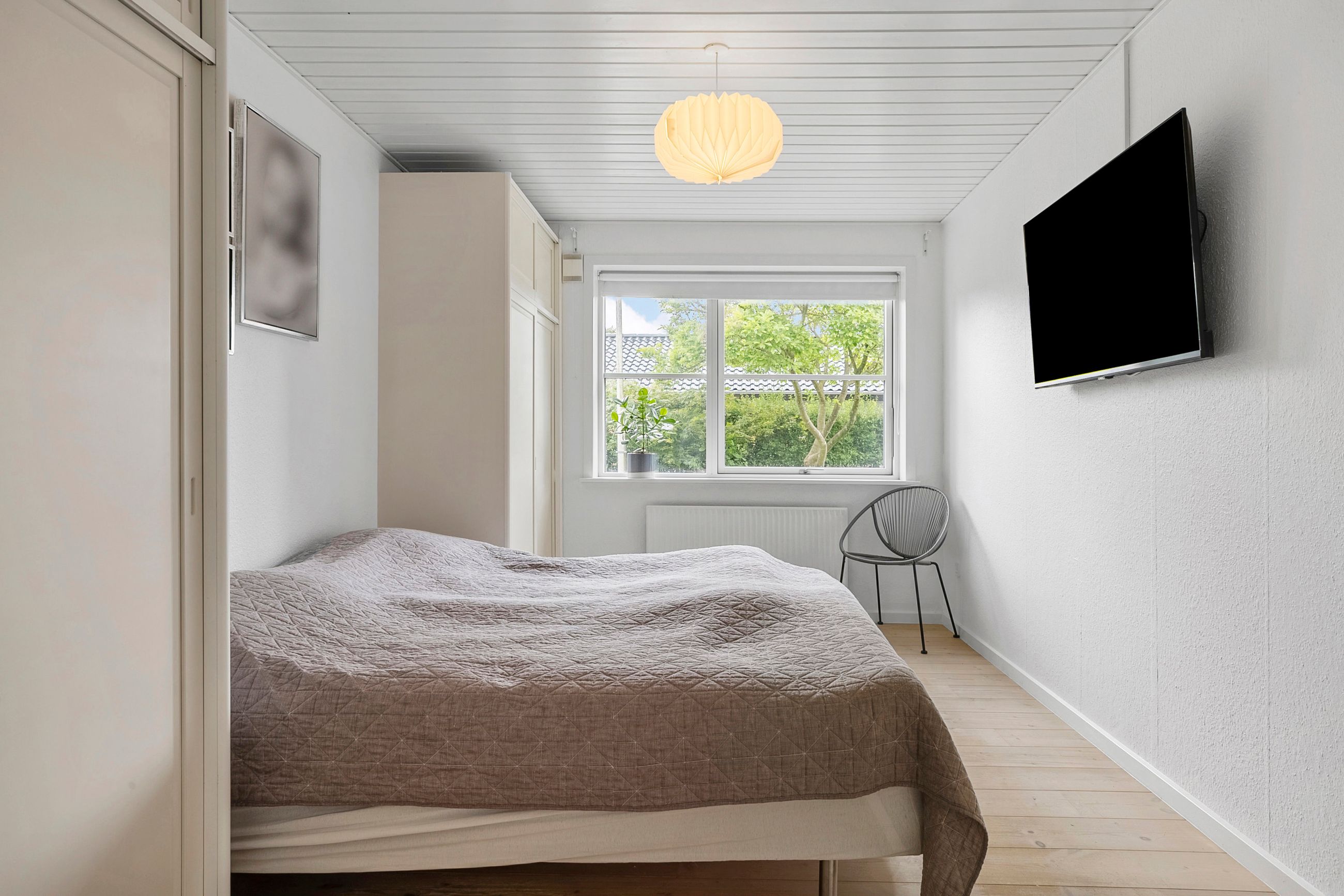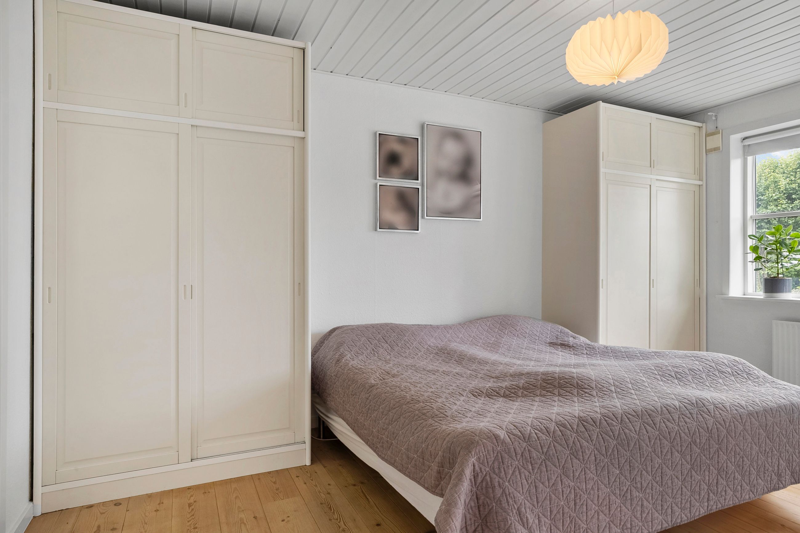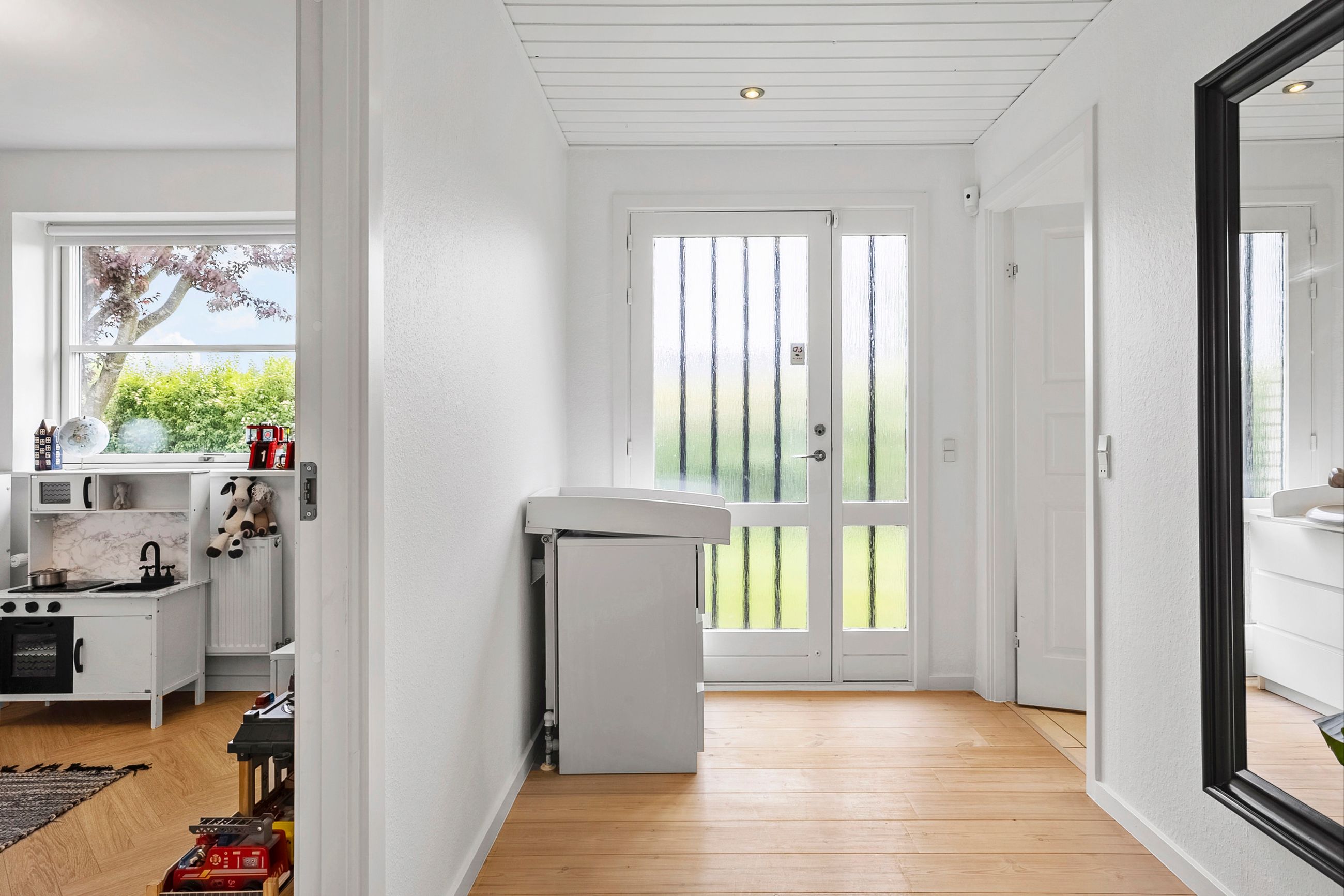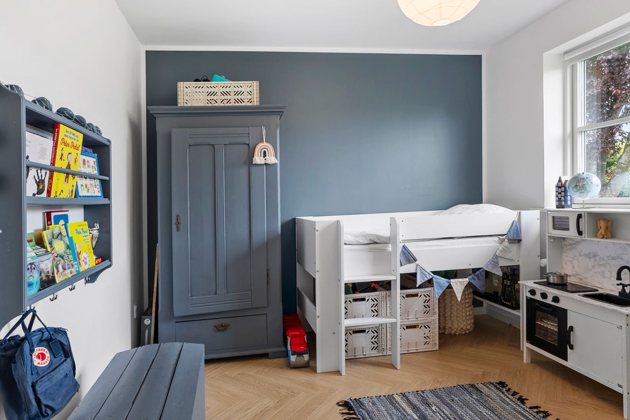 Planløsningen er gennemtænkt og velfungerende. Fra leverummet er der adgang til to gode børneværelser og et rummeligt forældresoveværelse med eget badeværelse – praktisk forbundet med boligens gæstetoilet. Derudover får I et ekstra værelse, som i dag bruges til kontor med indbygget skab, perfekt til hjemmearbejde eller hobbyaktiviteter.