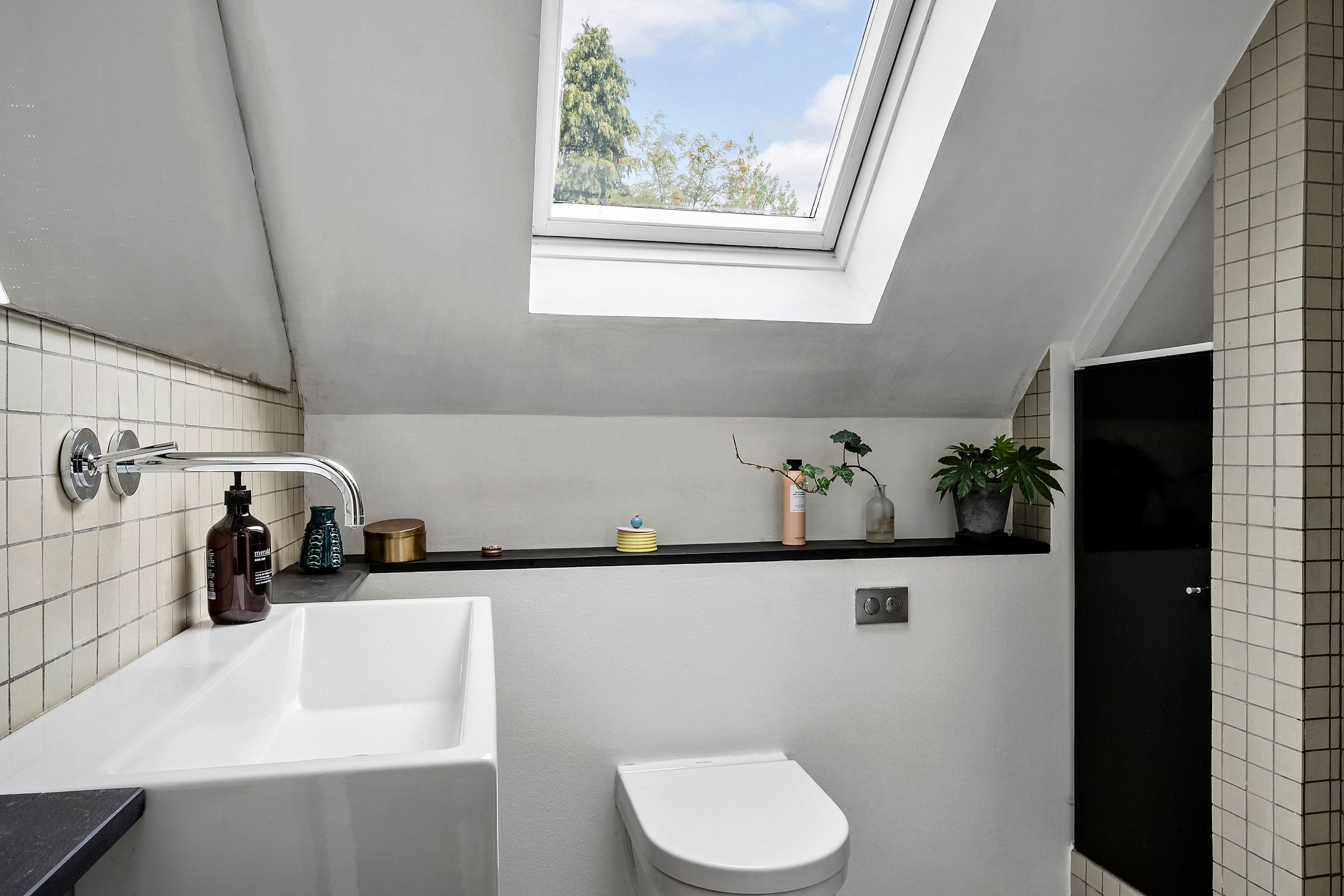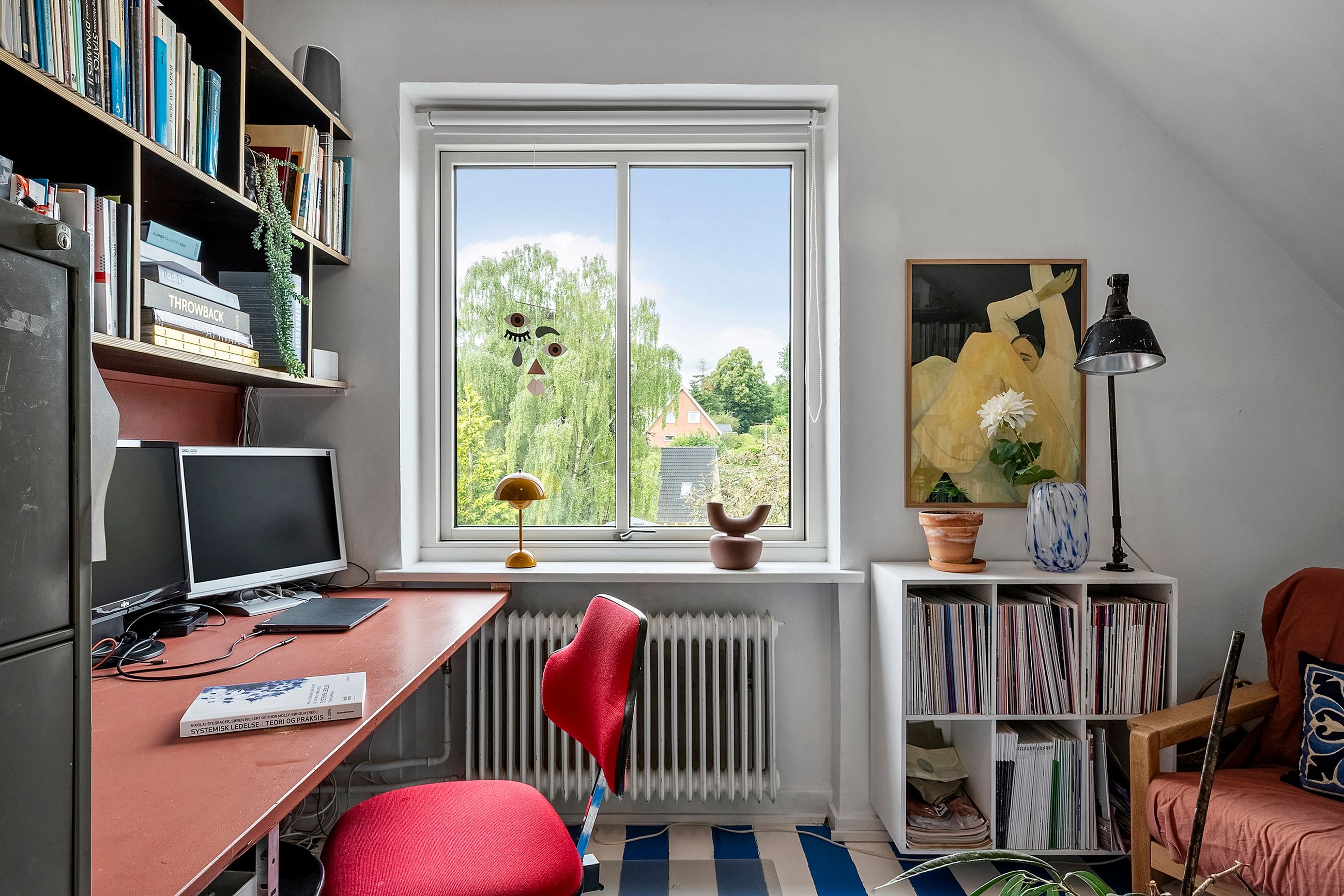 En halv etage op finder du forældresoveværelset med en elegant skabsvæg og et stort vinduesparti med et langt kig ud over haven og byens tage. På samme etage ligger et ekstra værelse, som i dag fungerer som kontor, samt et stilfuldt badeværelse med fine detaljer.