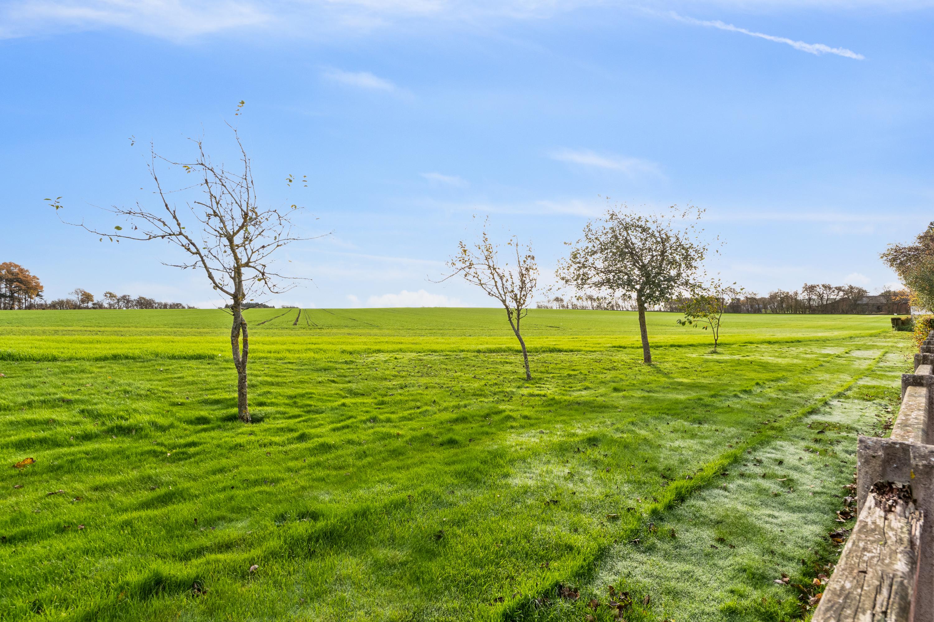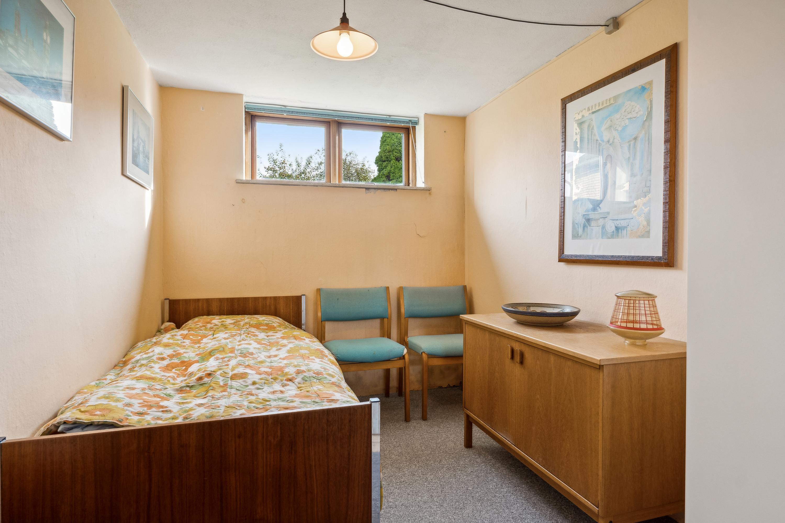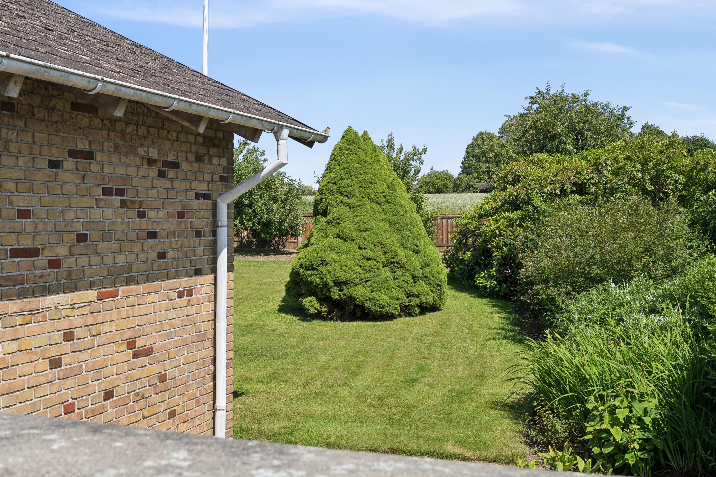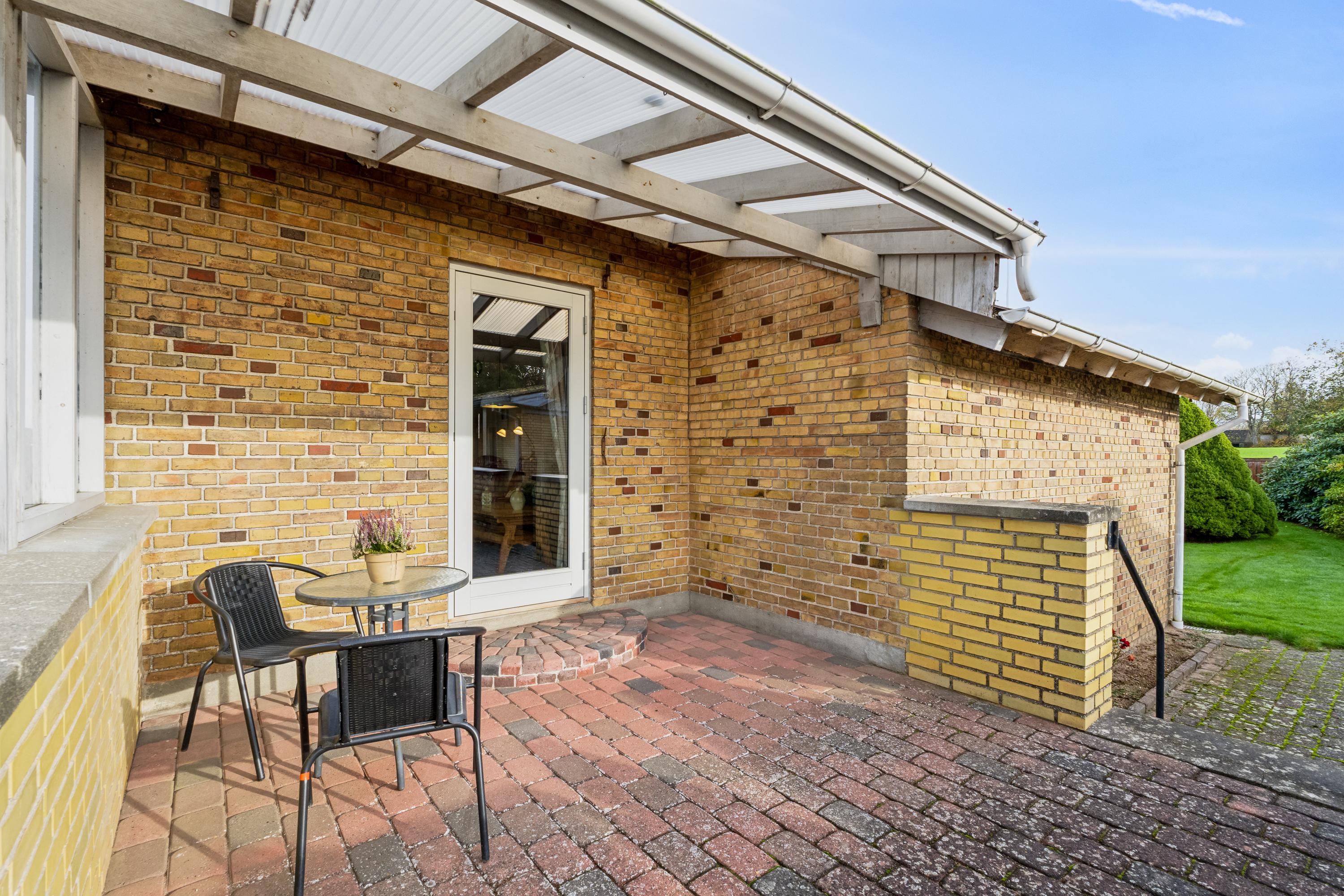 En trappe fører op til entréen i den højtliggende stueplan. Som det