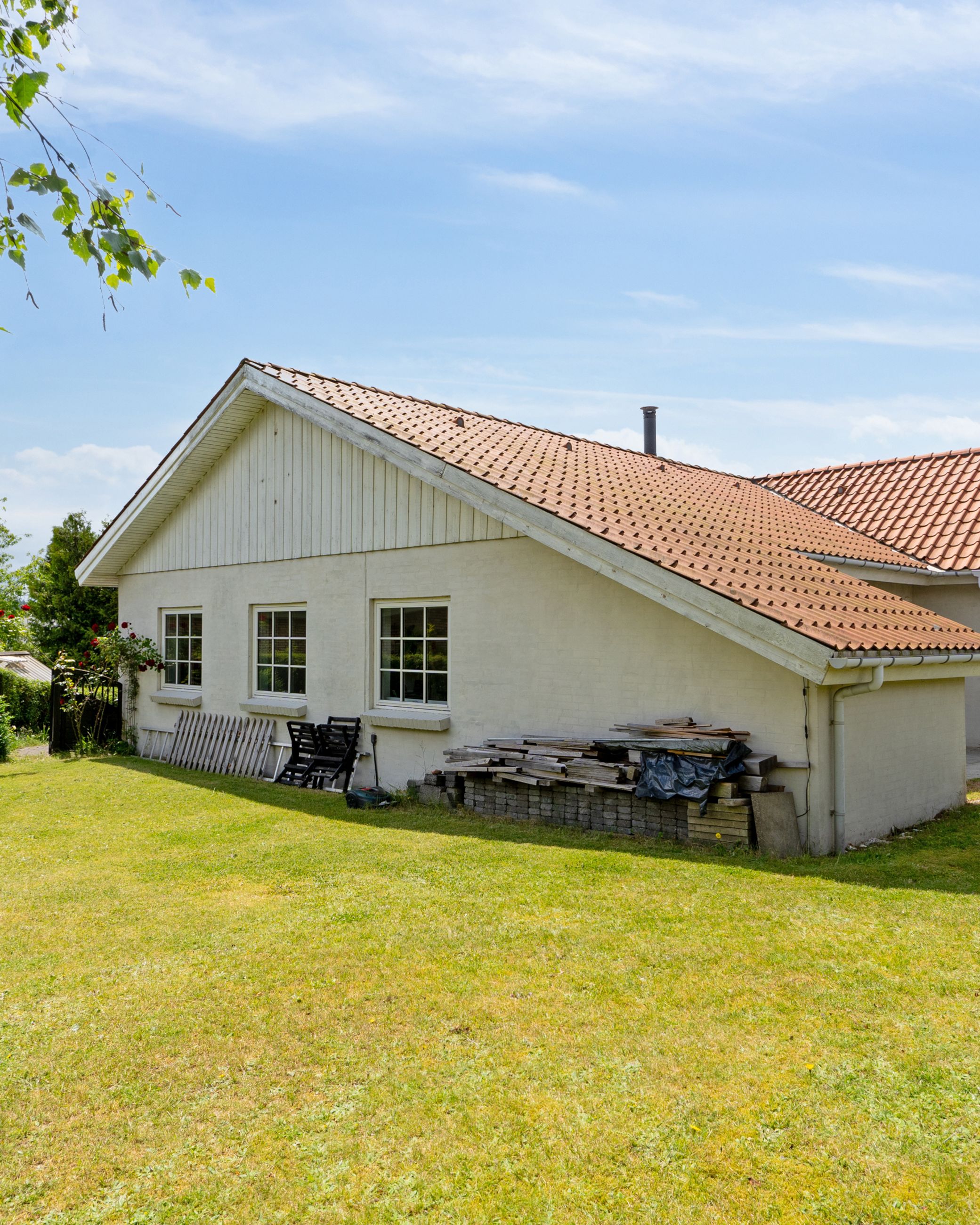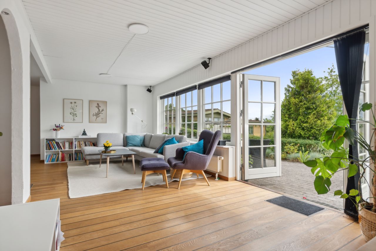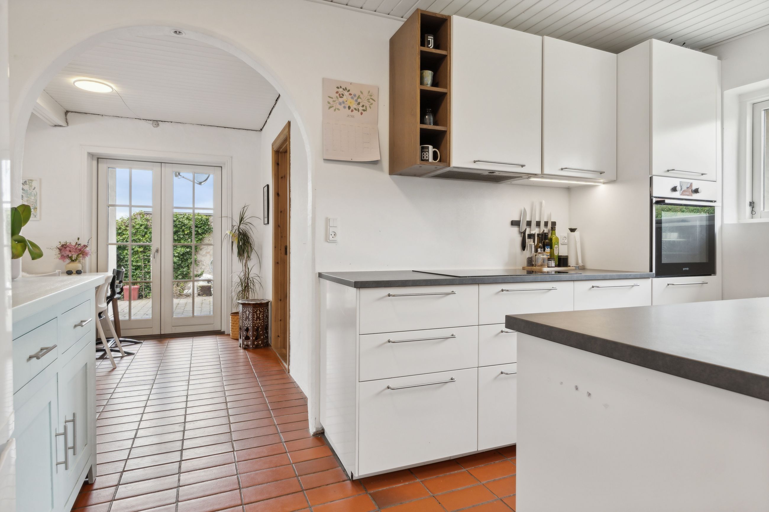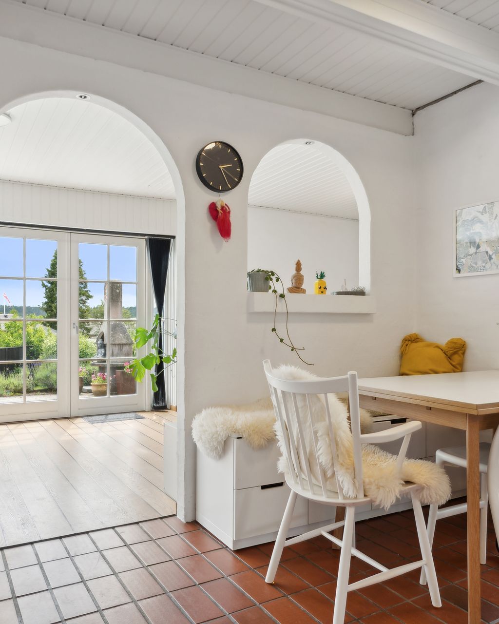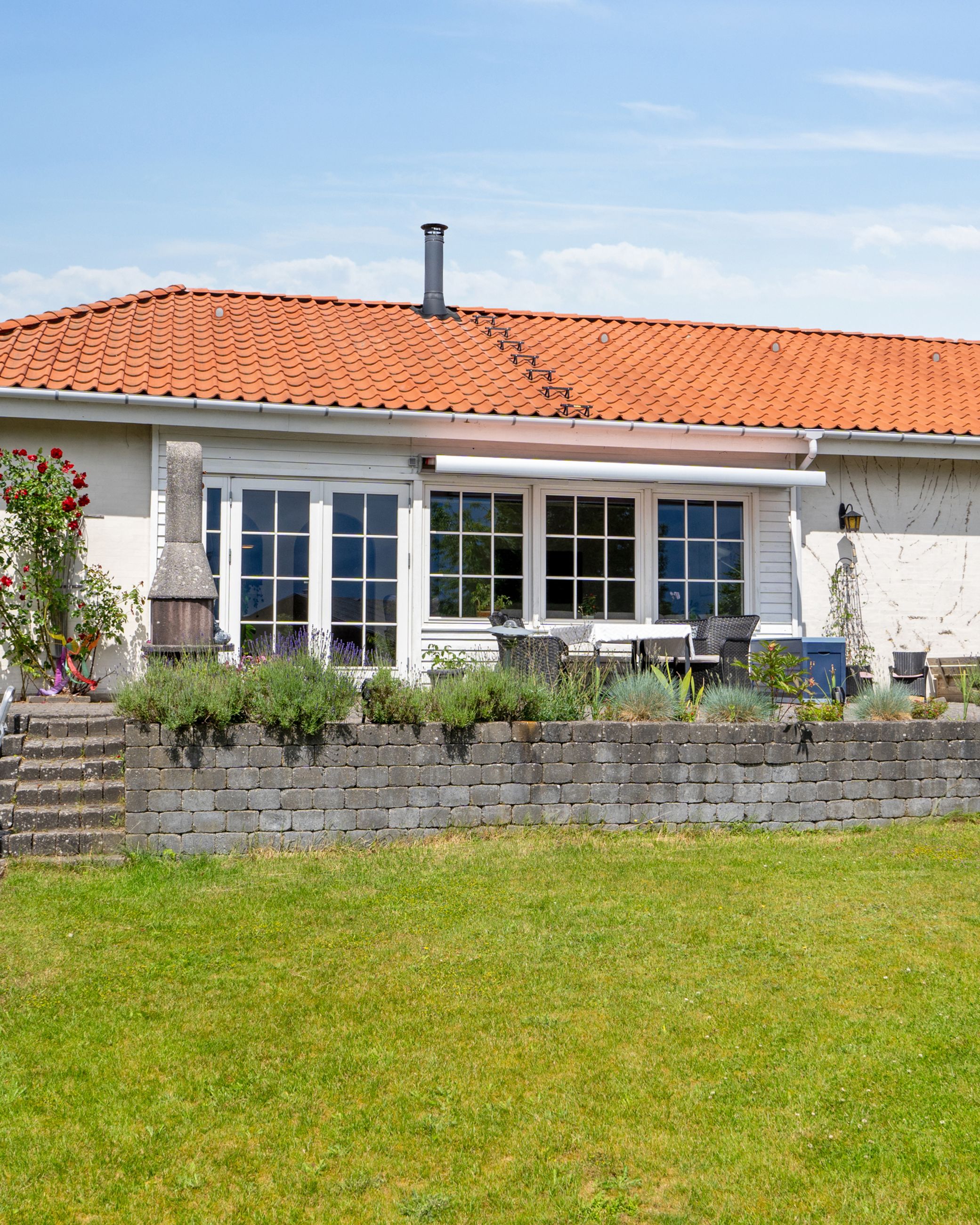 Indendørs byder boligen på et lyst og indbydende køkken med spisekrog og klinkegulv, hvorfra der er direkte udgang til terrassen – perfekt til måltider under åben himmel. Den sydvendte stue imponerer med et flot skibsgulv, en hyggelig brændeovn og store vinduespartier, som sammen med dobbeltdørene til terrassen lukker masser af naturligt lys og den omgivende natur ind.