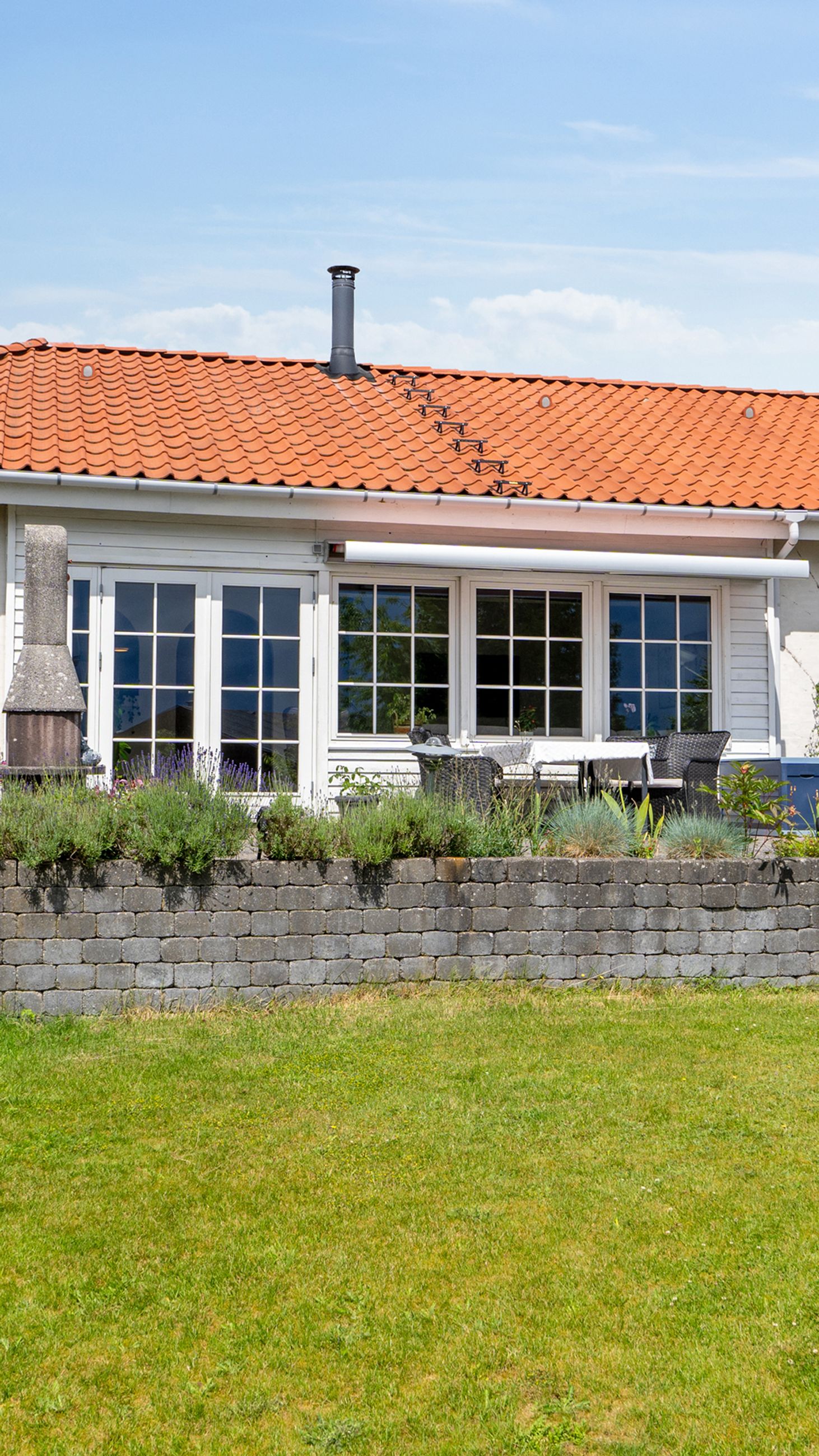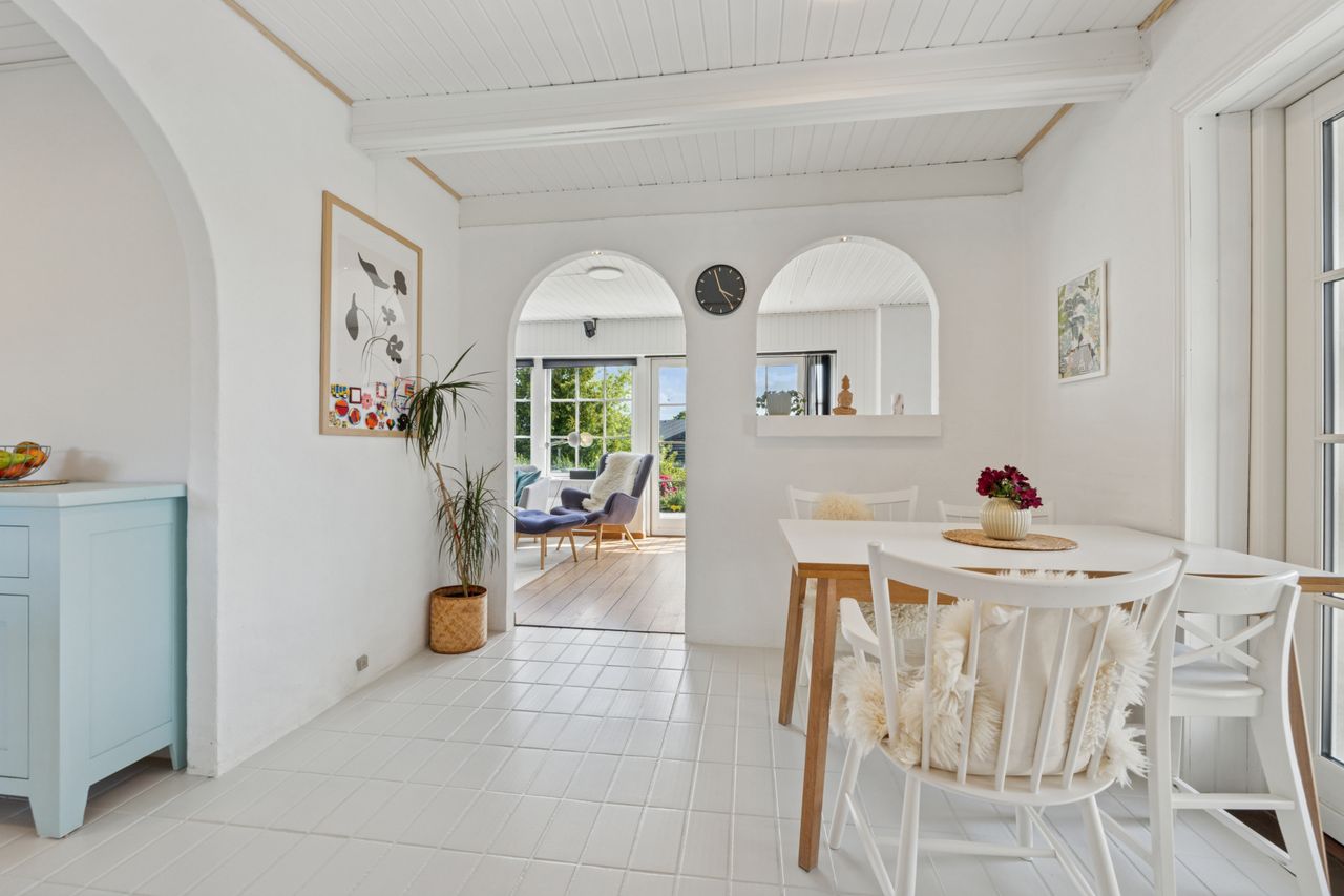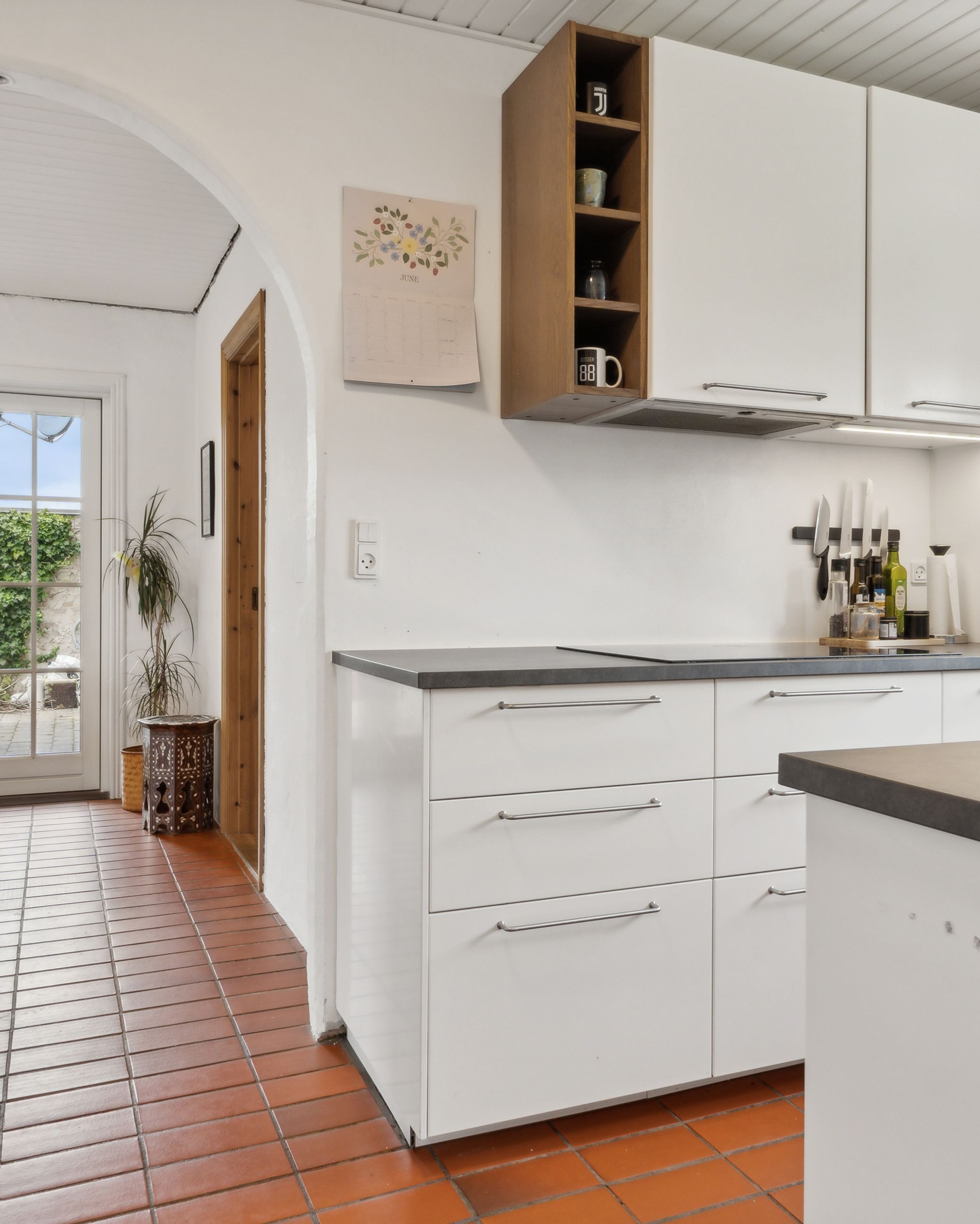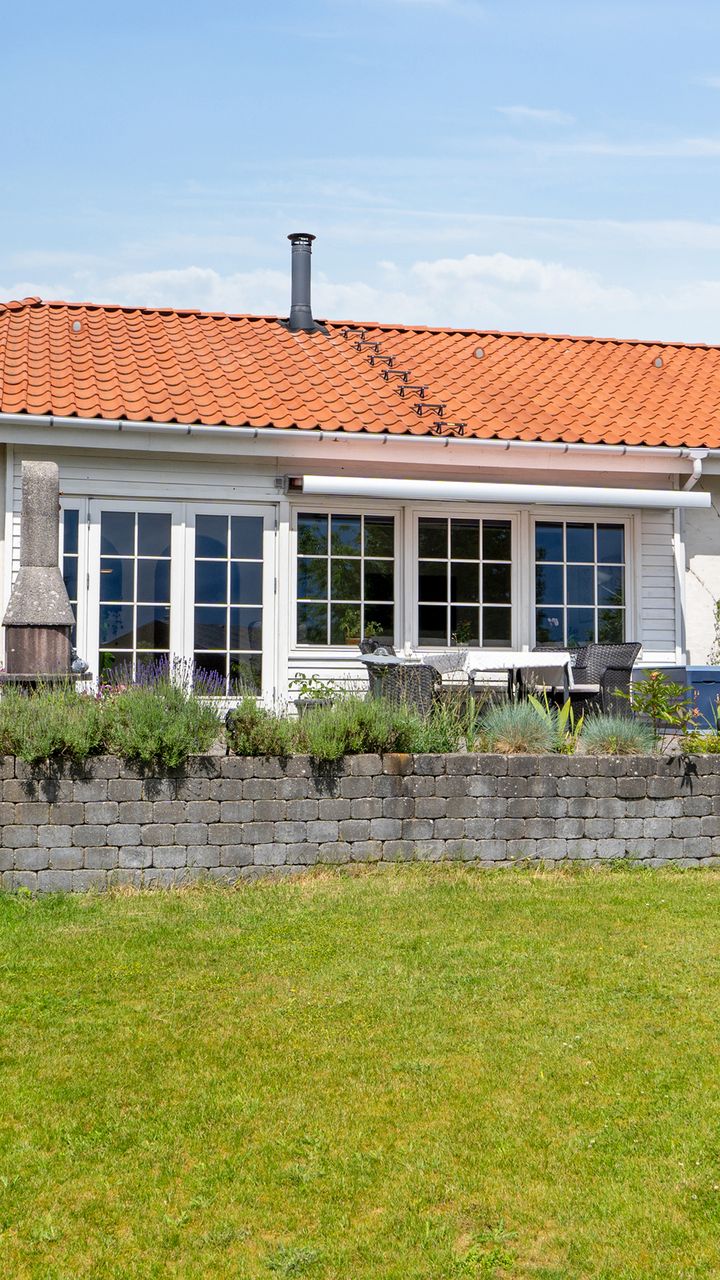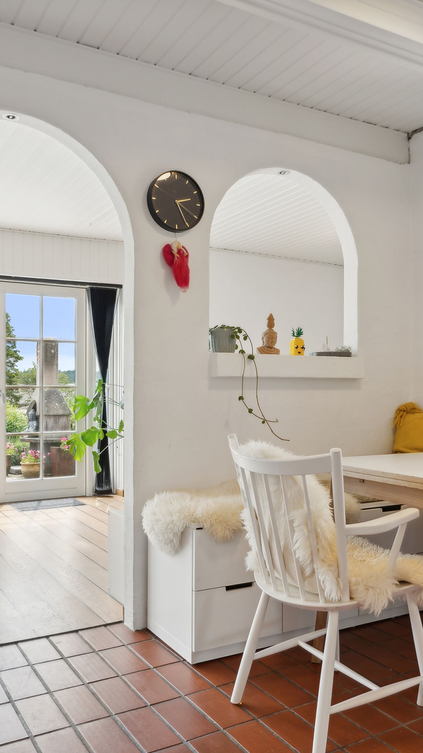 Indendørs byder boligen på et lyst og indbydende køkken med spisekrog og klinkegulv, hvorfra der er direkte udgang til terrassen – perfekt til måltider under åben himmel. Den sydvendte stue imponerer med et flot skibsgulv, en hyggelig brændeovn og store vinduespartier, som sammen med dobbeltdørene til terrassen lukker masser af naturligt lys og den omgivende natur ind.