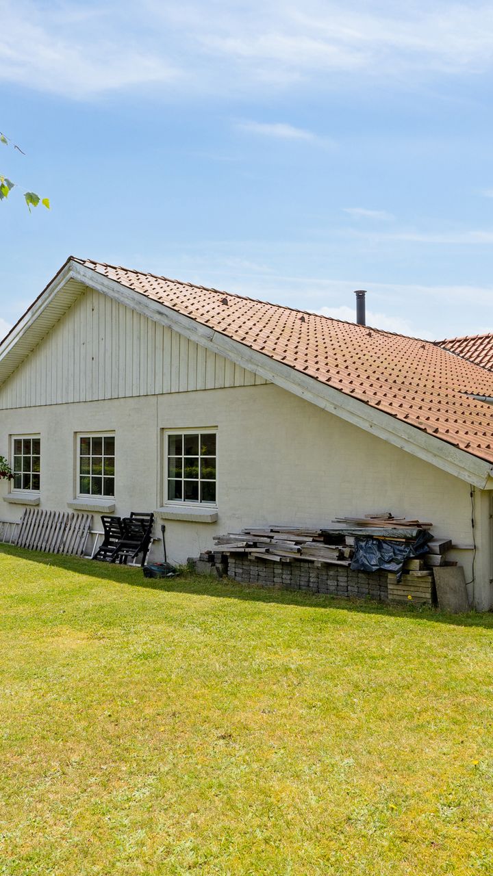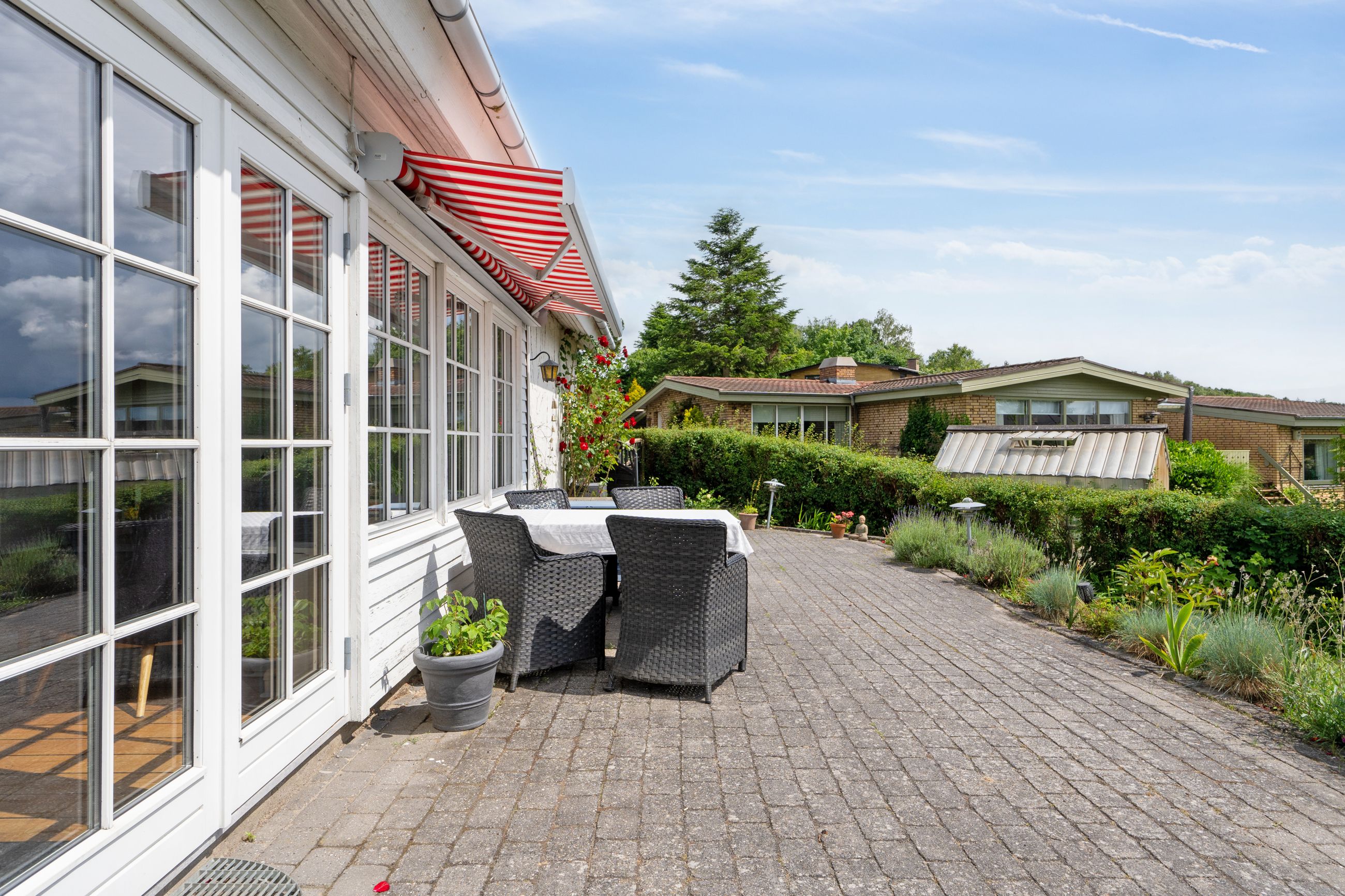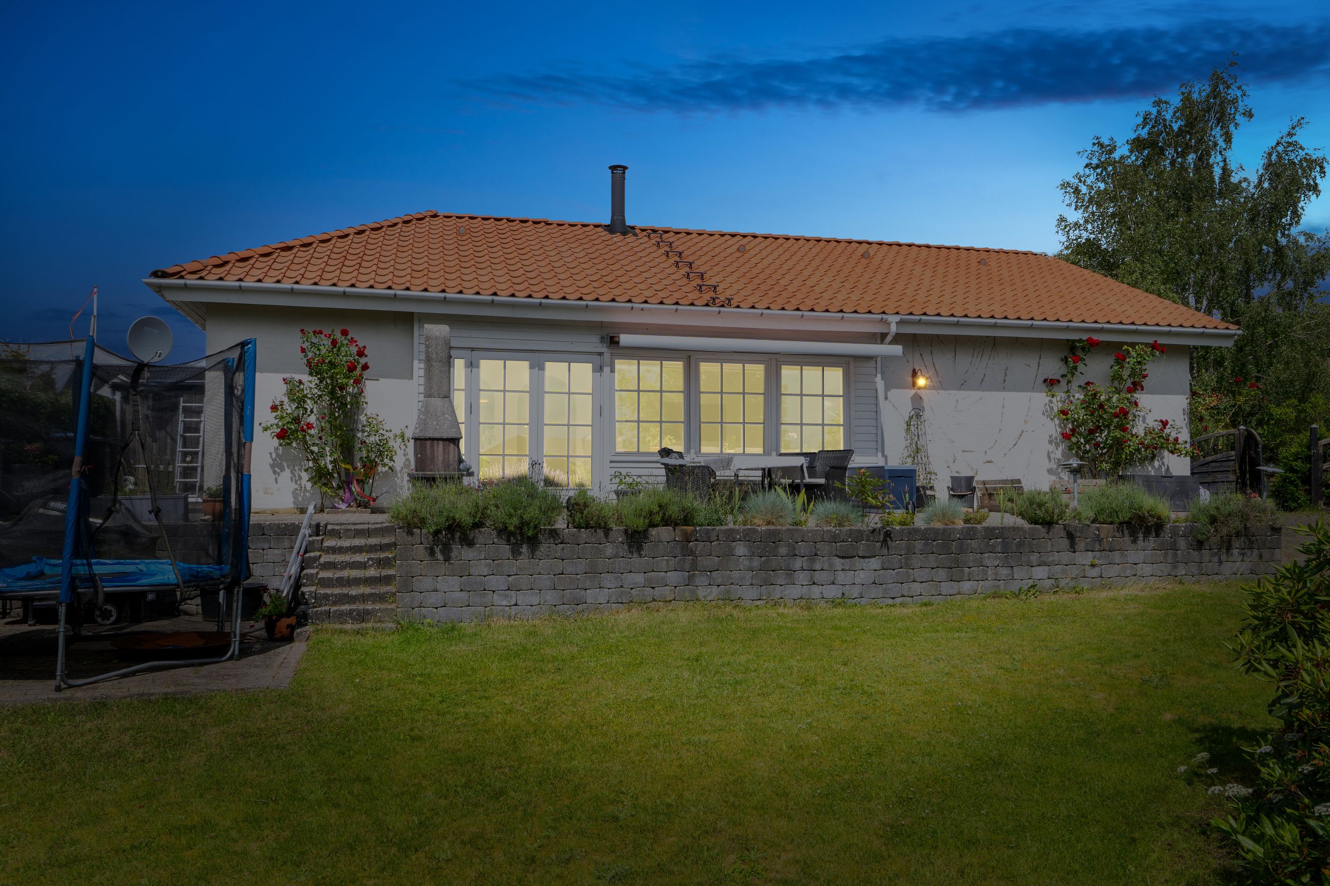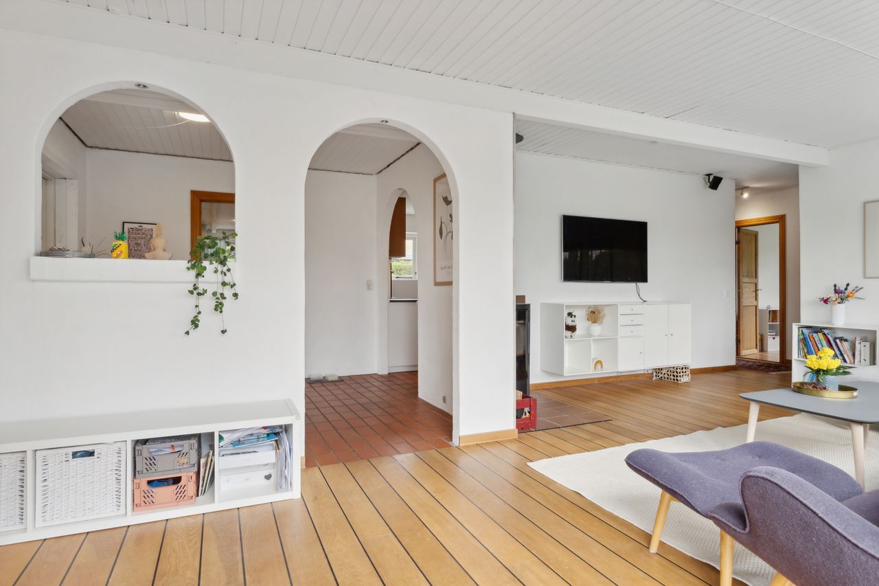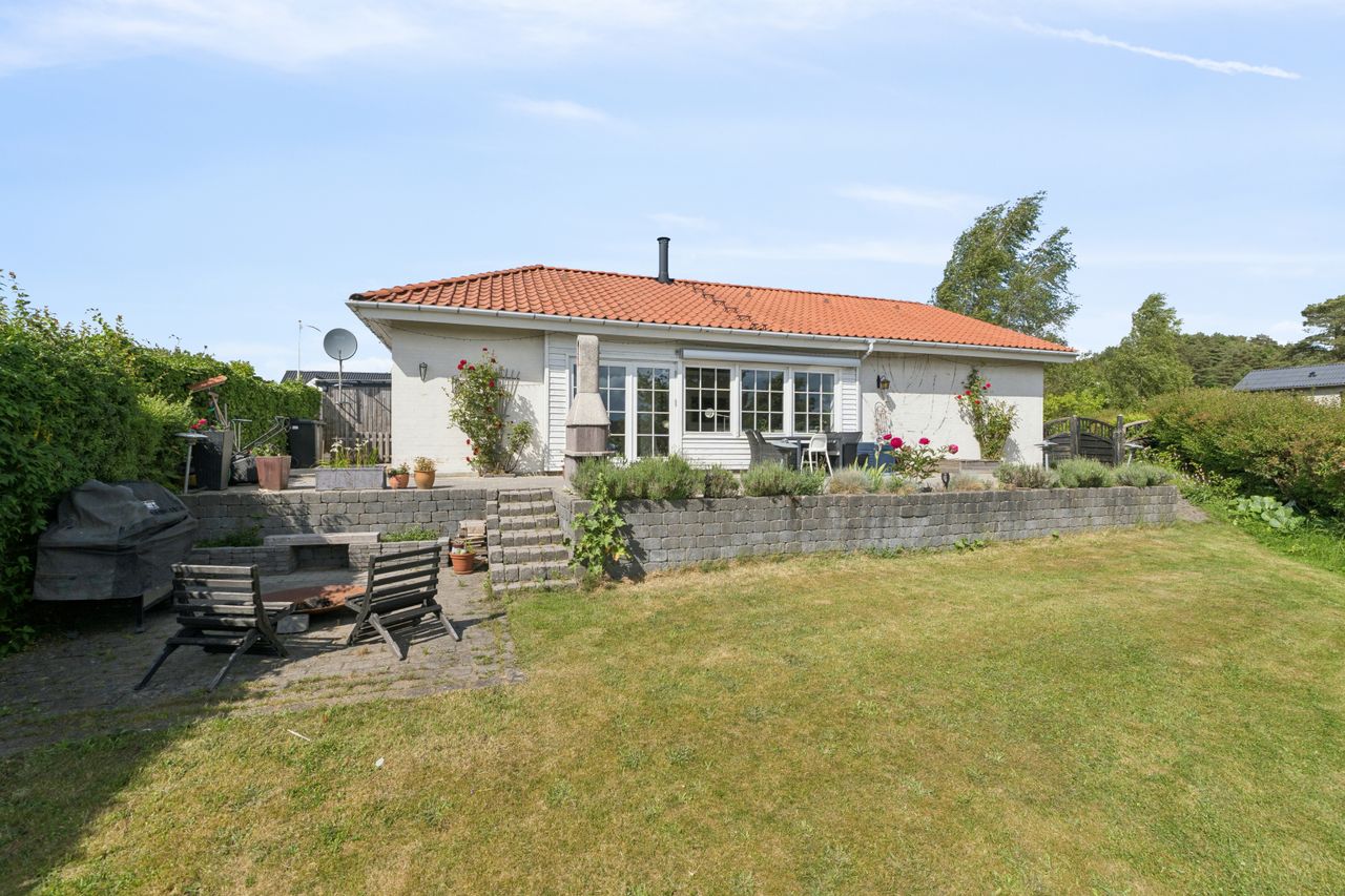 Indendørs byder boligen på et lyst og indbydende køkken med spisekrog og klinkegulv, hvorfra der er direkte udgang til terrassen – perfekt til måltider under åben himmel. Den sydvendte stue imponerer med et flot skibsgulv, en hyggelig brændeovn og store vinduespartier, som sammen med dobbeltdørene til terrassen lukker masser af naturligt lys og den omgivende natur ind.