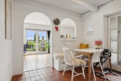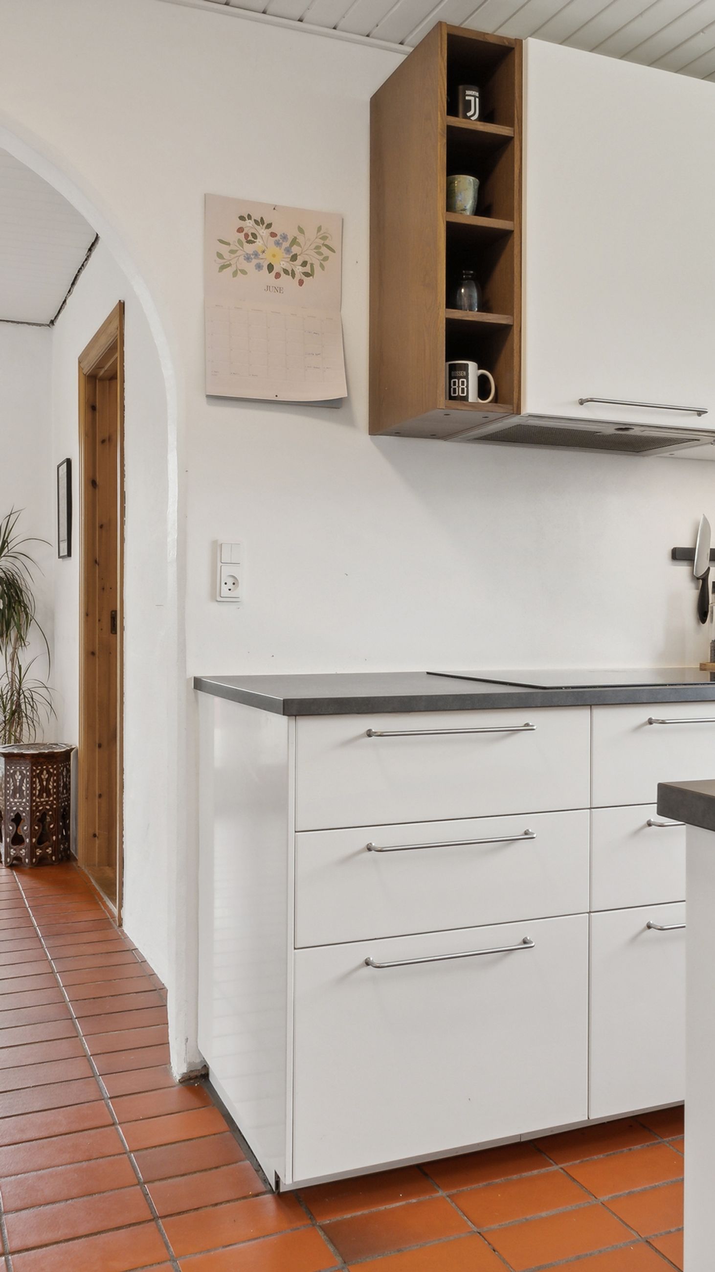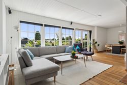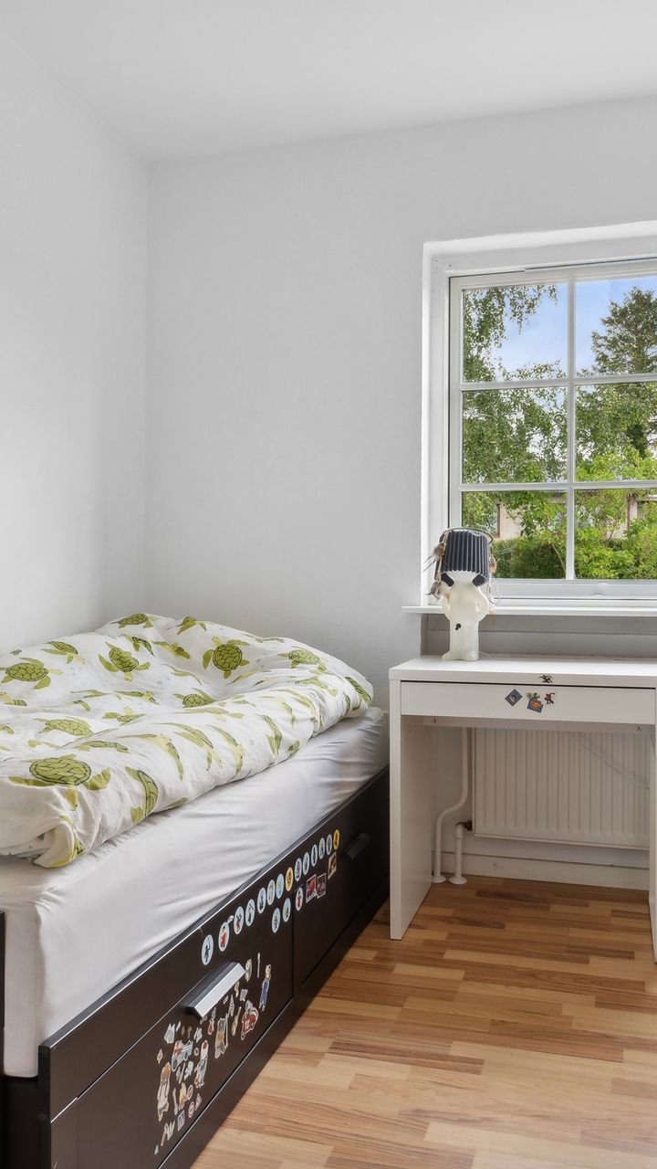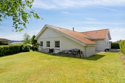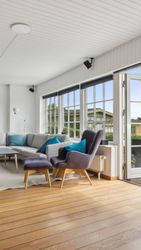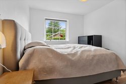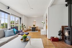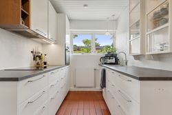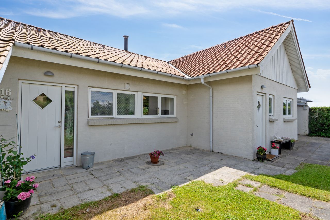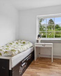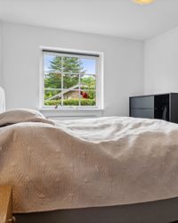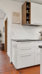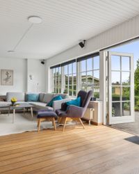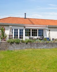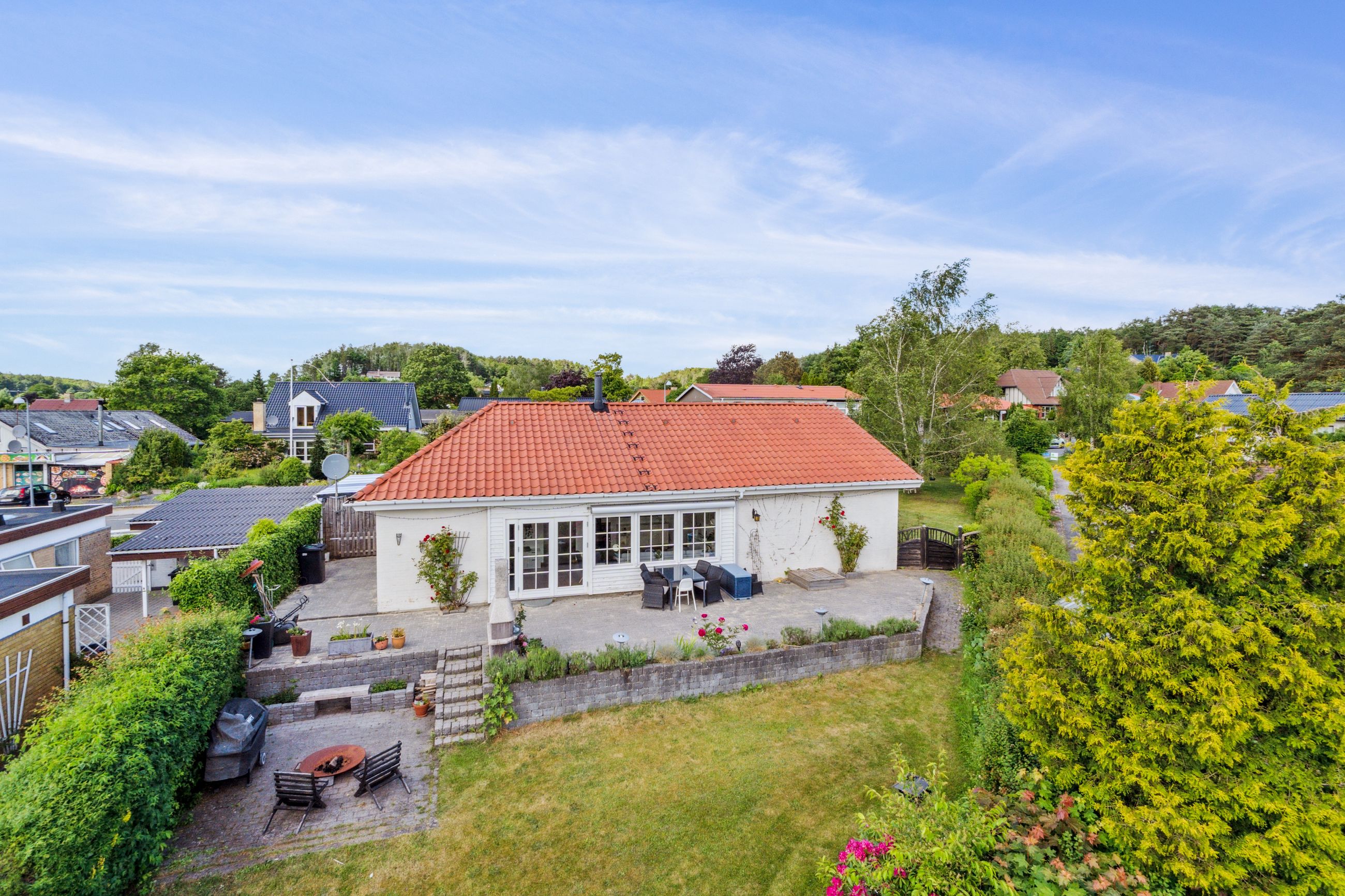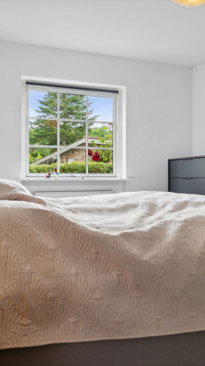 Indendørs byder boligen på et lyst og indbydende køkken med spisekrog og klinkegulv, hvorfra der er direkte udgang til terrassen – perfekt til måltider under åben himmel. Den sydvendte stue imponerer med et flot skibsgulv, en hyggelig brændeovn og store vinduespartier, som sammen med dobbeltdørene til terrassen lukker masser af naturligt lys og den omgivende natur ind.