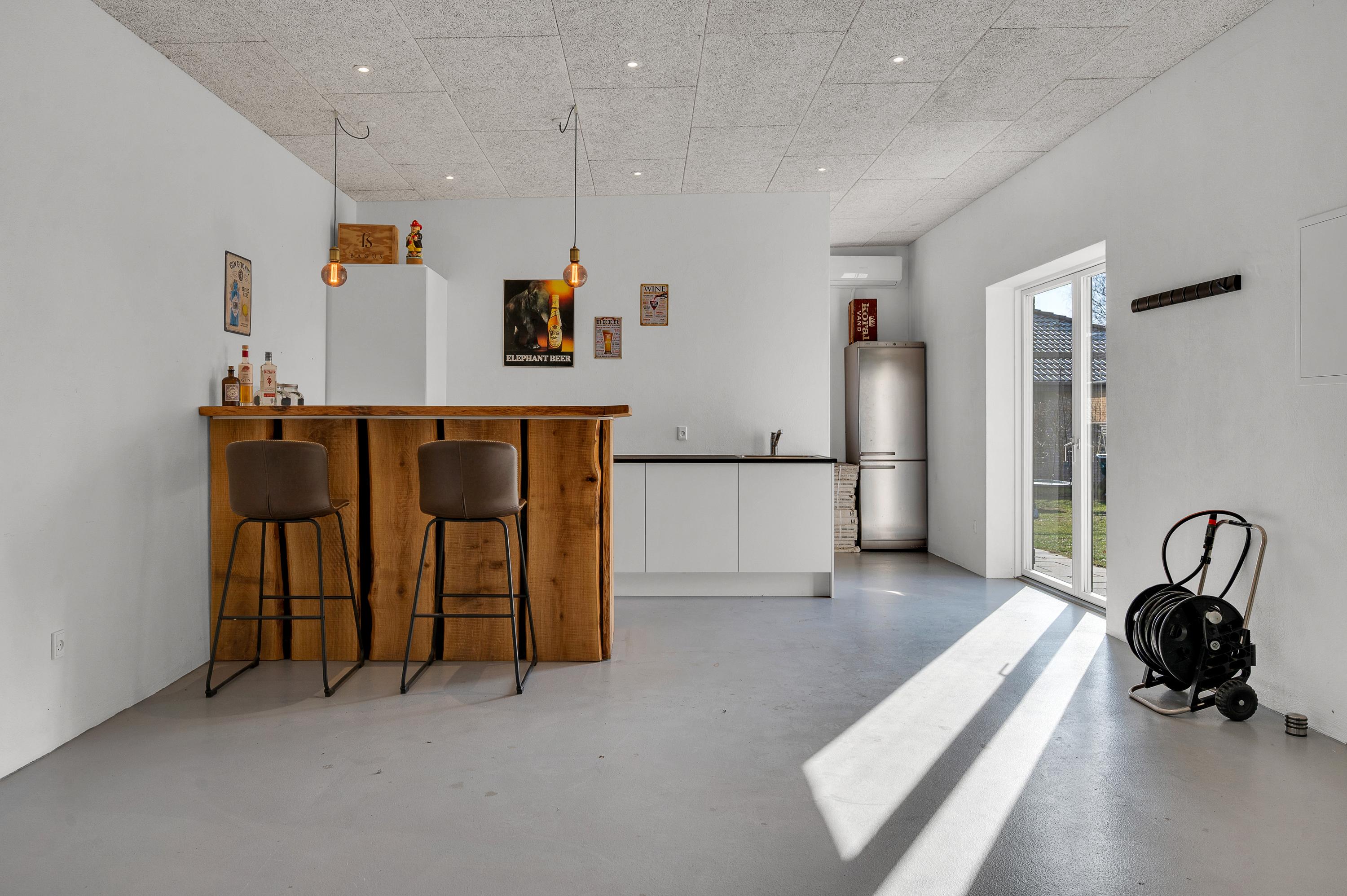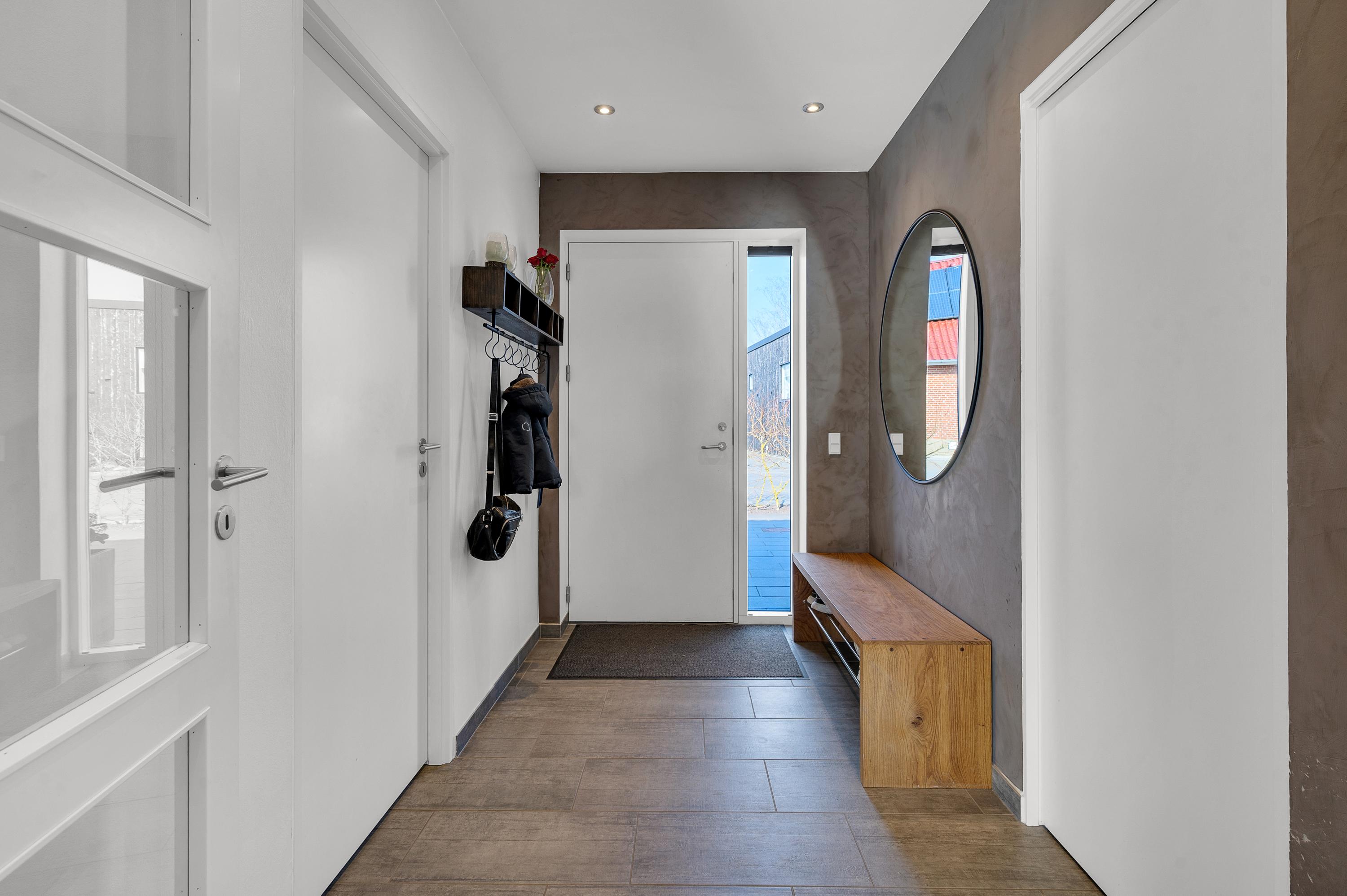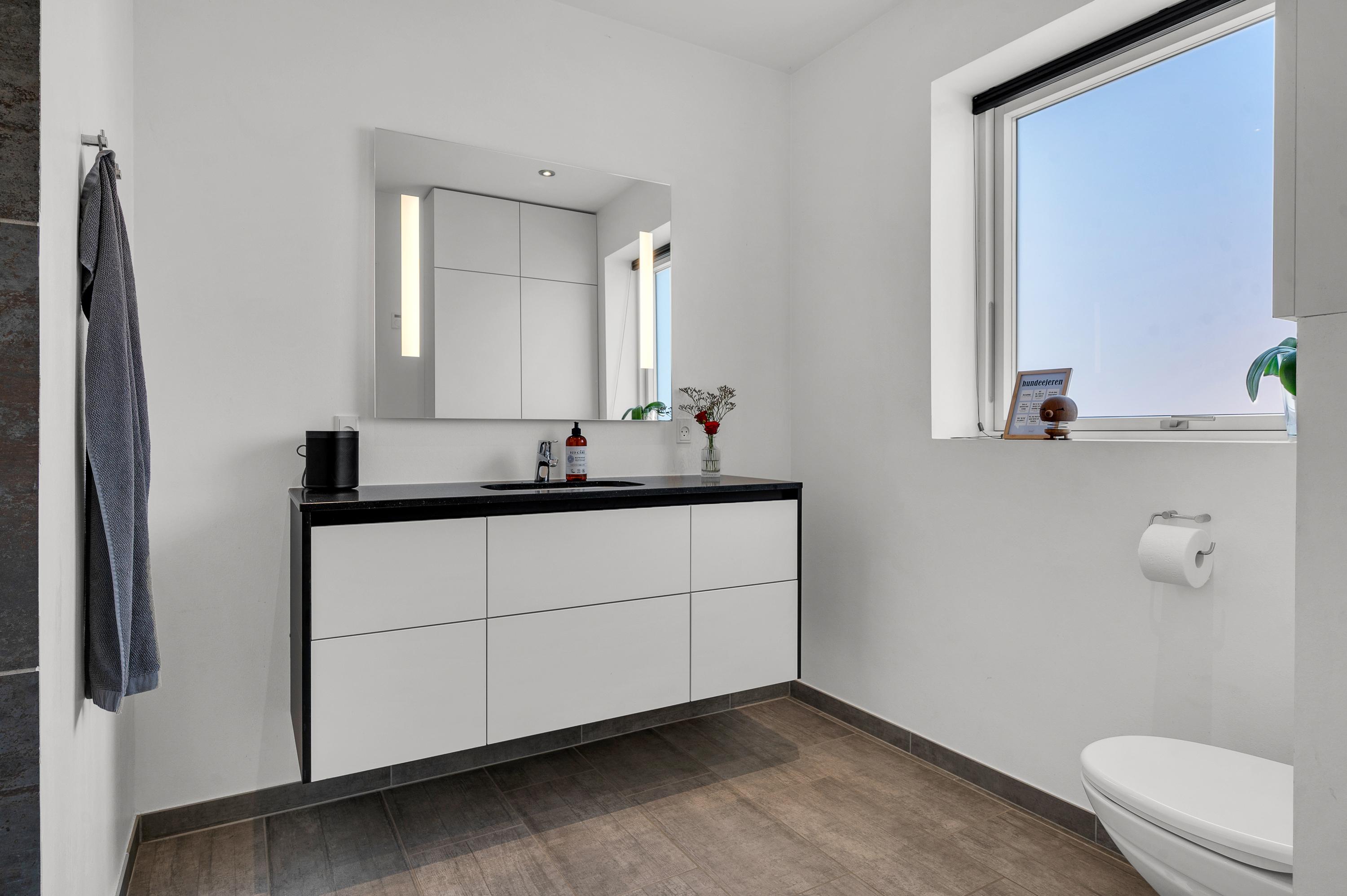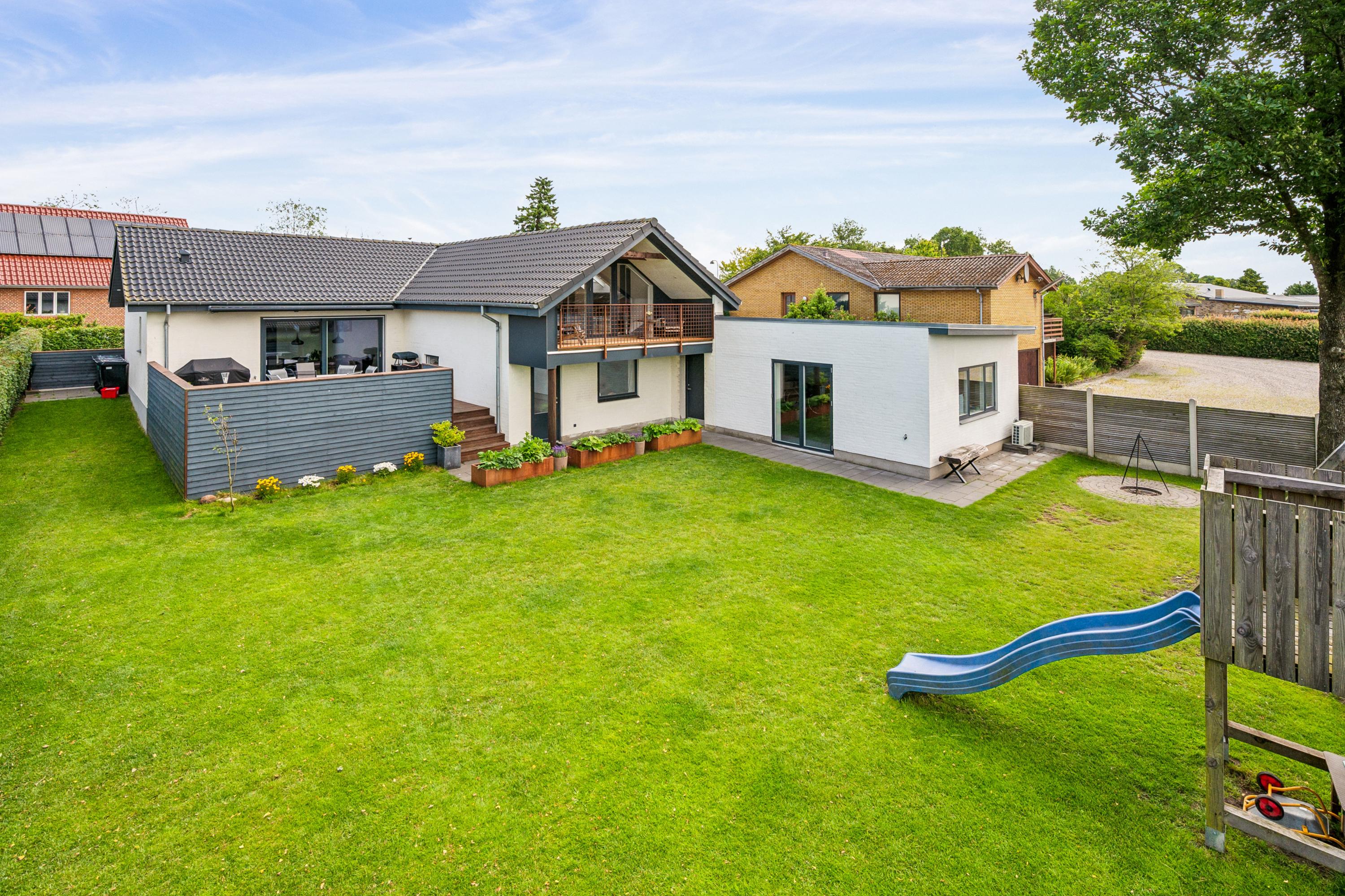 Velkommen til Funder Kirkevej 43 i Funder Kirkeby. Her er en imponerende og totalrenoveret ejendom, hvor kvalitet og æstetik går hånd i hånd. Boligen er opført i flere niveauer, hvilket skaber en dynamisk og spændende rumoplevelse. De rummelige værelser, de to badeværelser og det velindrettede