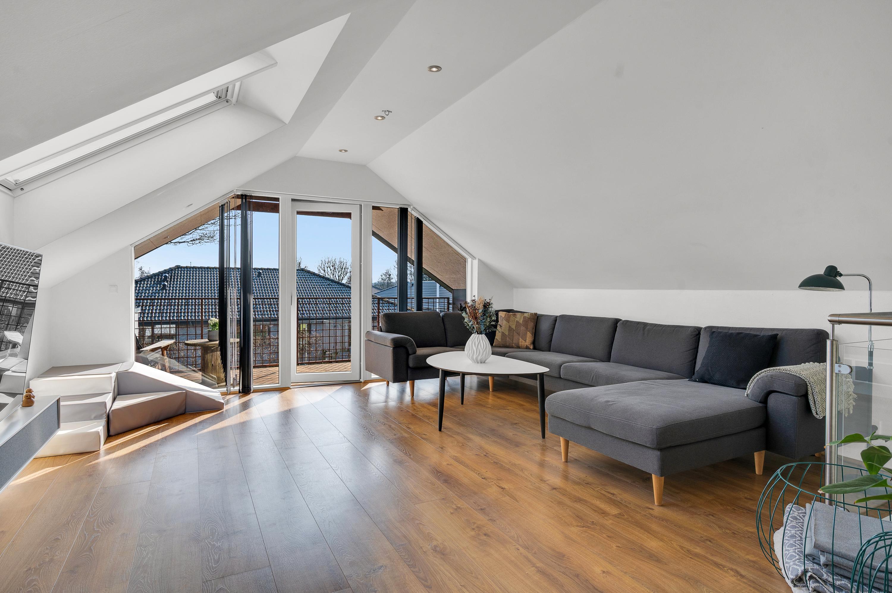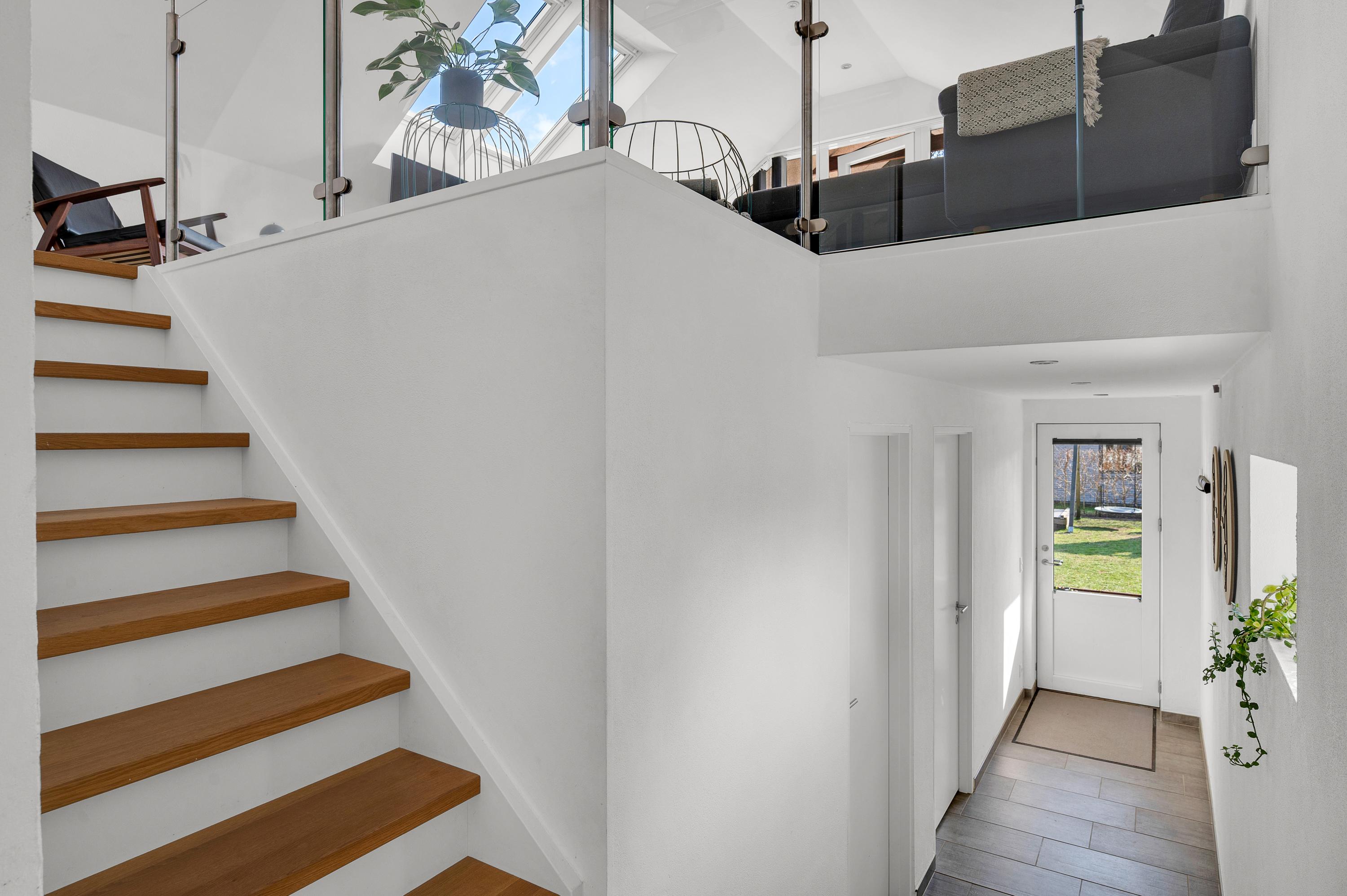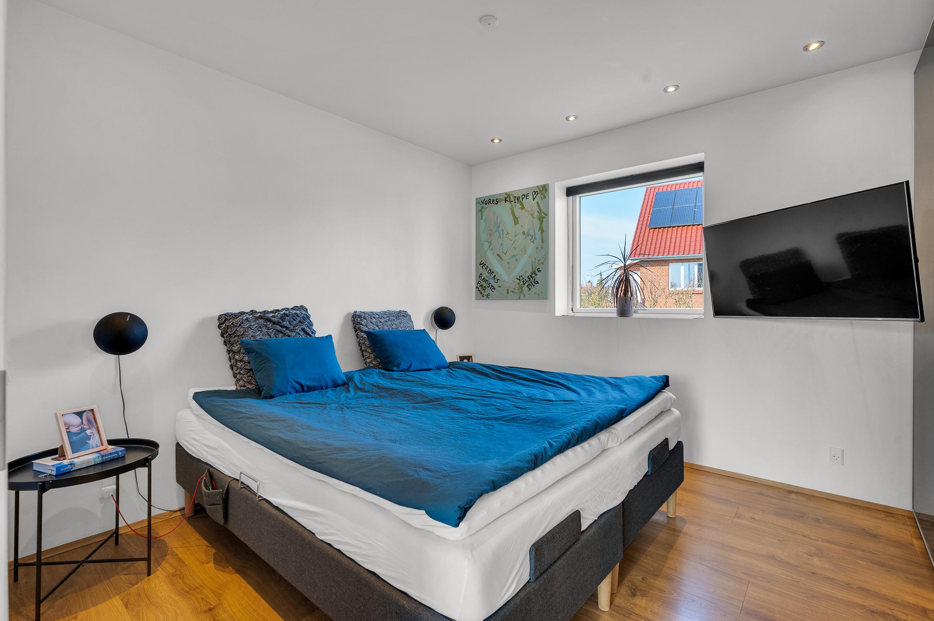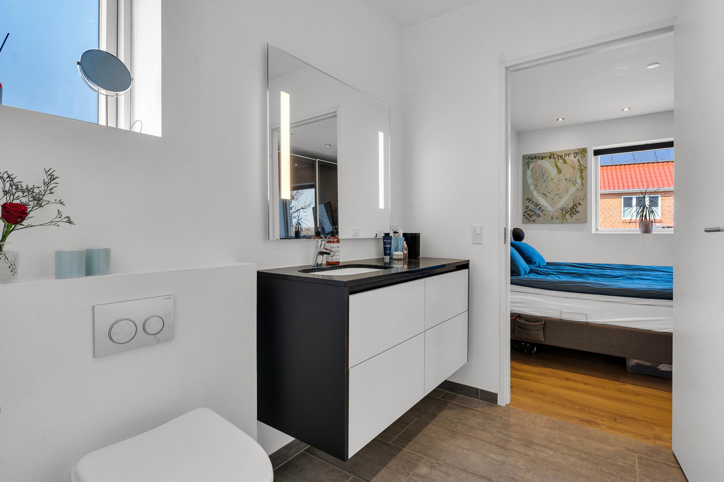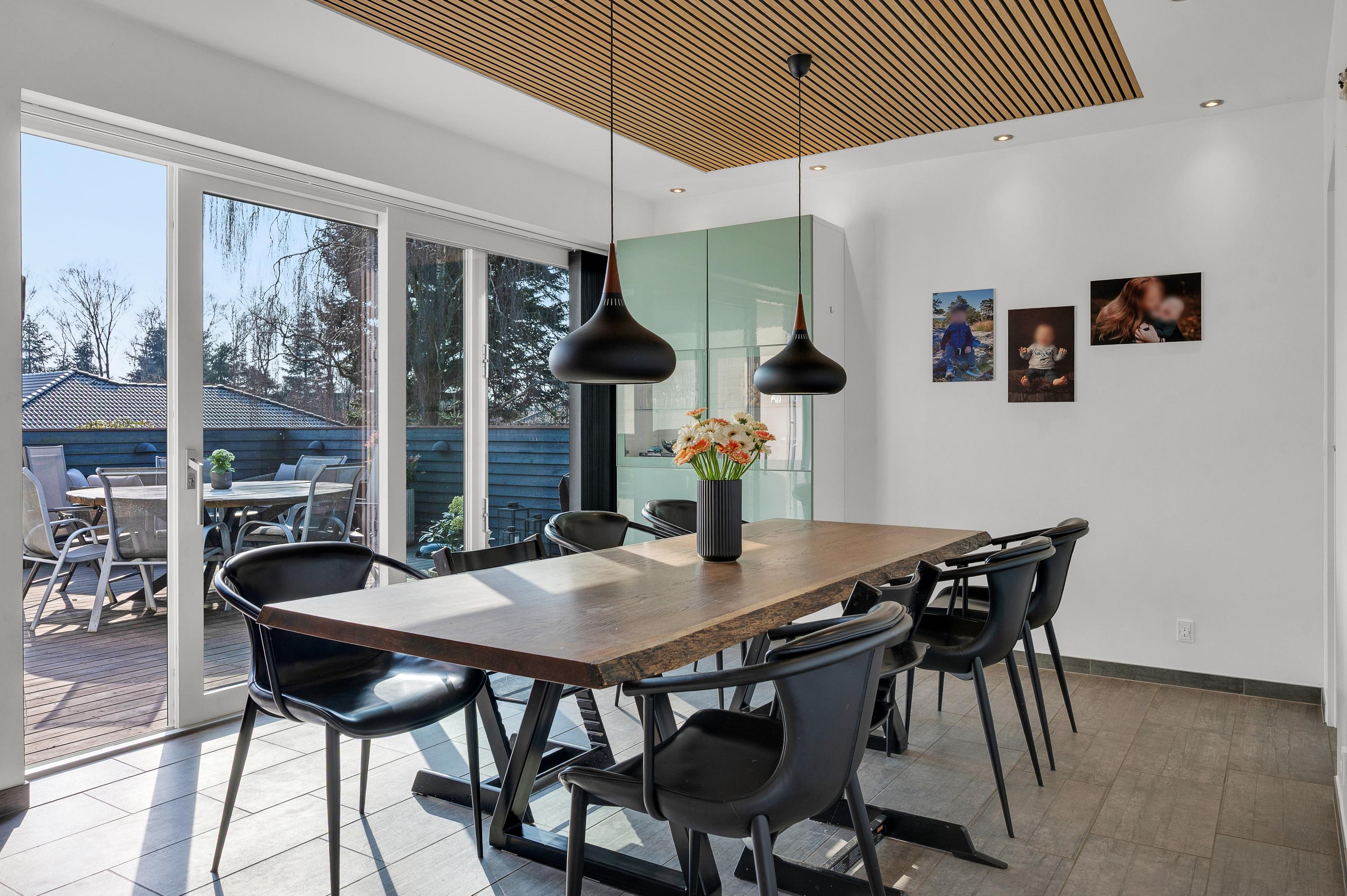 Velkommen til Funder Kirkevej 43 i Funder Kirkeby. Her er en imponerende og totalrenoveret ejendom, hvor kvalitet og æstetik går hånd i hånd. Boligen er opført i flere niveauer, hvilket skaber en dynamisk og spændende rumoplevelse. De rummelige værelser, de to badeværelser og det velindrettede