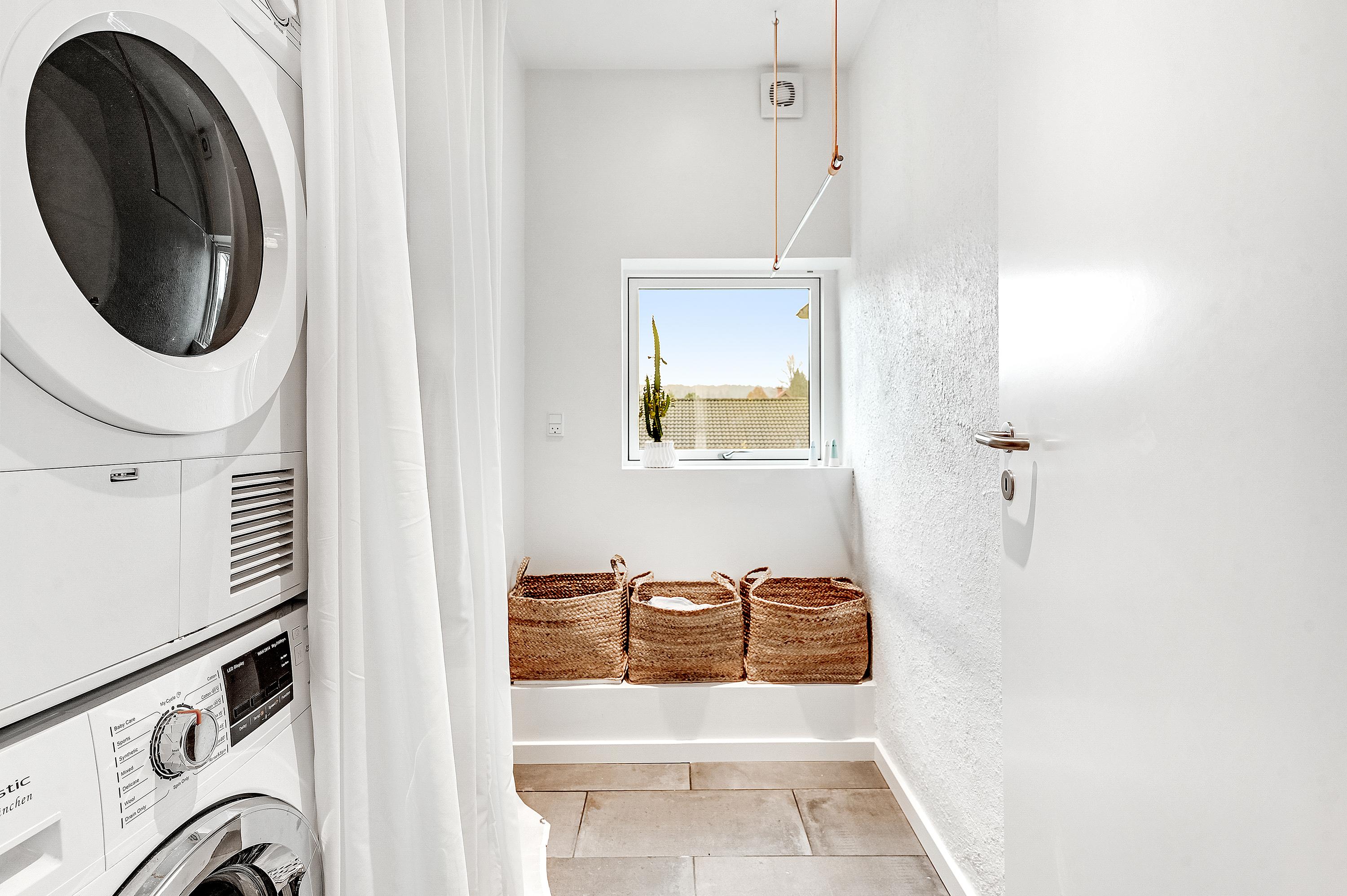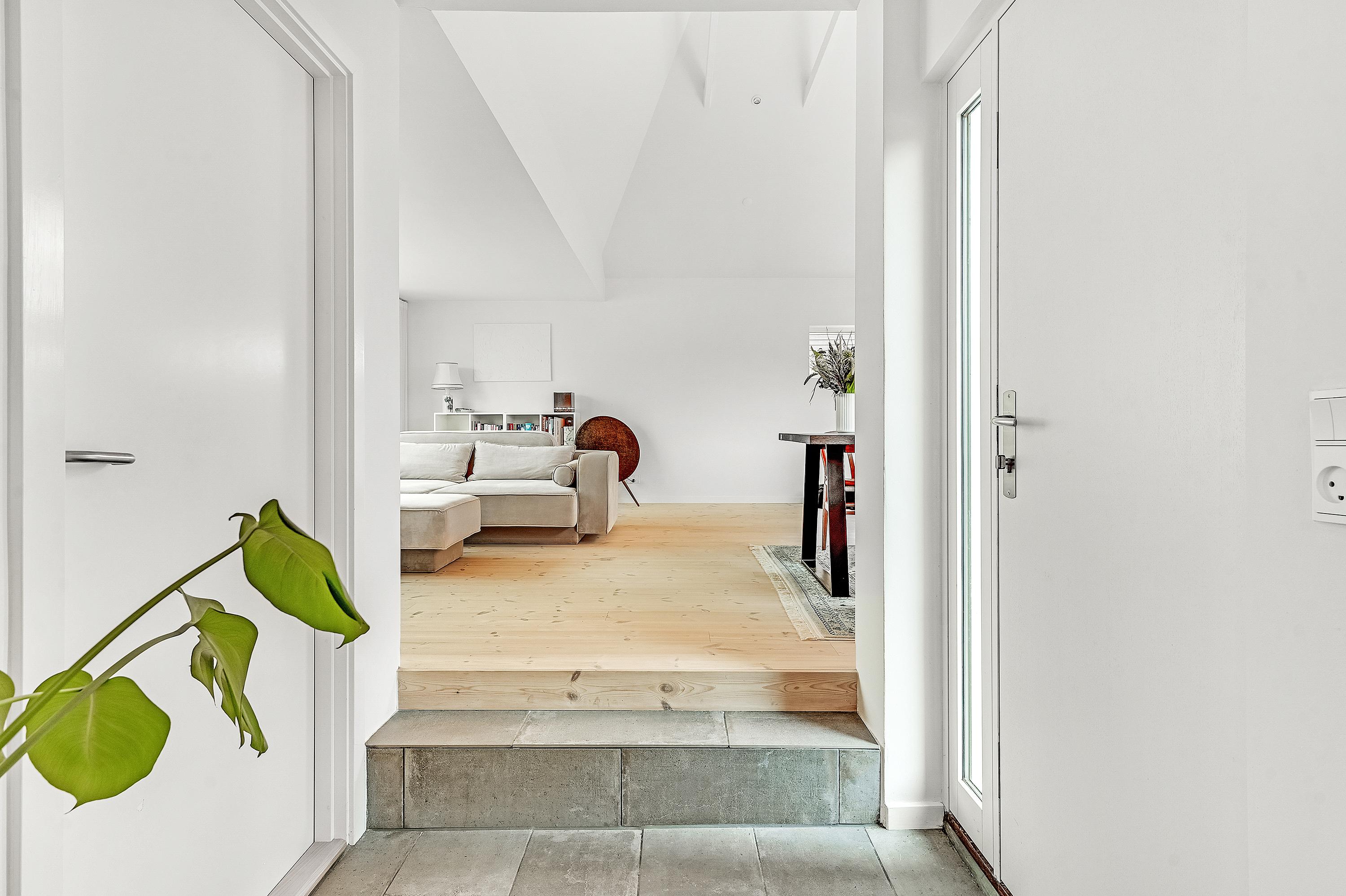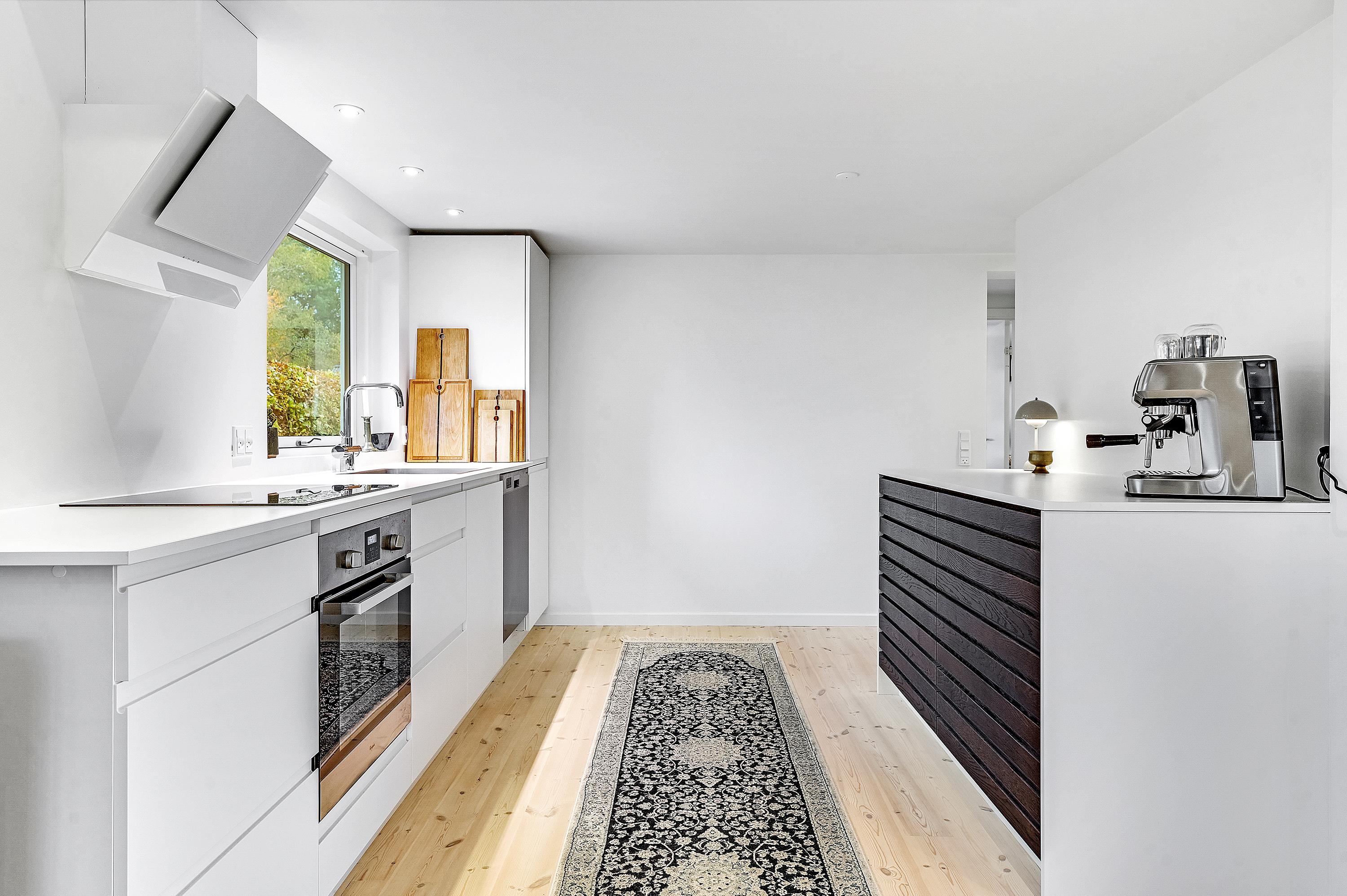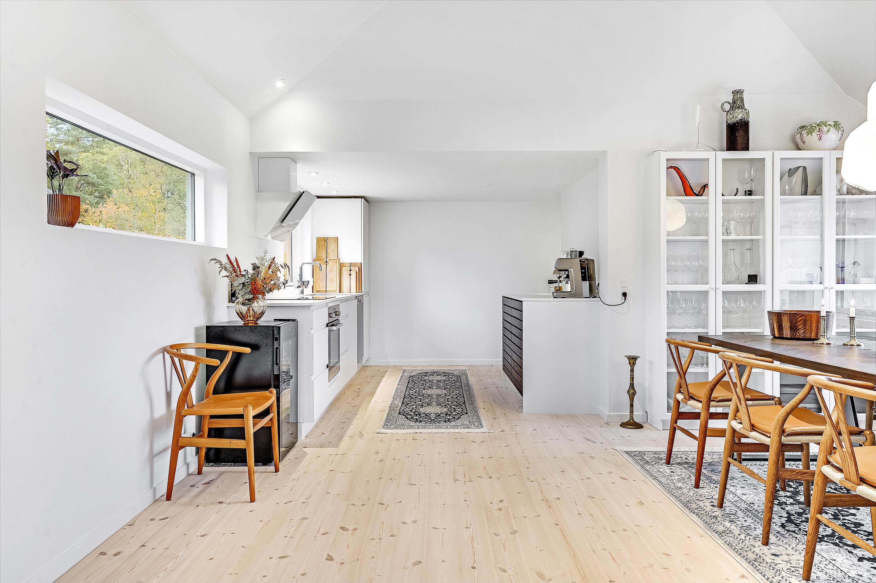 Huset byder på et moderne køkken/alrum og stue i ét med loft til
