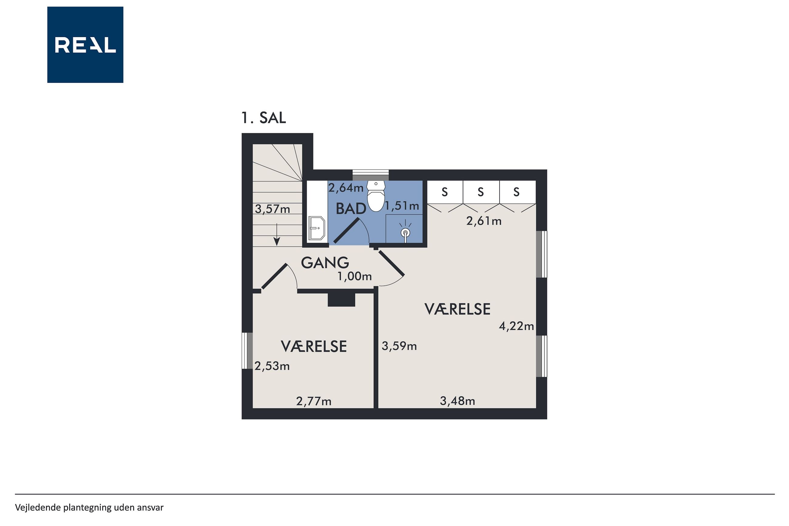 Indenfor mødes du af lyse og indbydende rum. På førstesalen finder du to gode værelser og et lækkert badeværelse – perfekt som børneafdeling eller privat soveområde. Den elegante, hvide trappe fører dig ned til stueplan, hvor entréen åbner op til et skønt og lyst køkken-alrum – hjertet i hjemmet med plads til både madlavning og samvær. Stuen imponerer med sin hyggelige karnap og gennemgående gulve i stilrent betonlook, der tilføjer et moderne touch til de klassiske rammer.