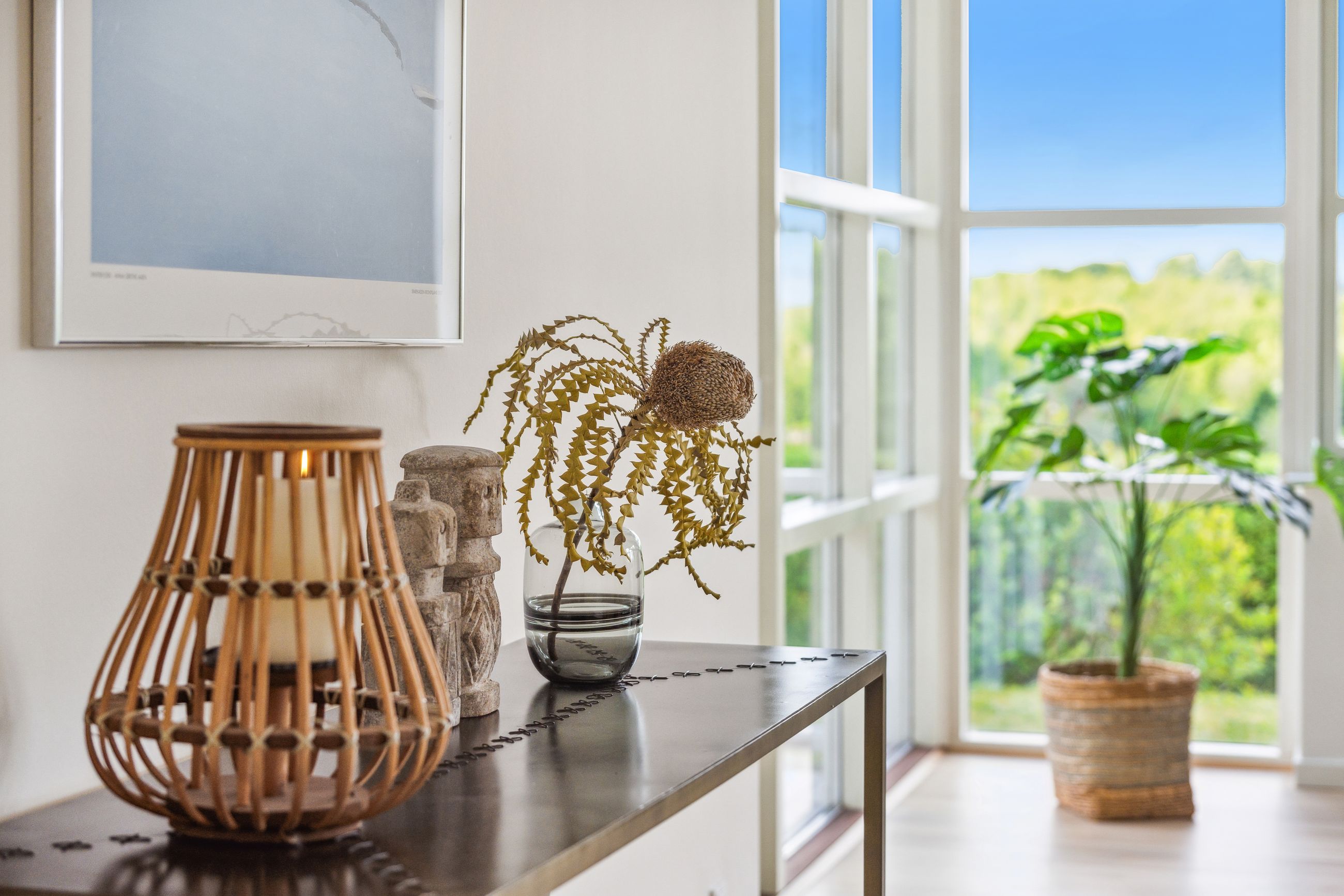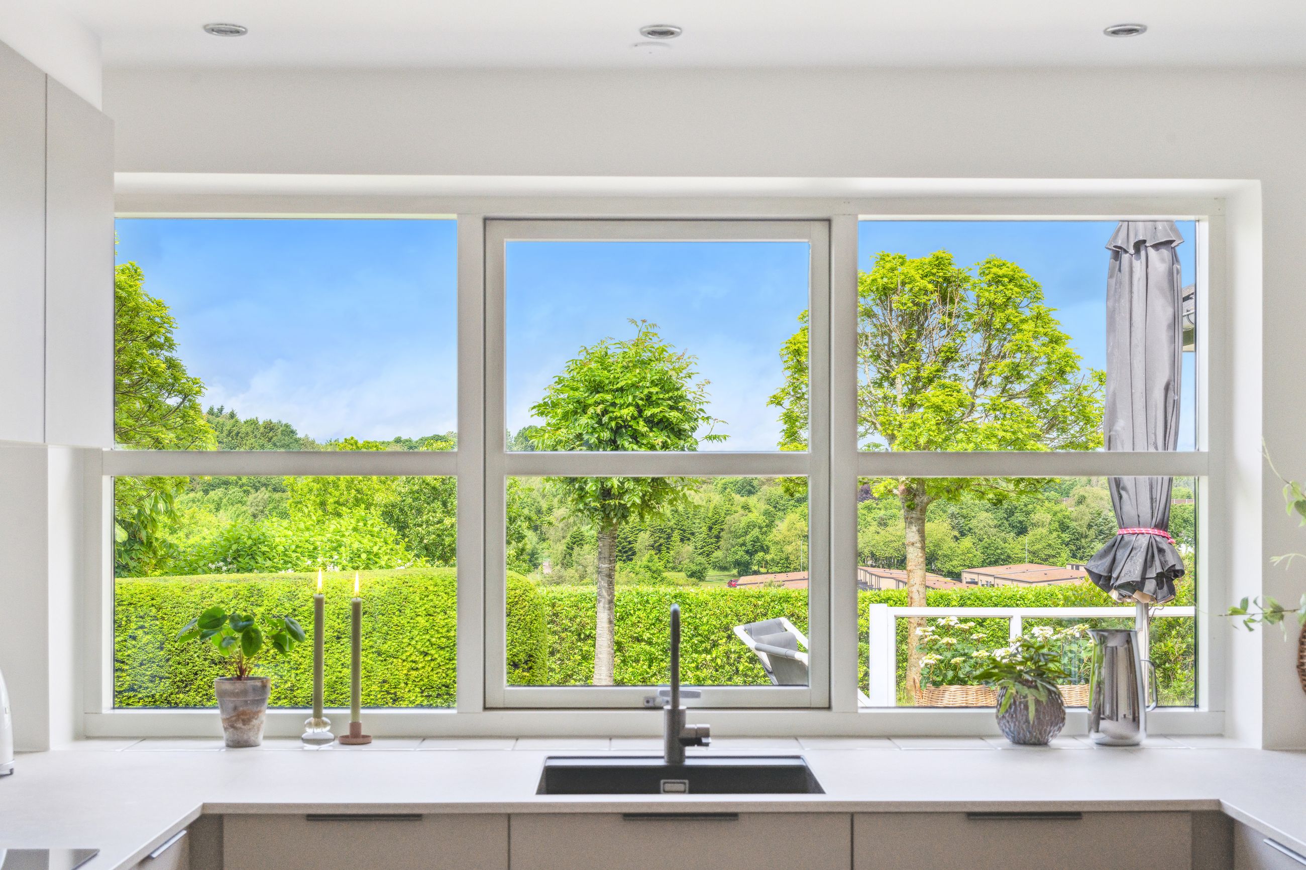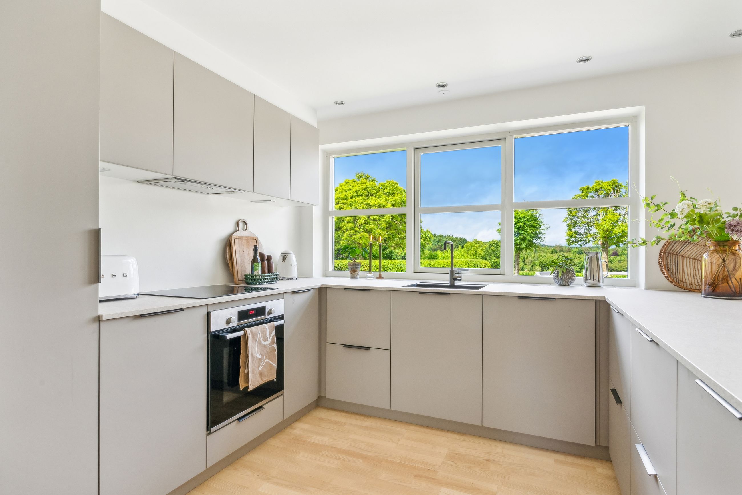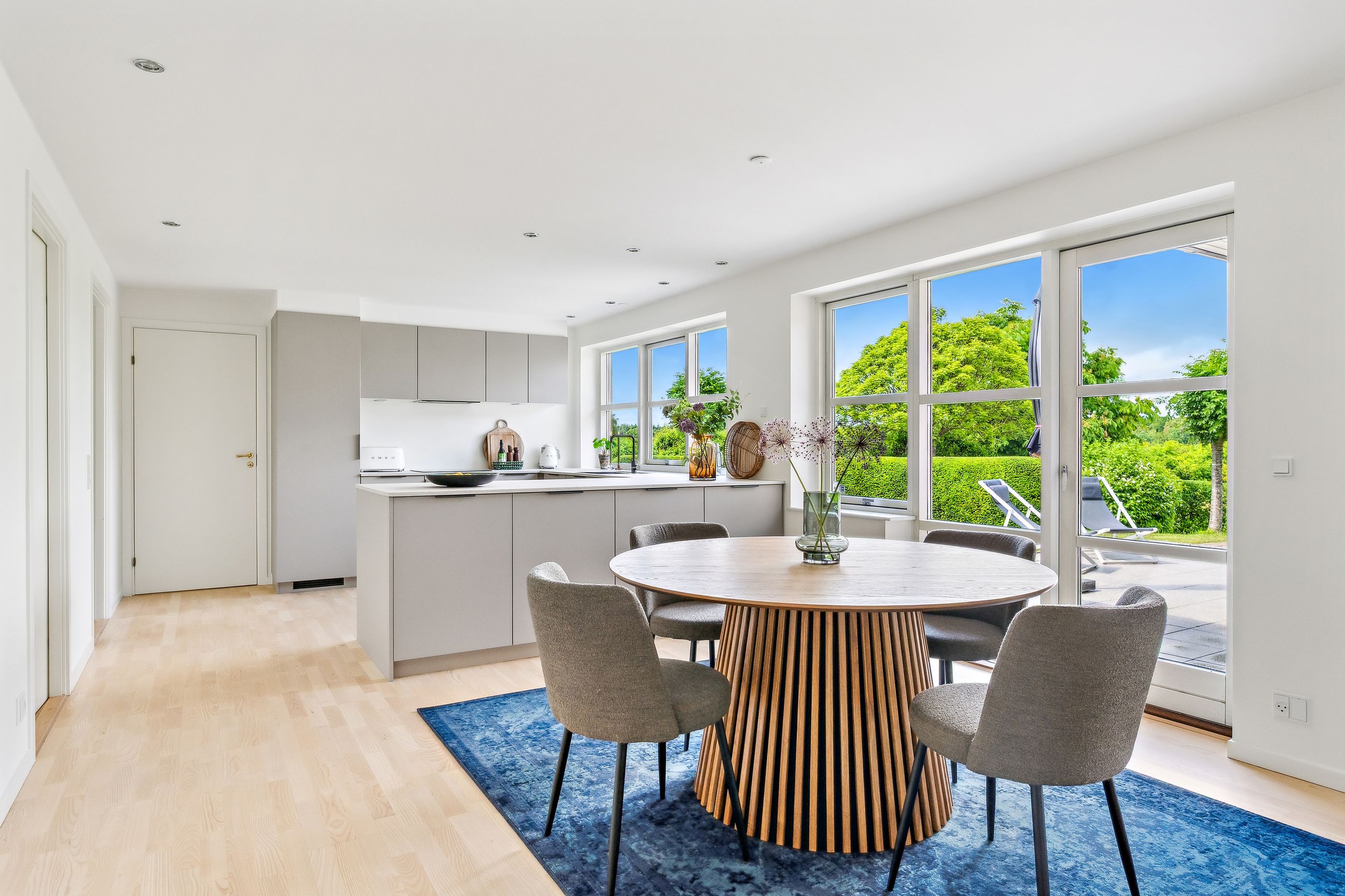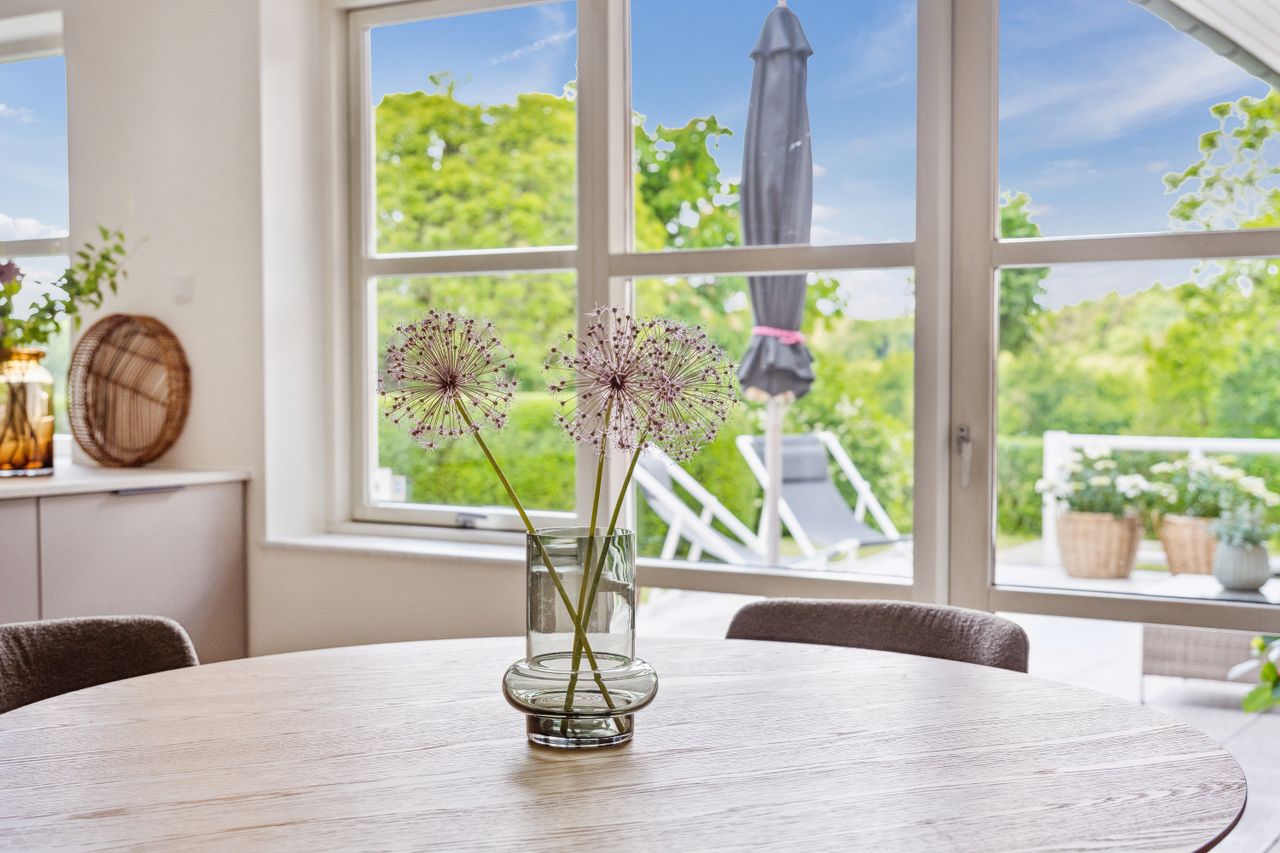 Boligens naturlige samlingspunkt er det store, lyse opholdsrum med køkken/alrum og stue i ét – her strømmer dagslyset ind fra flere verdenshjørner, og de store vinduespartier åbner op for den spektakulære udsigt, der næsten tager pusten fra én. Køkkenet er helt nyt fra 2025 og indrettet med stilrene materialer og moderne løsninger, som gør madlavningen til en fornøjelse.