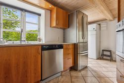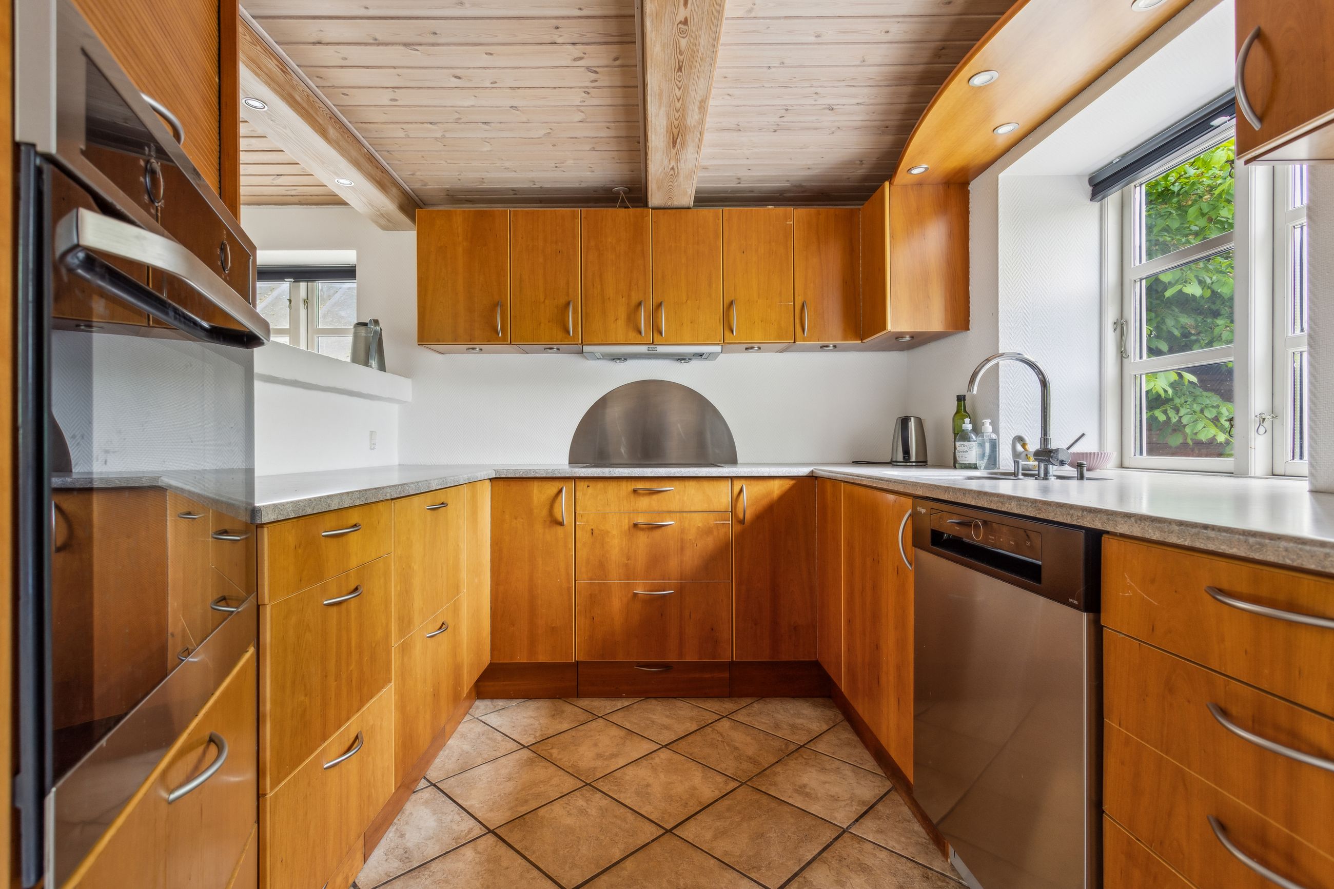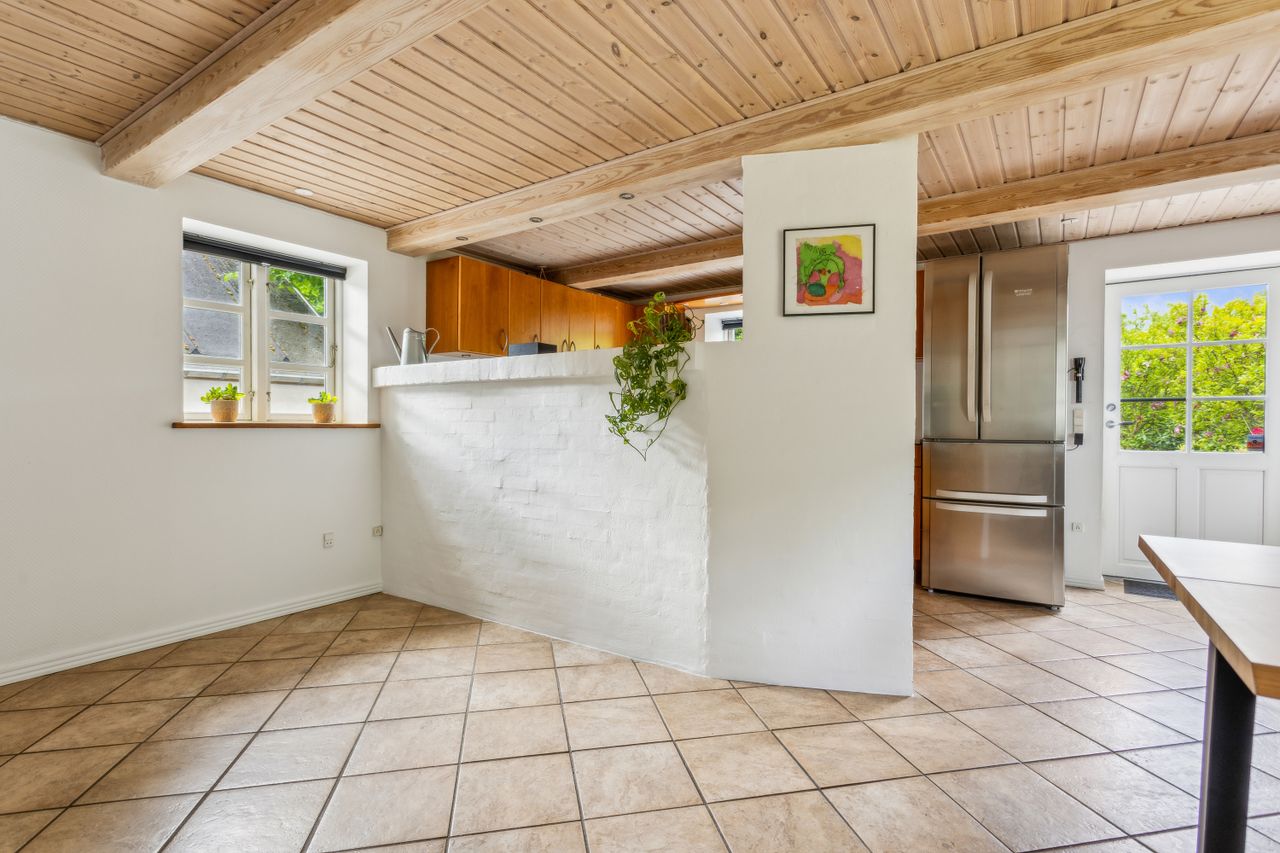 Et skønt køkken/alrum med store vinduespartier og direkte kig ud til den parklignende have, hvor store, gamle træer skaber både læ og stemning