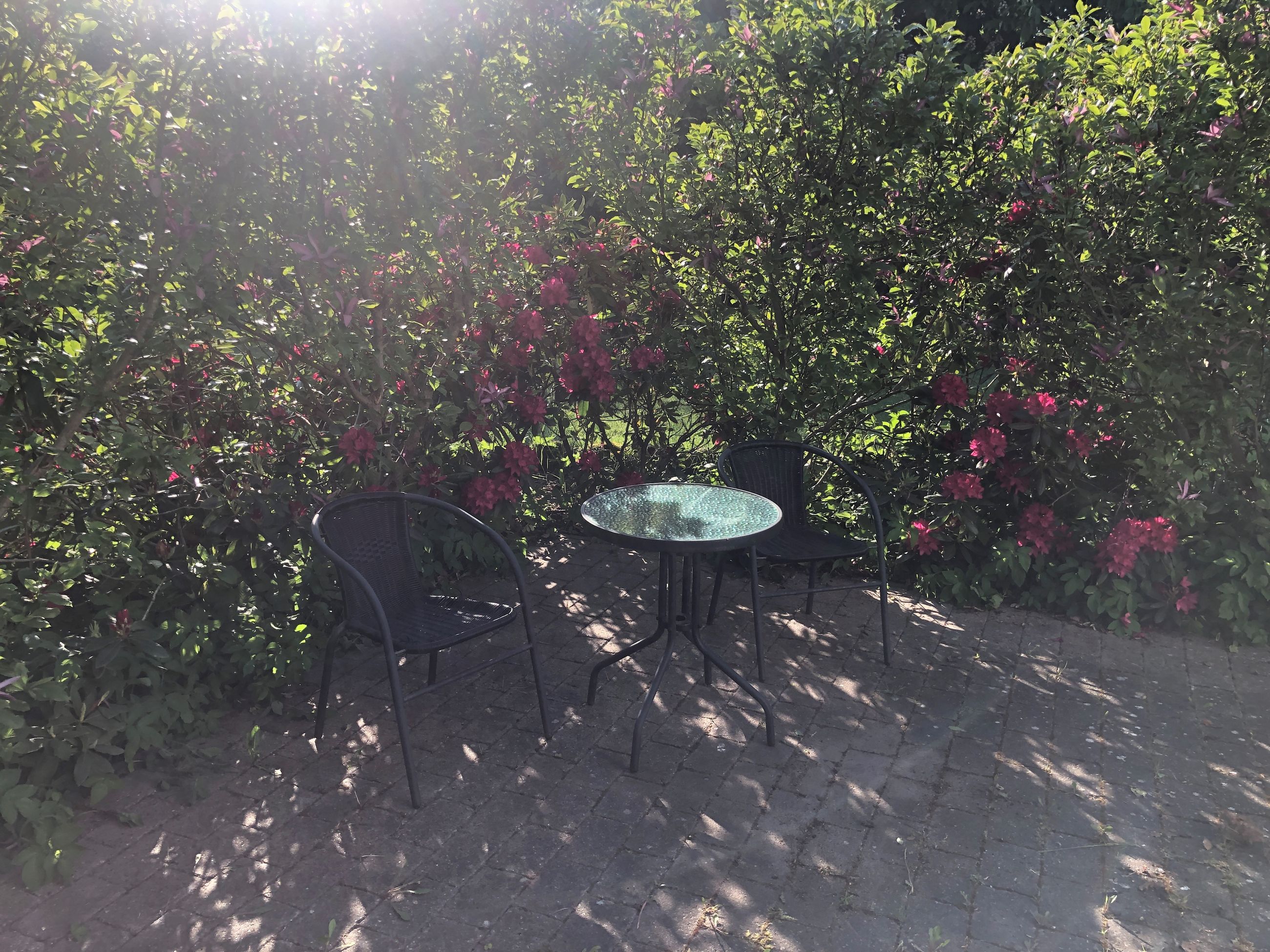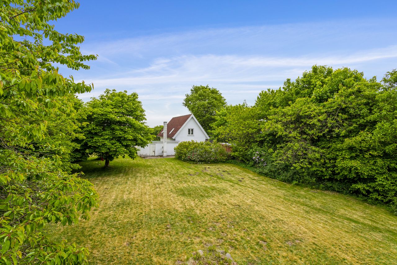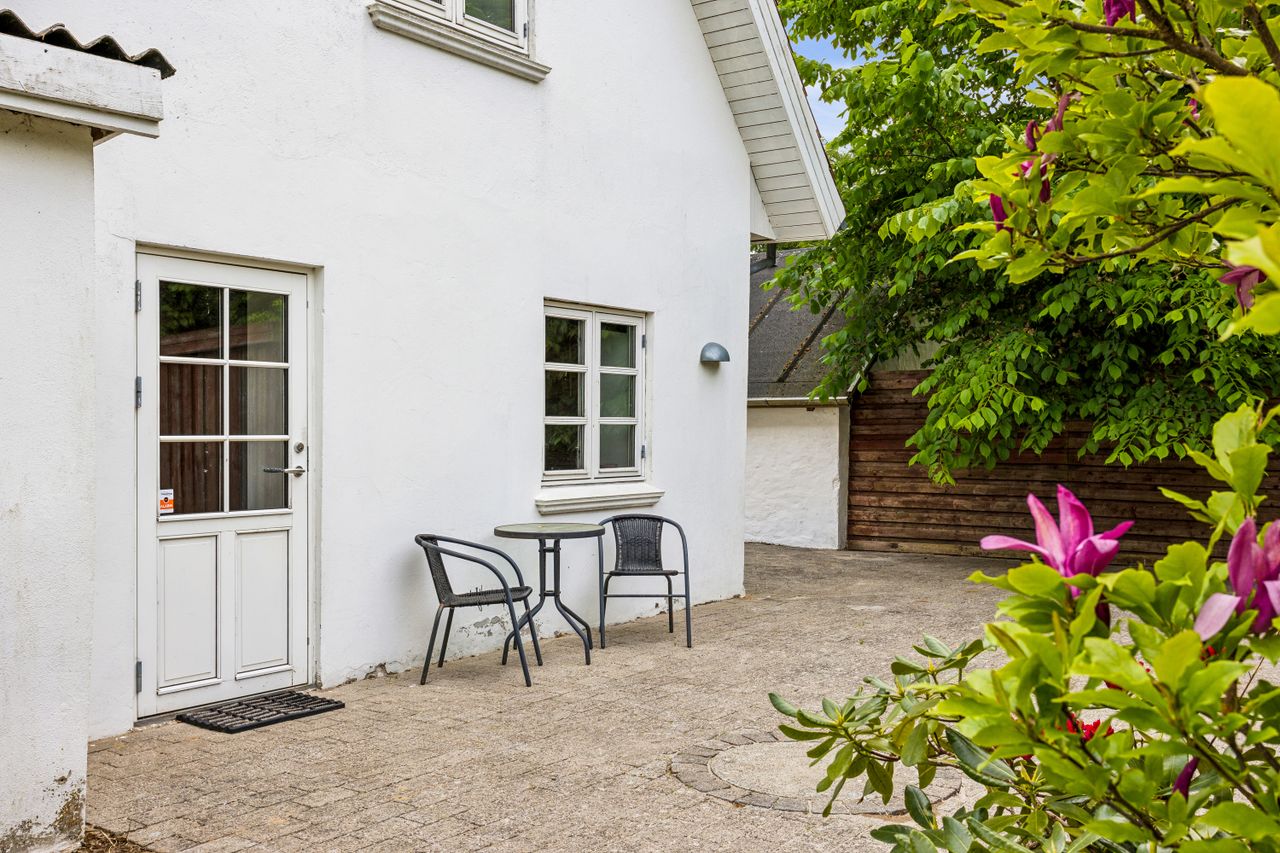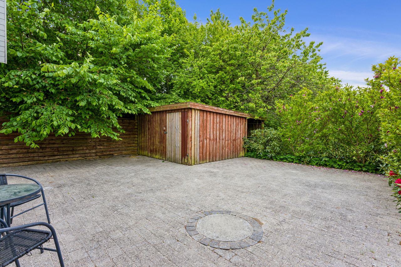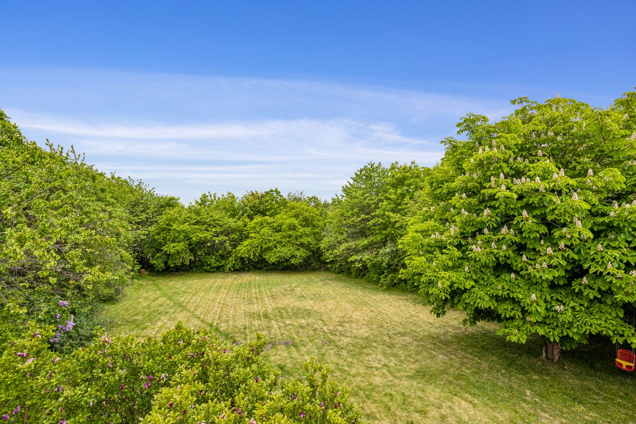 Udenfor fortsætter oplevelsen. Haven er intet mindre end en grøn oase – med sine majestætiske træer og plads til både leg, ro og sommerens grillmiddage. Her får du følelsen af at bo i en privat park.