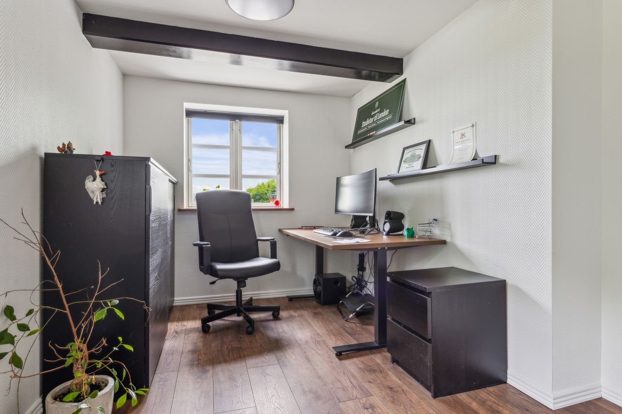 Et hyggeligt børneværelse – i dag indrettet som hjemmekontor med betagende udsigt over åbne marker