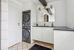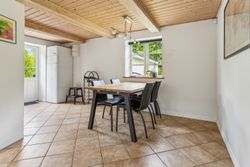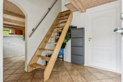 Allerede når du træder ind ad døren, mærker du den varme atmosfære. Den rummelige entré fungerer som boligens hjerte og fordeler elegant til resten af stueetagen. Her finder du: