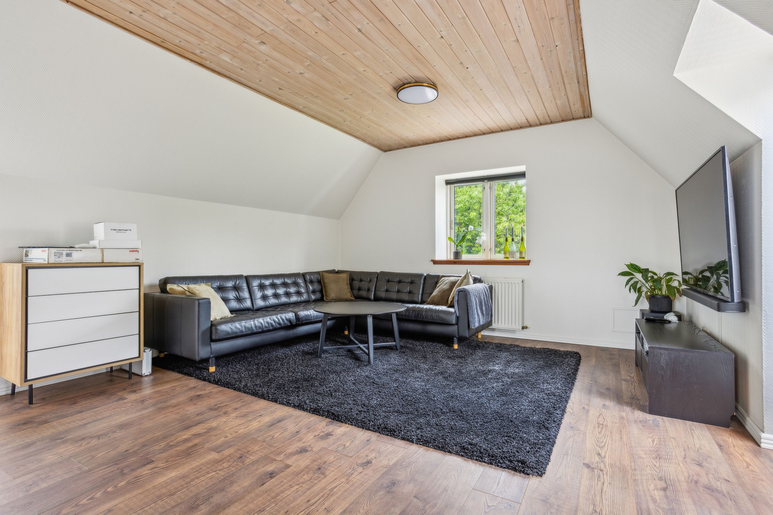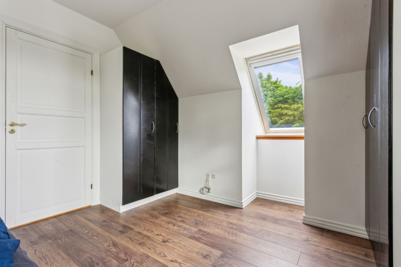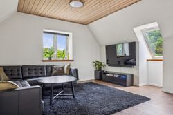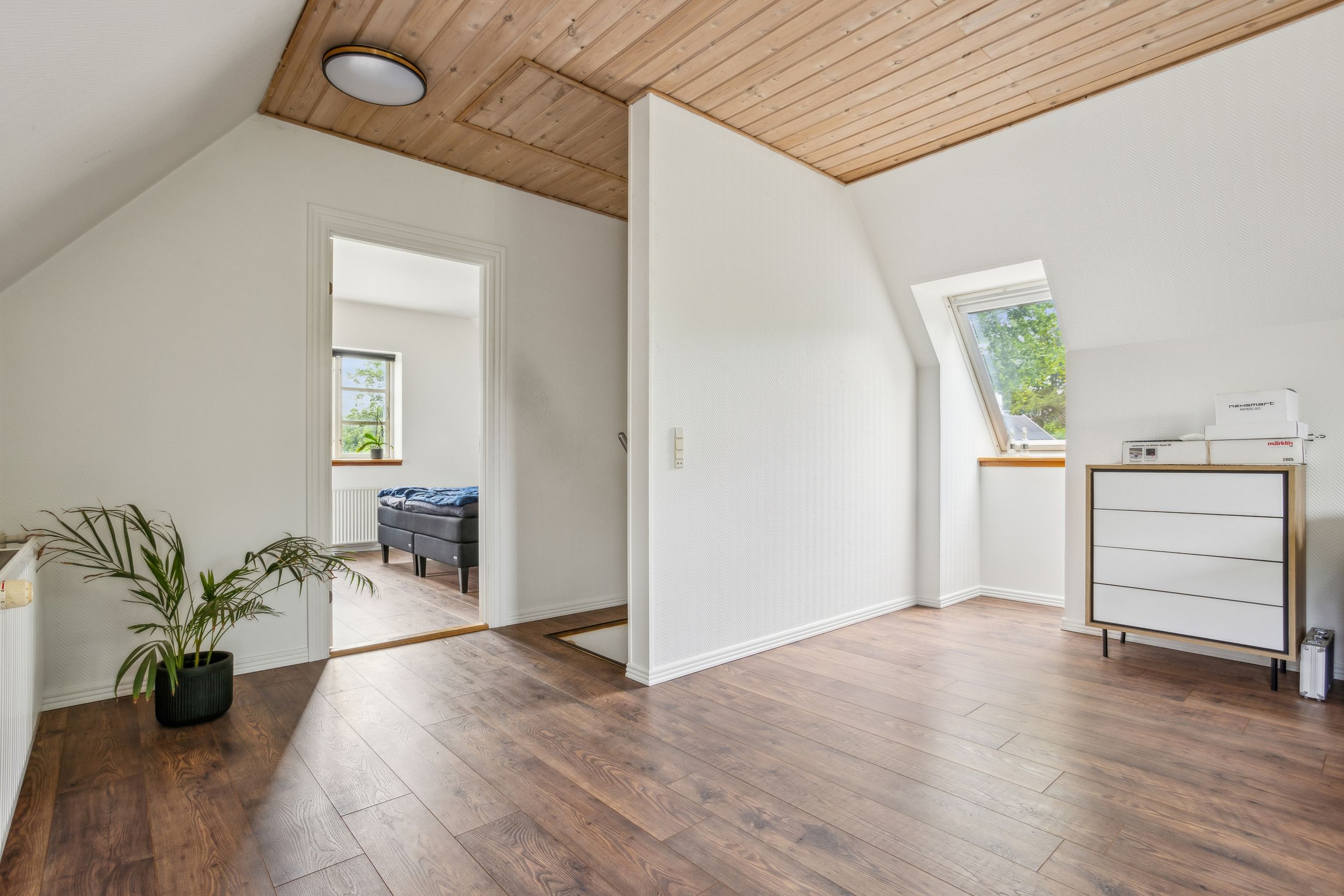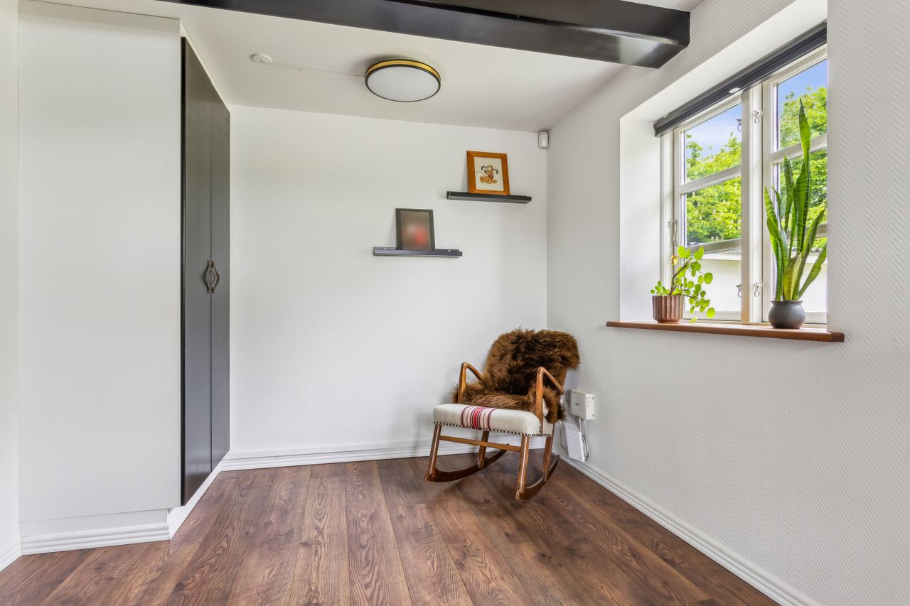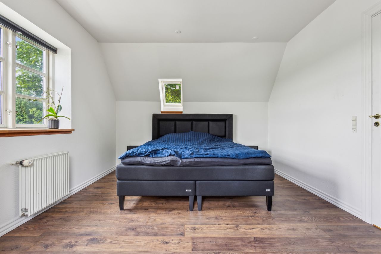 På førstesalen venter boligens hjerterum – en lys og indbydende tv-stue, der indbyder til afslapning og samvær. Heroppe finder du også det rolige soveværelse, hvor morgensolen blidt vækker dig til en ny dag.