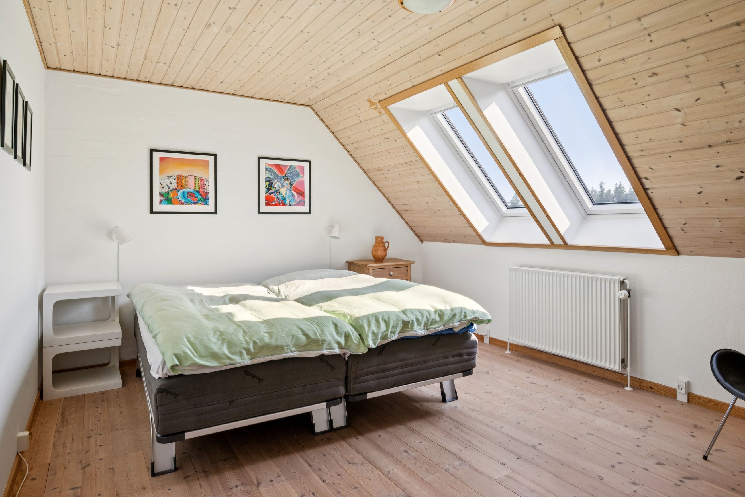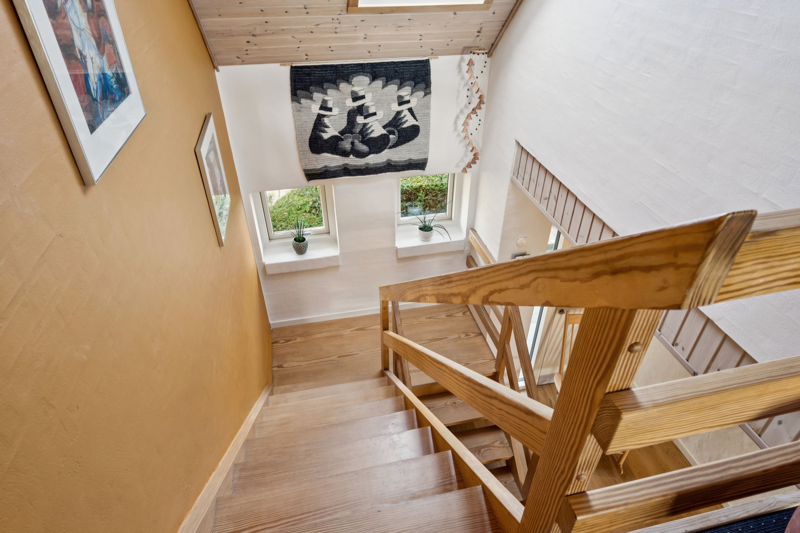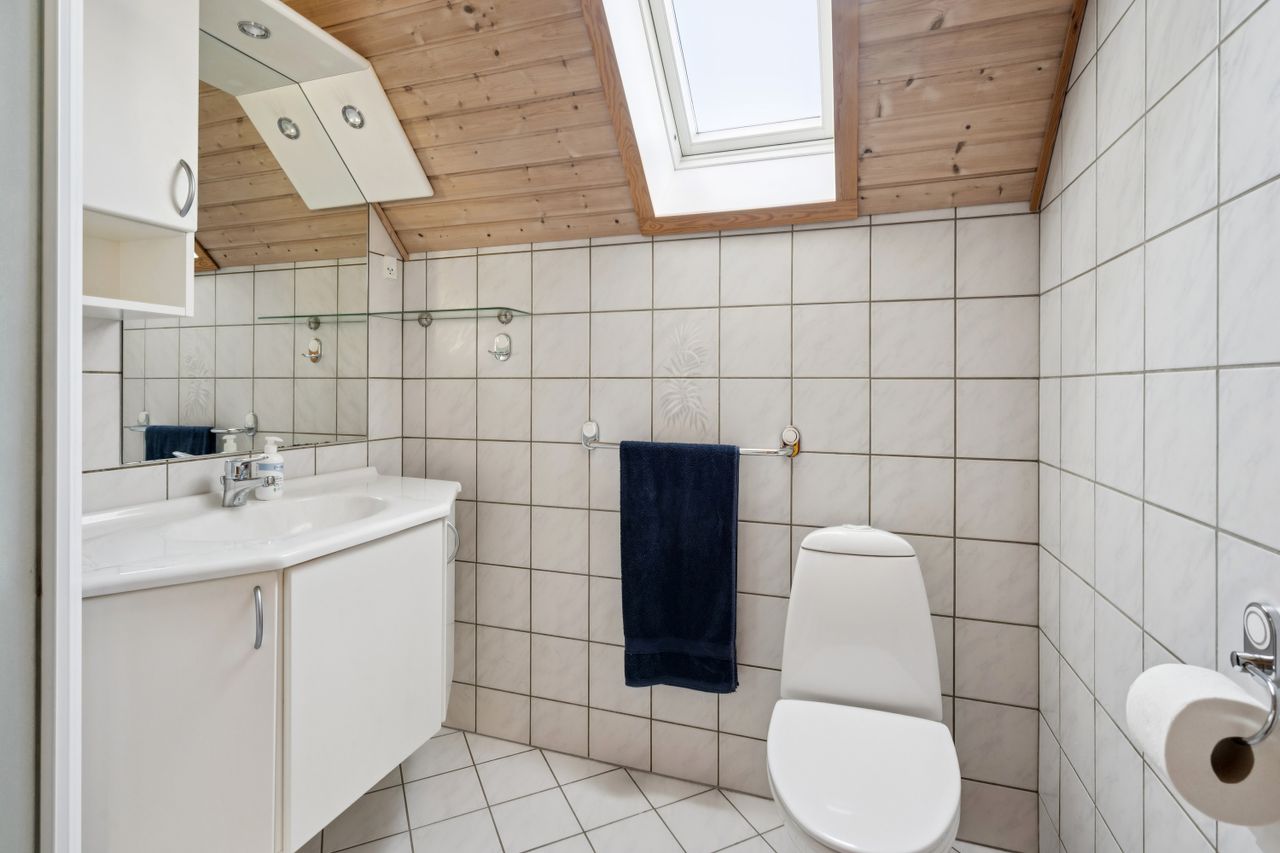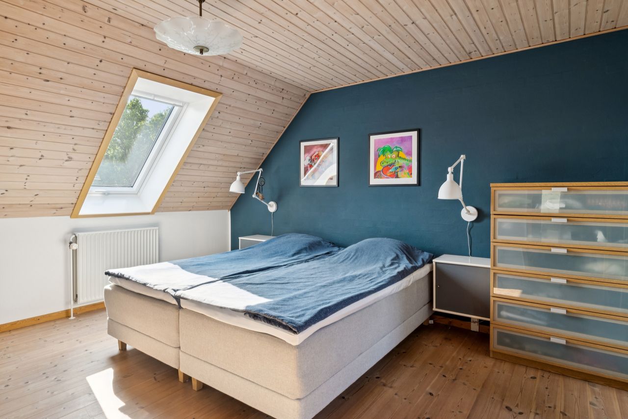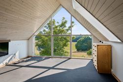 Førstesalen rummer hele fire store værelser og to badeværelser, så her er plads til både familie og fleksibilitet. Det ene værelse egner sig perfekt som multirum eller aktivitetsrum – og herfra kan I nyde den smukkeste udsigt ud over eng, bakker og skov.