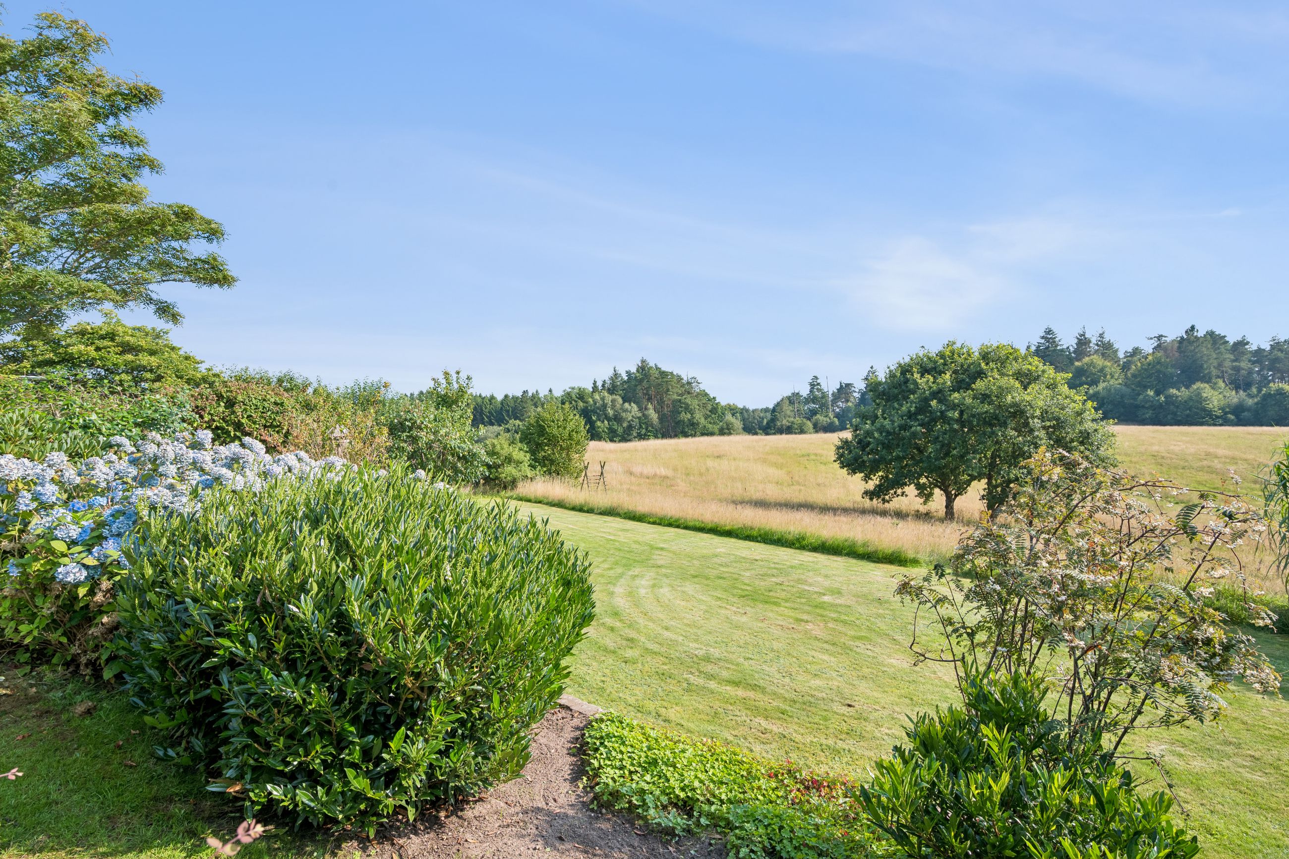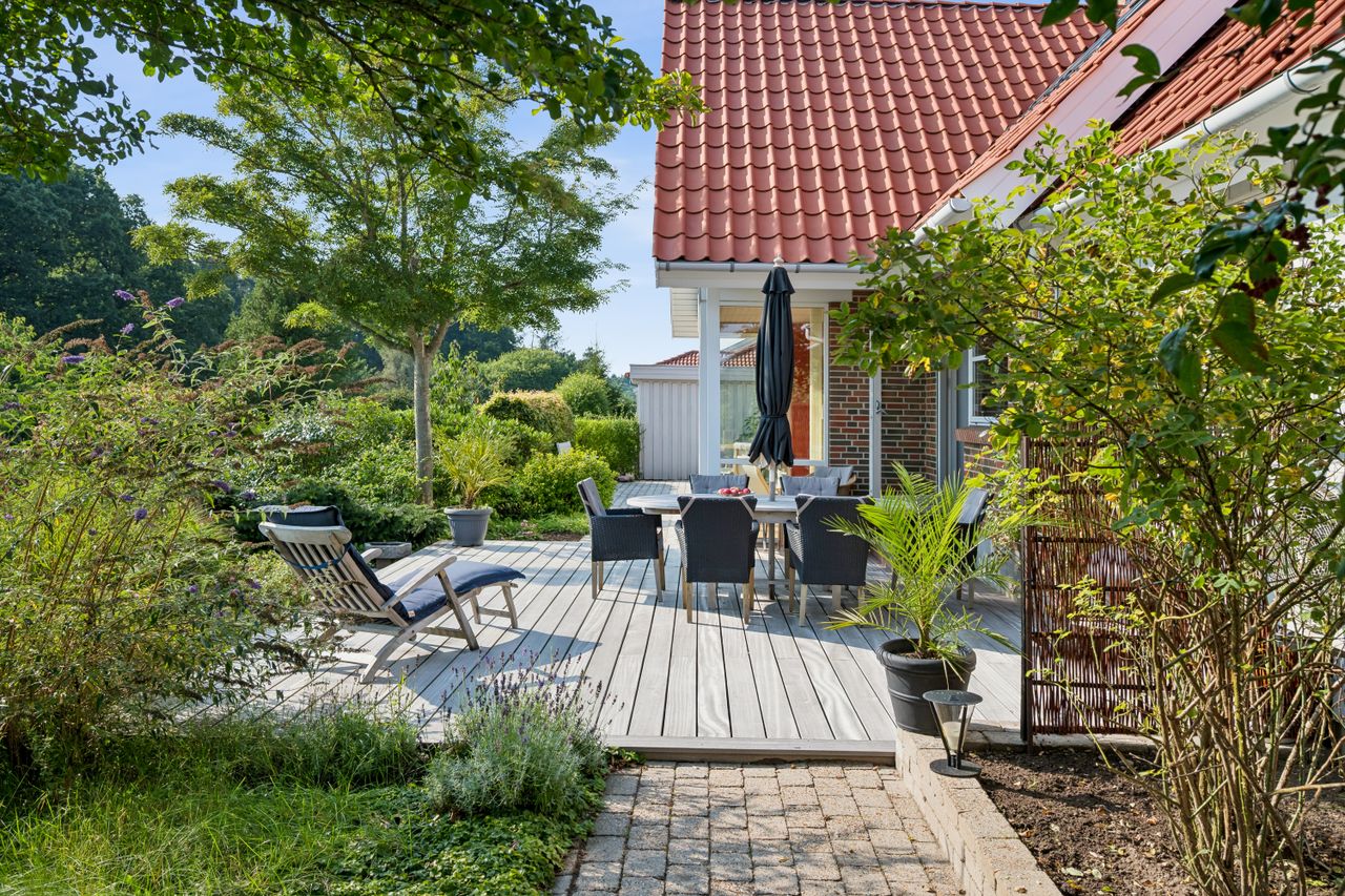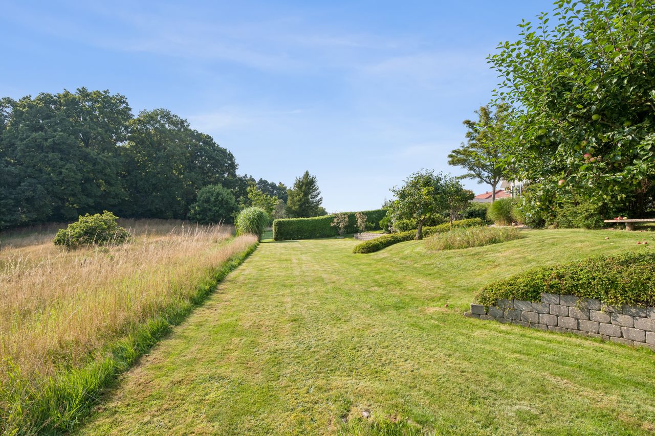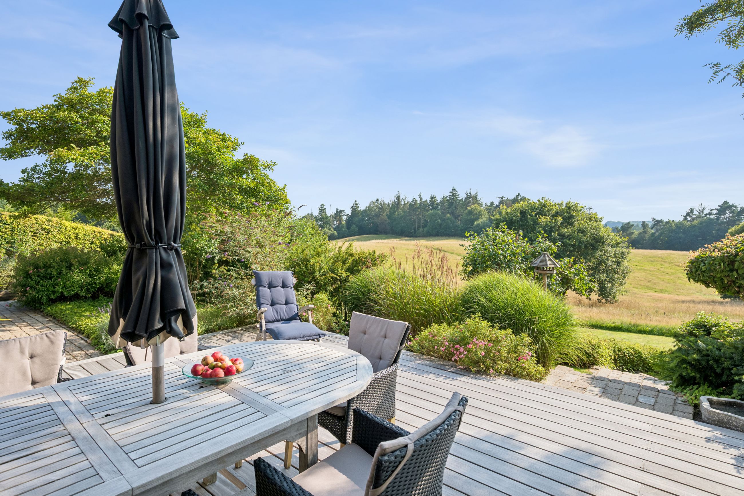 Og samtidig glider den pragtfulde have, ubesværet i ét med landskabet og skaber en helt særlig følelse af at bo midt i naturen – uden naboer på havesiden.