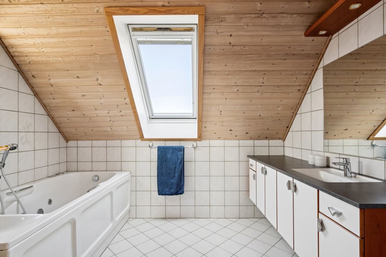Selvfølgelig er der også tænkt på praktikken, med den store indbyggede carport, værksted og depotrum over cartporten.