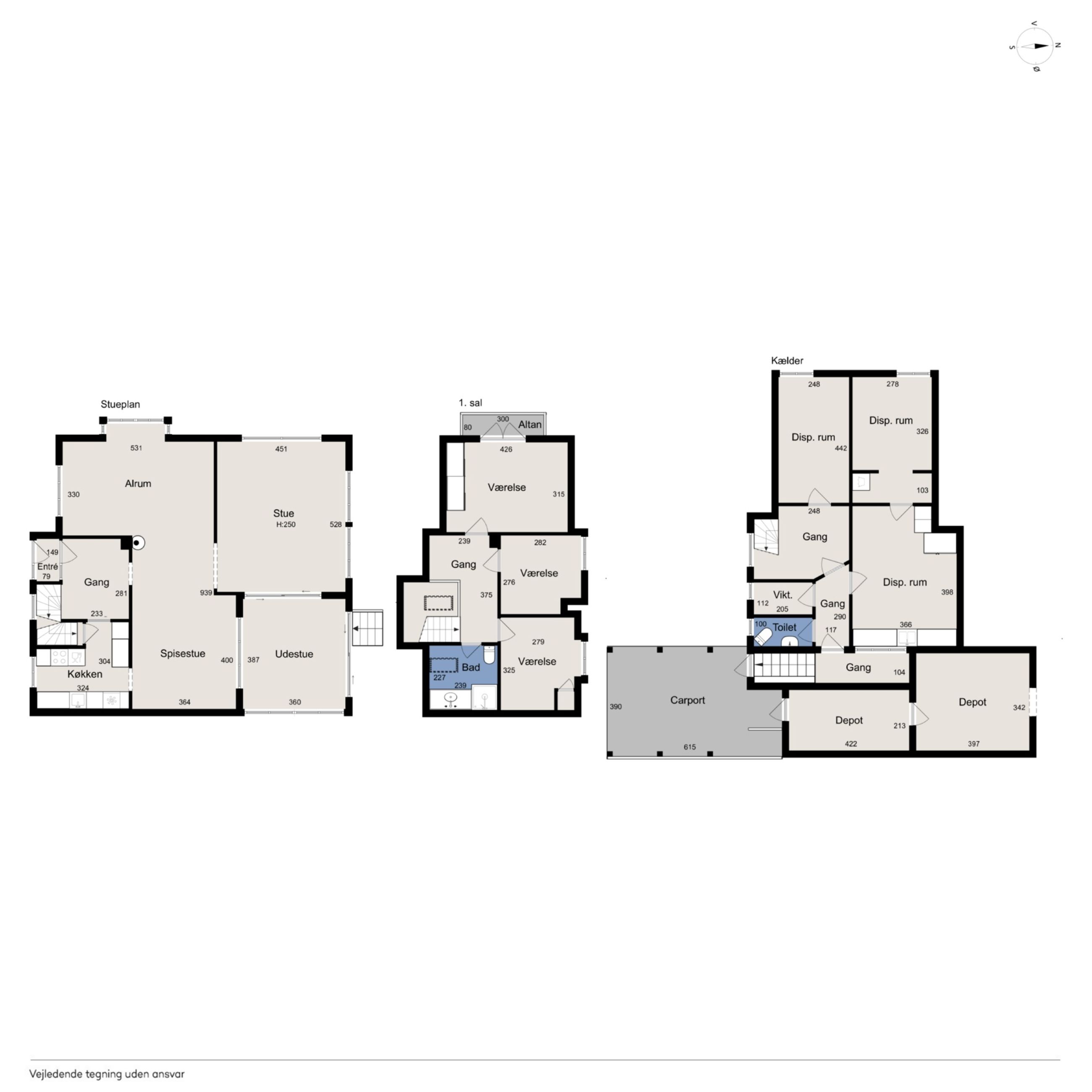 1. salen indeholder: Badeværelse med gulvvarme, to børneværelser samt stort soveværelse med udgang til altan. Kælderen fremstår højloftet og med egen indgang og indeholder disponibelrum i boligkvalitet, depotrum, gæstetoilet samt to store disponibelrum hvoraf det ene anvendes til vaskerum.