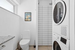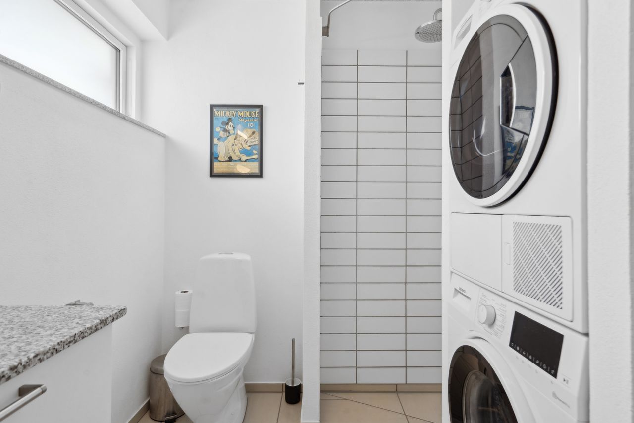 Boligen er fordelt over to værelser, hvoraf det største er indrettet med stor skabsvæg. Her er en lys entré, gæstetoilet, rummeligt badeværelse med vaskesøjle samt et særligt stort alrum med et køkken, god plads til både stue og spisestue og udgang til den solrige baghave. Køkkenet er indrettet med kvalitetsmaterialer- og hvidevarer. Her er granitbordplader, stålfri hvidevarer og god skabs- og bordplads.