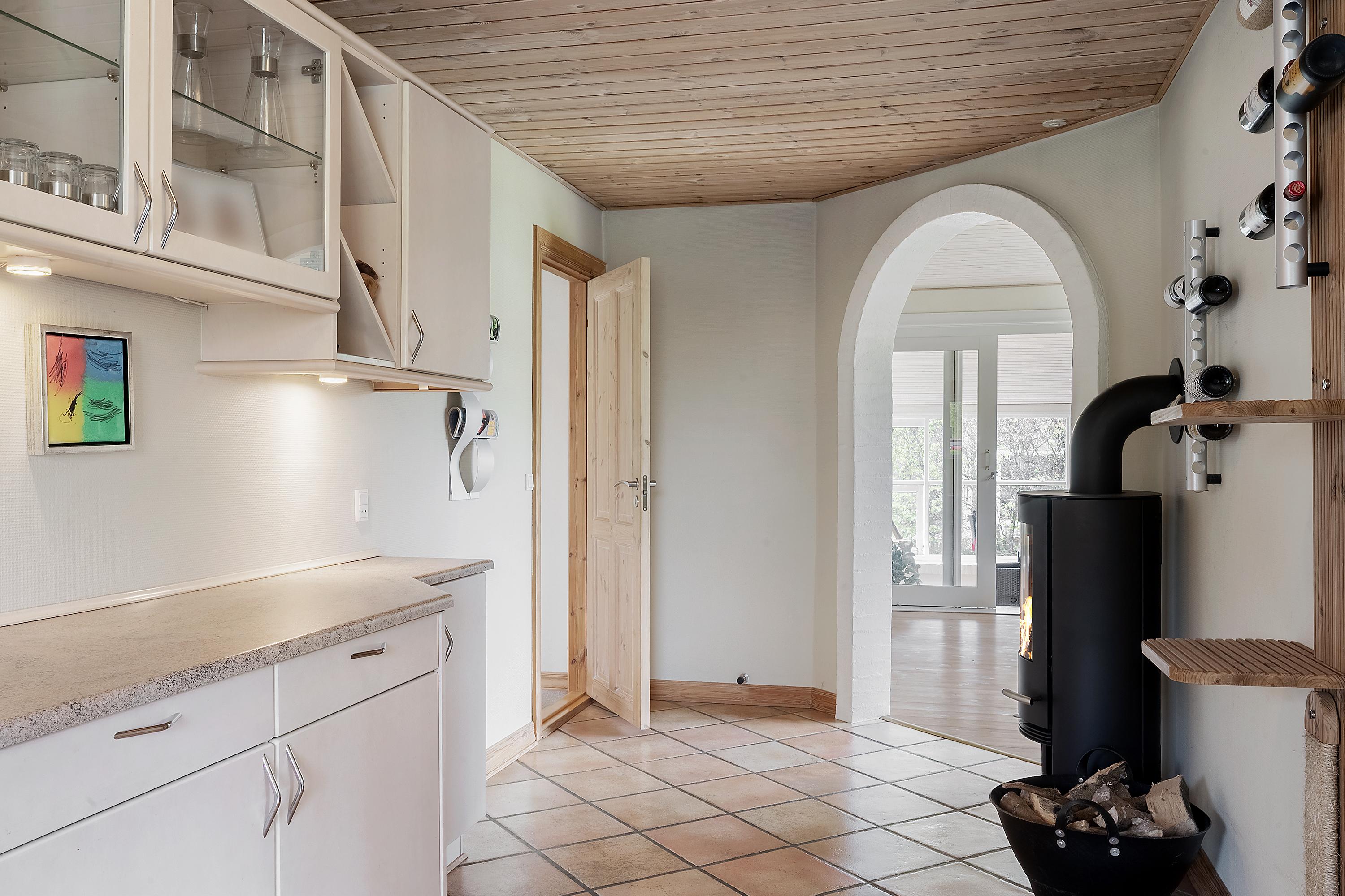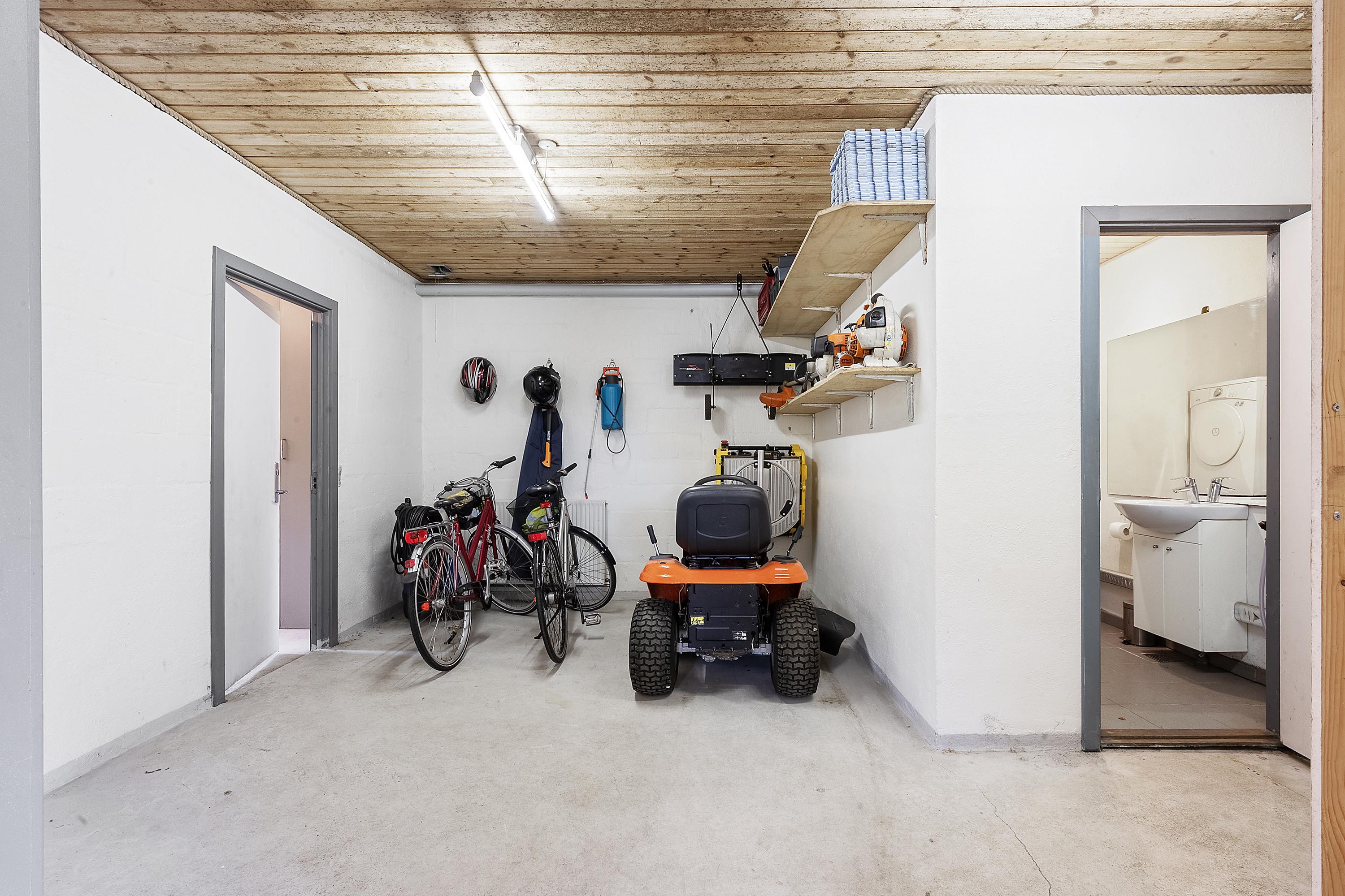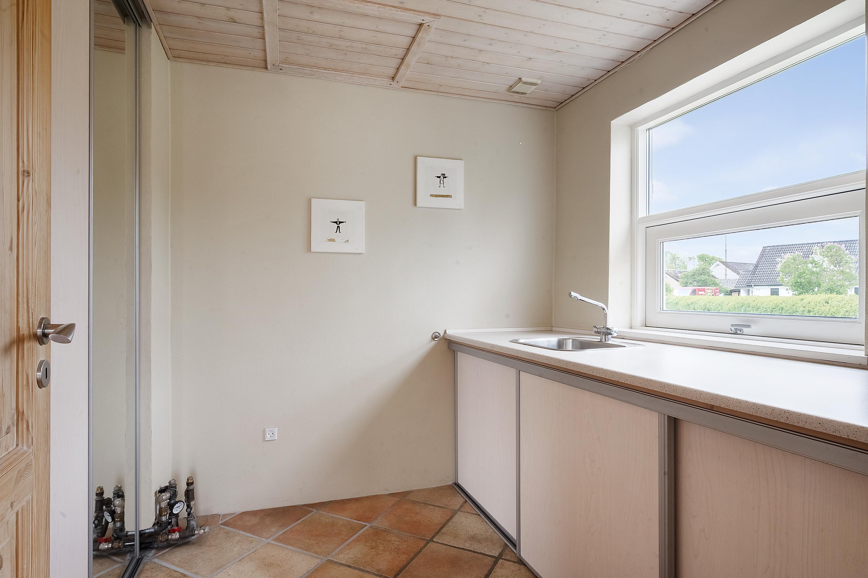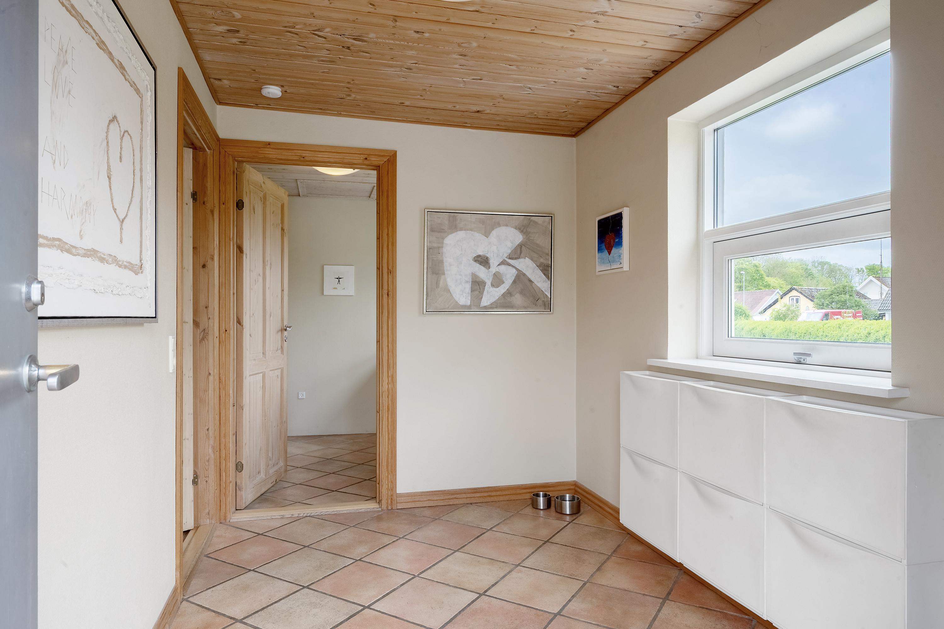 Ved ankomsten træder du ind i en lys entré med bryggers i forlængelse, hvor praktiske løsninger som vask og rigelig skabsplads gør hverdagen