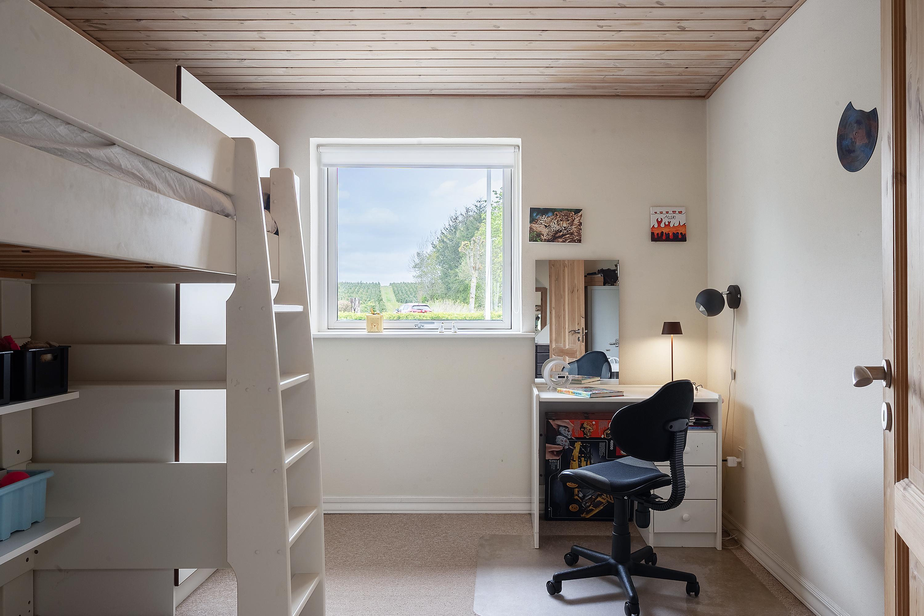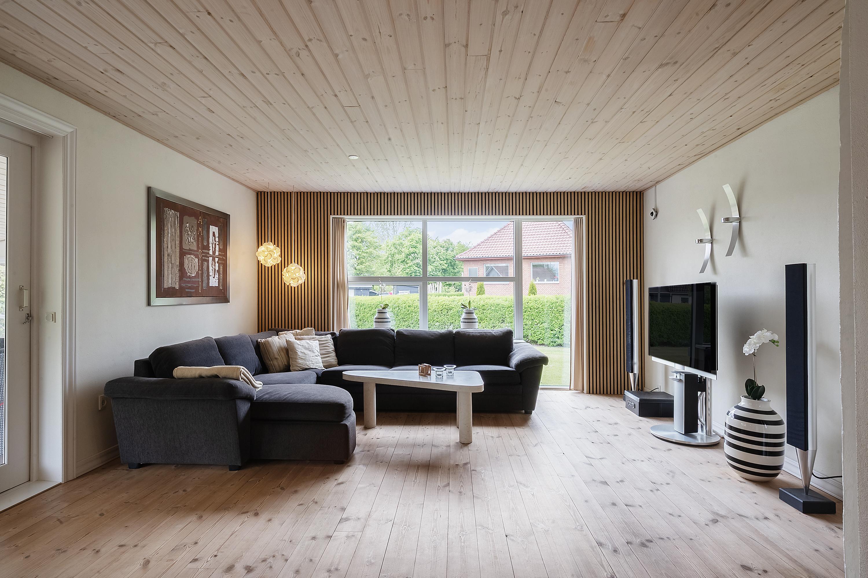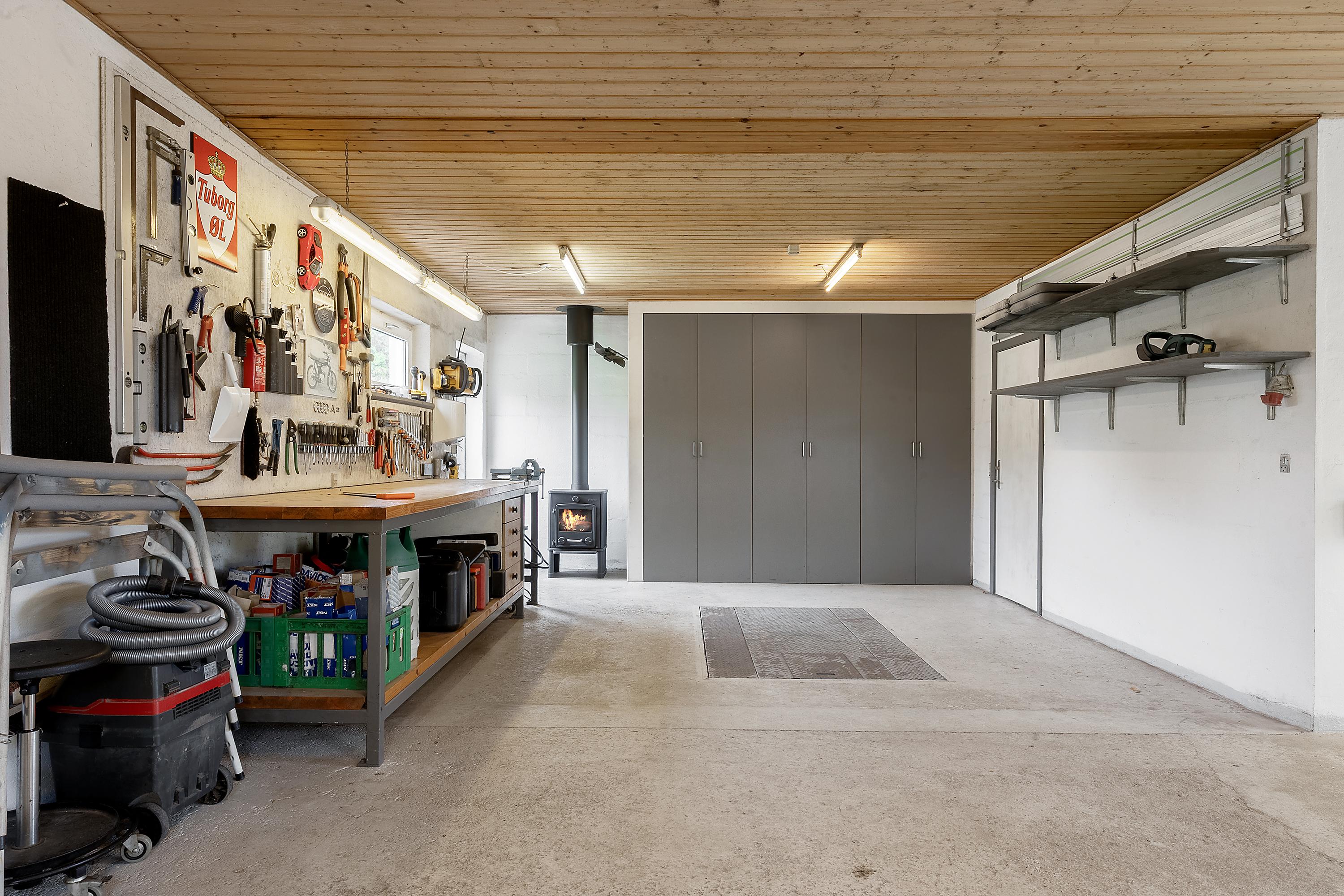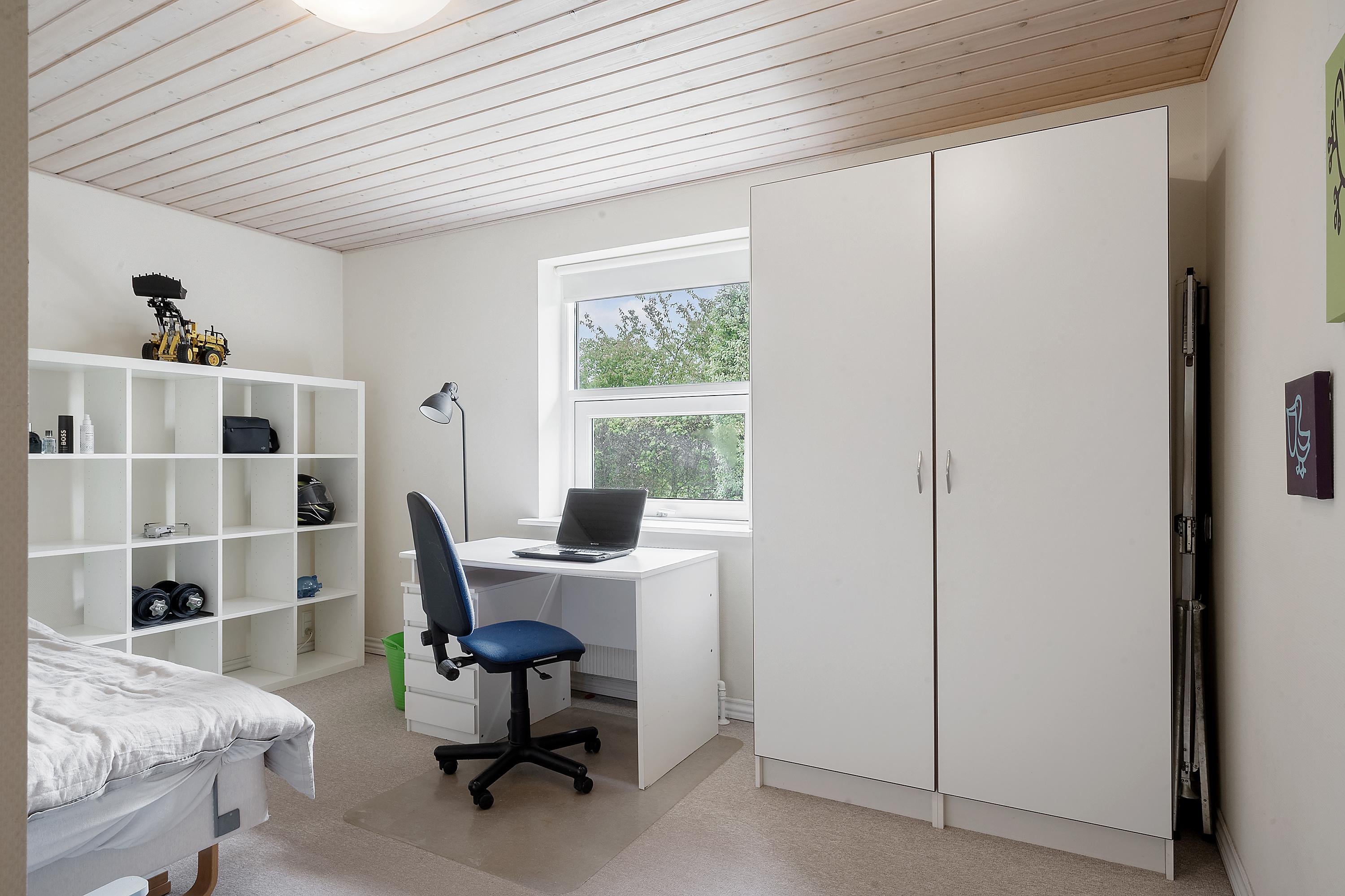 Ved ankomsten træder du ind i en lys entré med bryggers i forlængelse, hvor praktiske løsninger som vask og rigelig skabsplads gør hverdagen