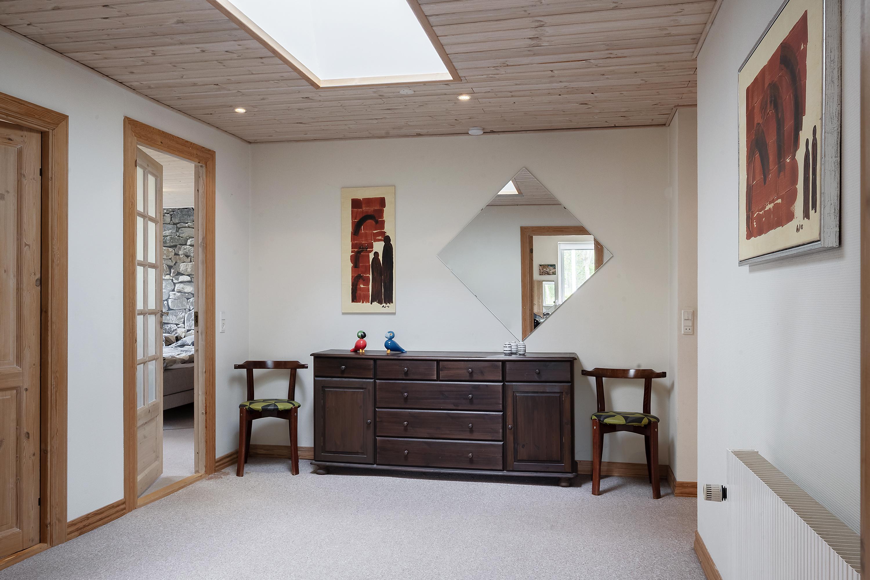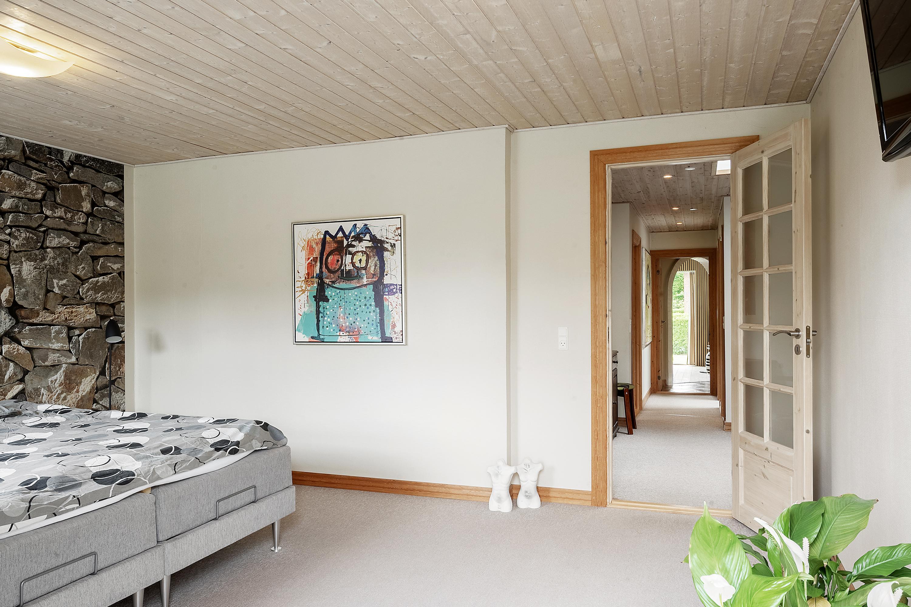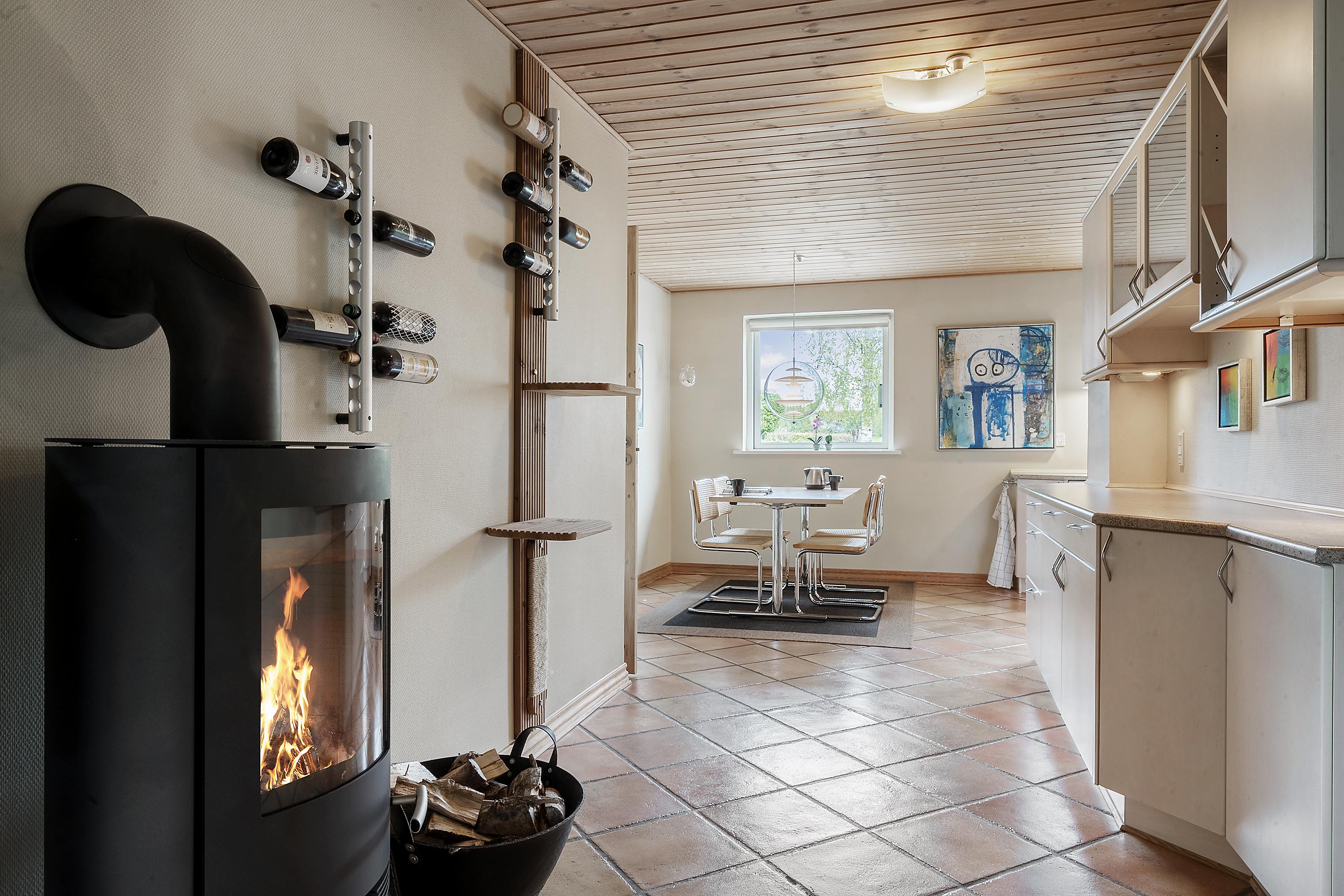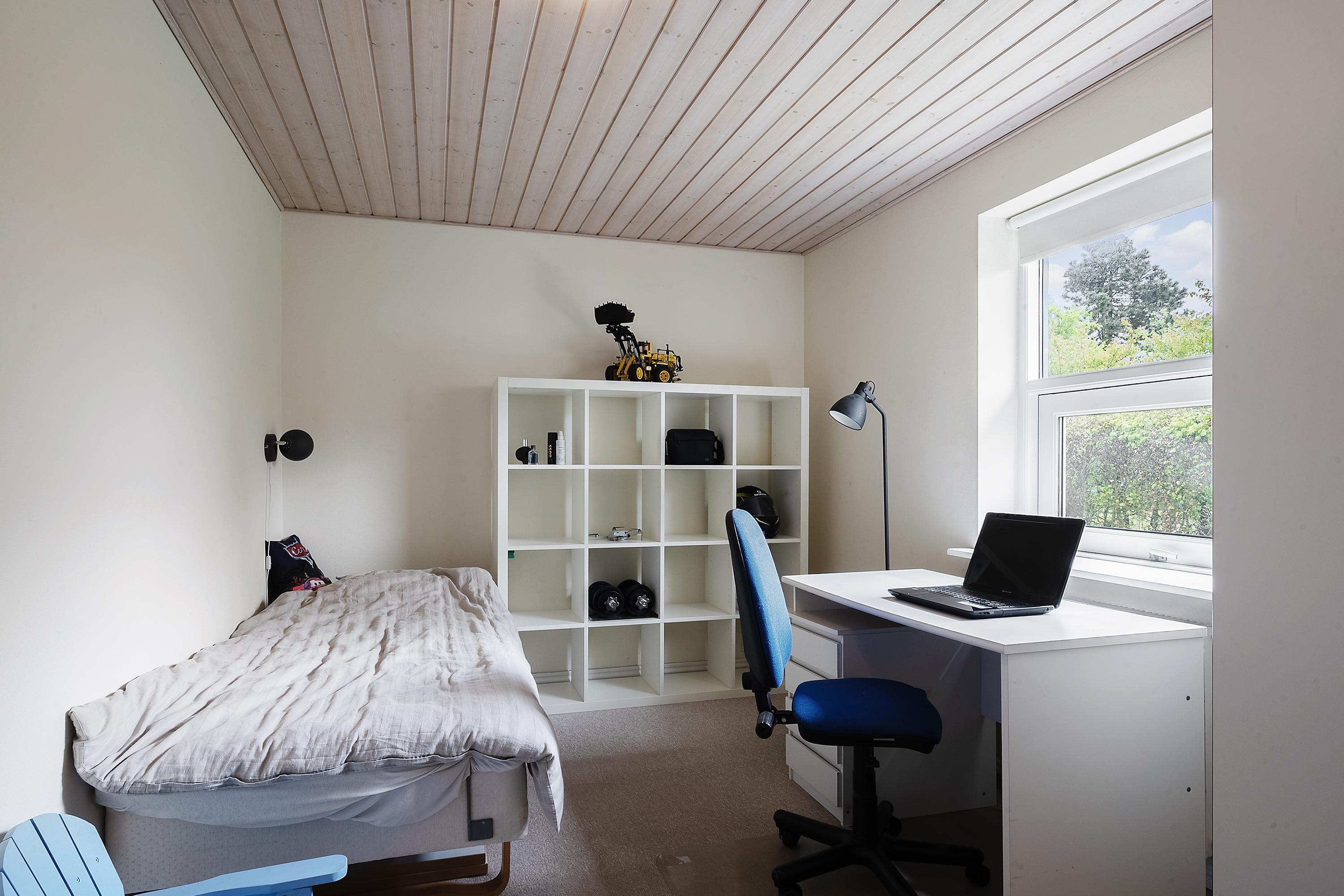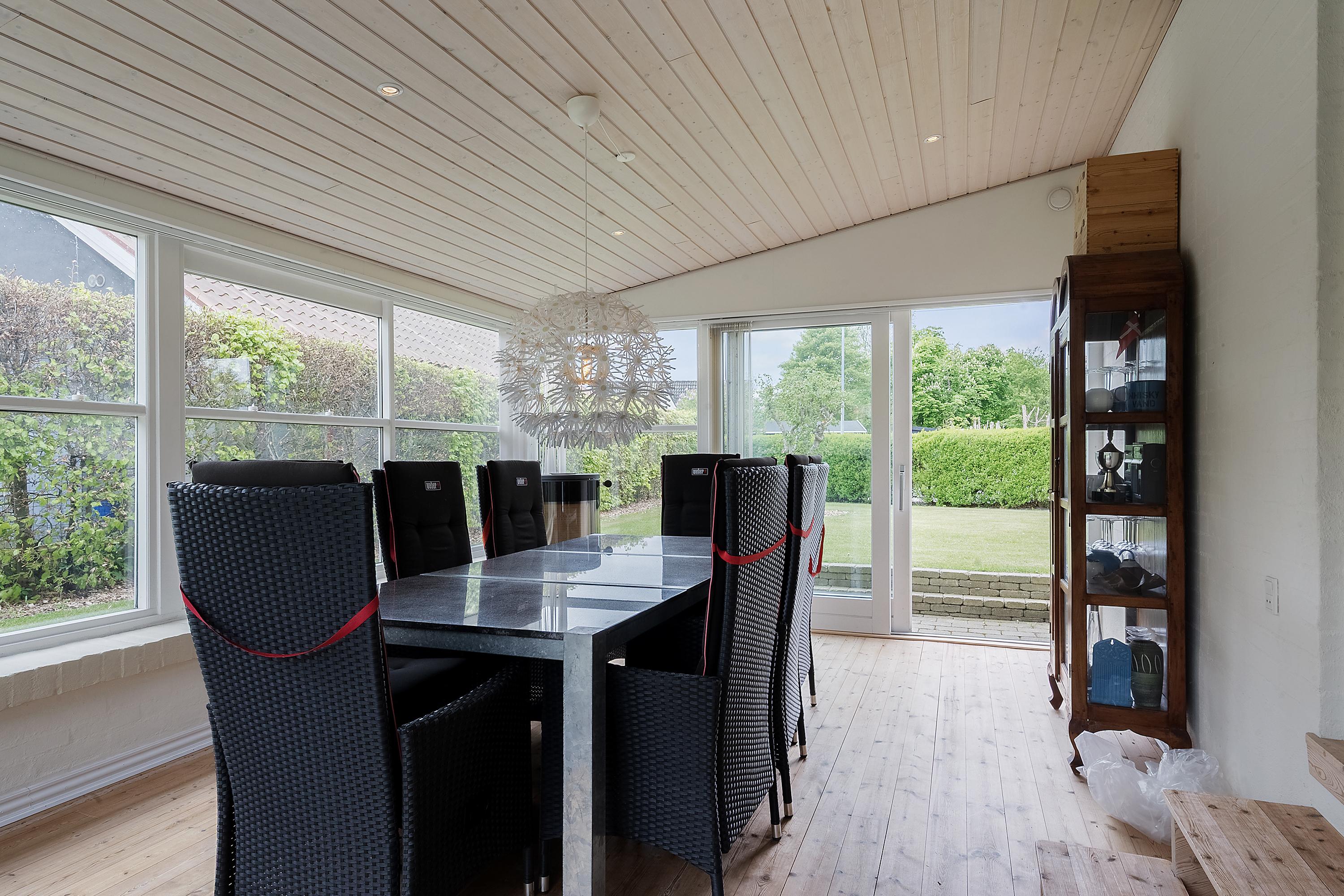 Ved ankomsten træder du ind i en lys entré med bryggers i forlængelse, hvor praktiske løsninger som vask og rigelig skabsplads gør hverdagen