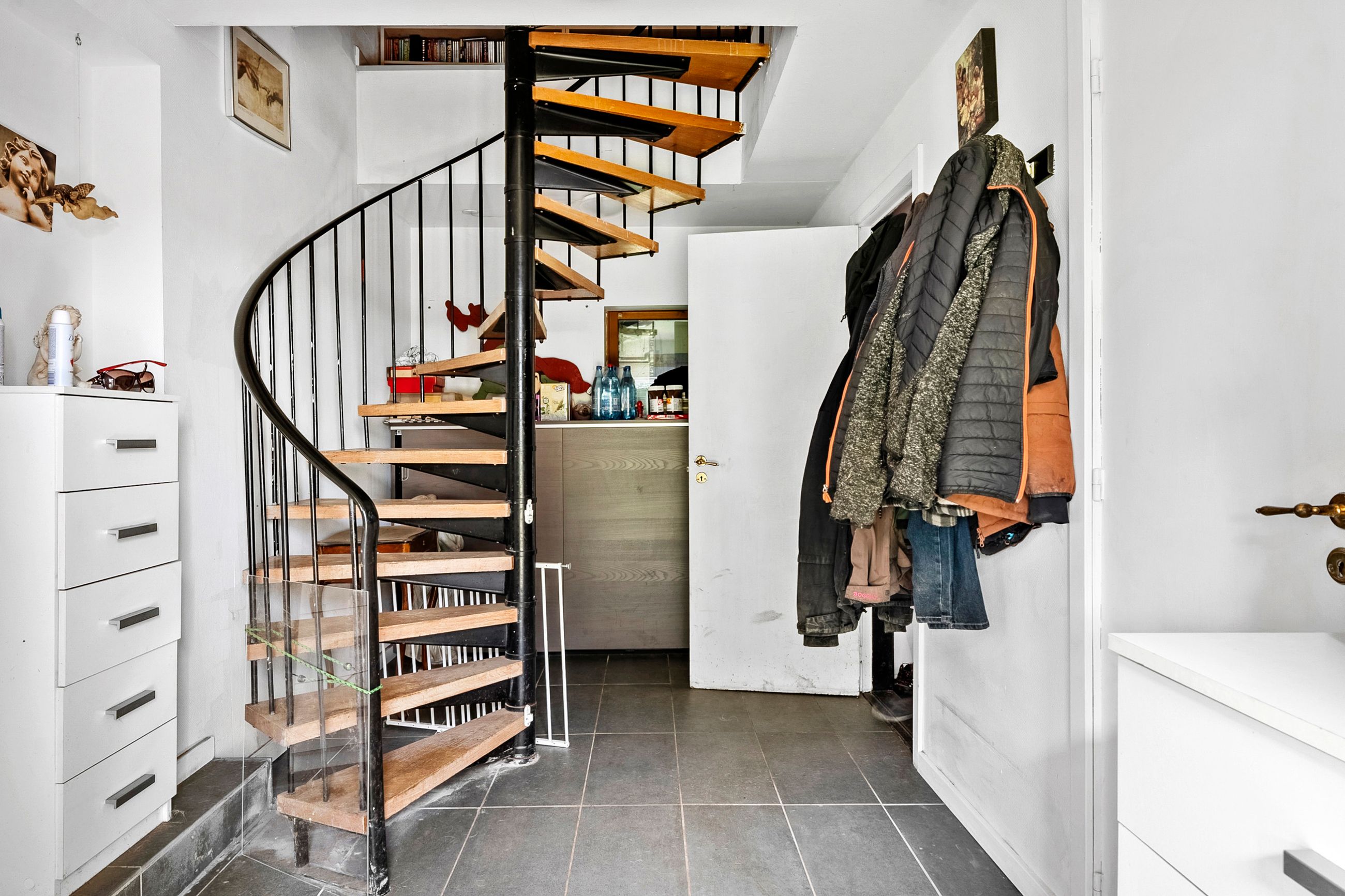 Når I træder ind i boligen, mødes I af en rummelig entré med god plads til overtøj og fodtøj. Herfra fører en elegant spindeltrappe jer videre til førstesalen.