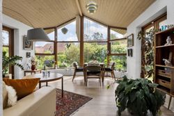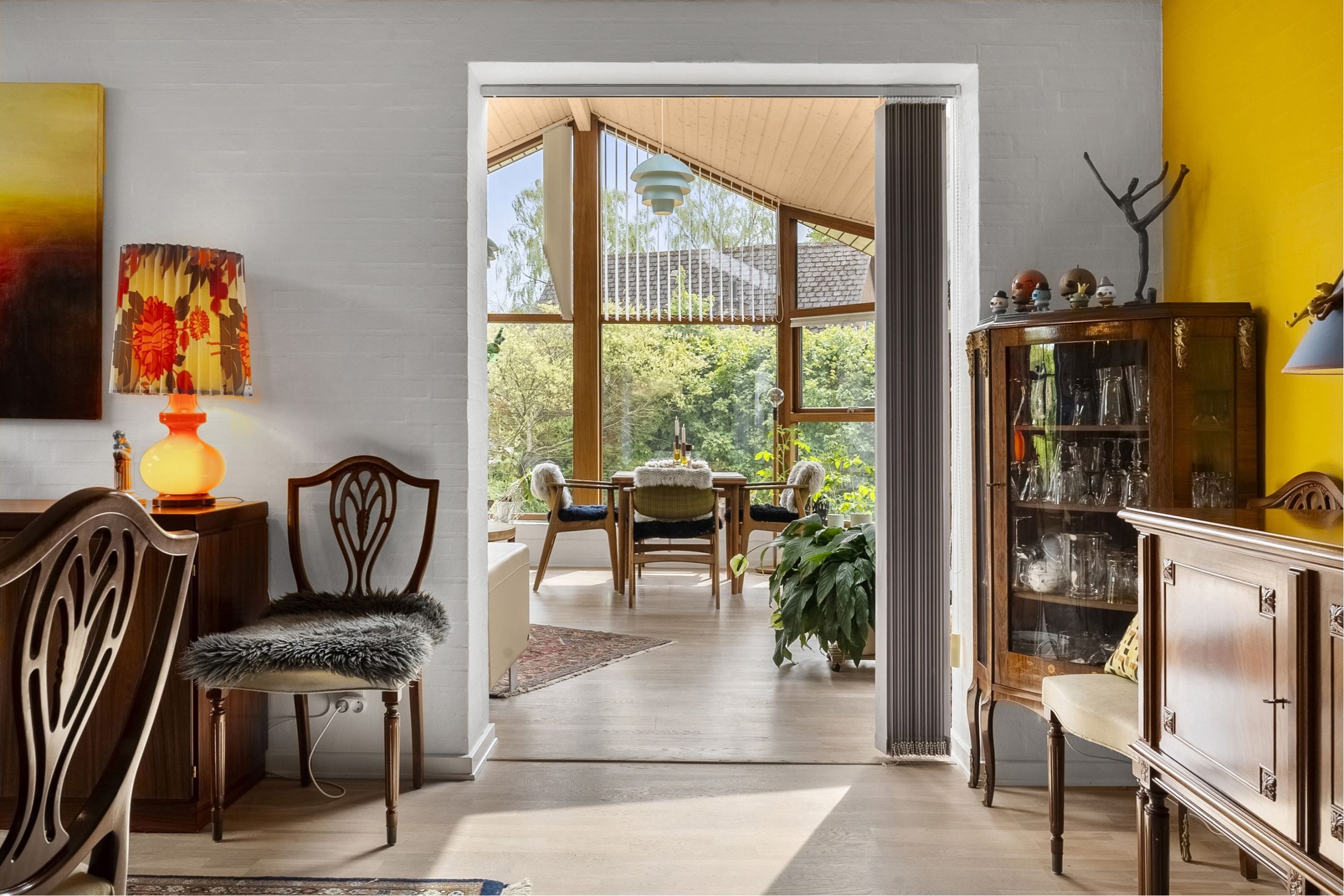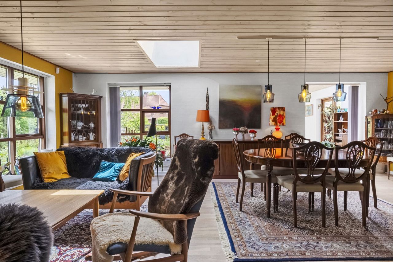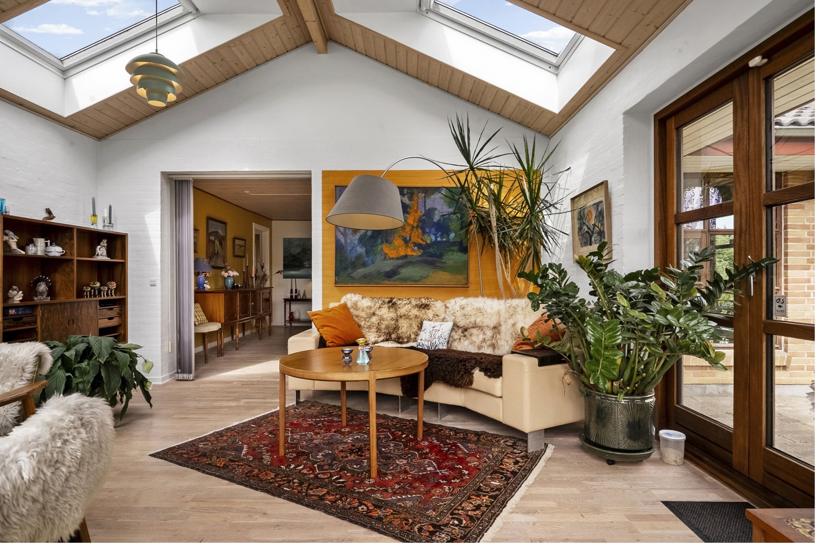Den anden stue er en tilbygning, der adskiller sig med sin imponerende loftshøjde og store vinduespartier fra gulv til loft. Her opleves rummet næsten som en udestue – fyldt med lys og med en tæt forbindelse til haven. Ovenlysvinduerne forstærker den åbne og lette atmosfære, og det er svært ikke at blive draget ud i dette fantastiske opholdsrum, som indbyder til både afslapning og samvær.