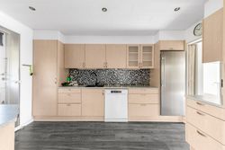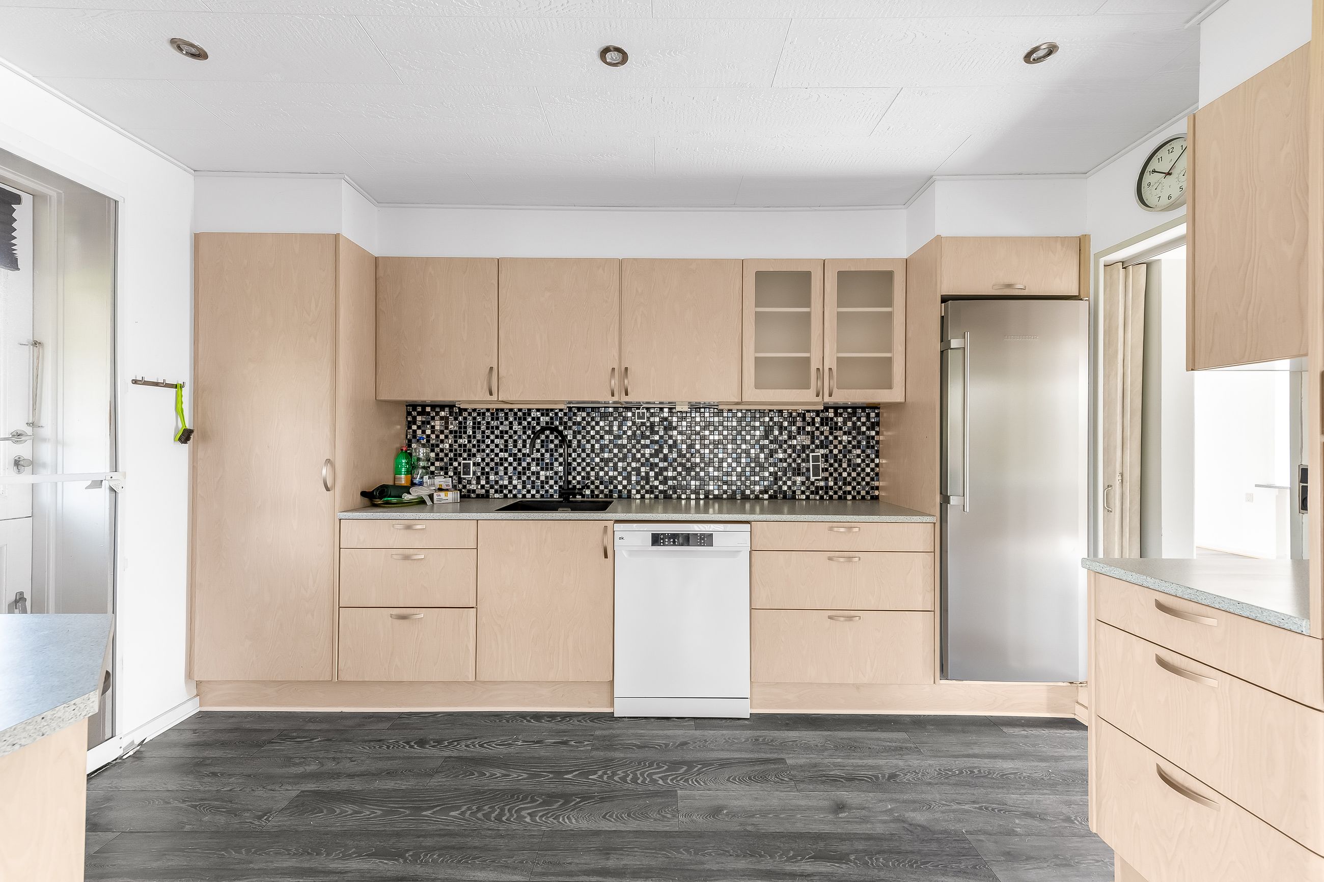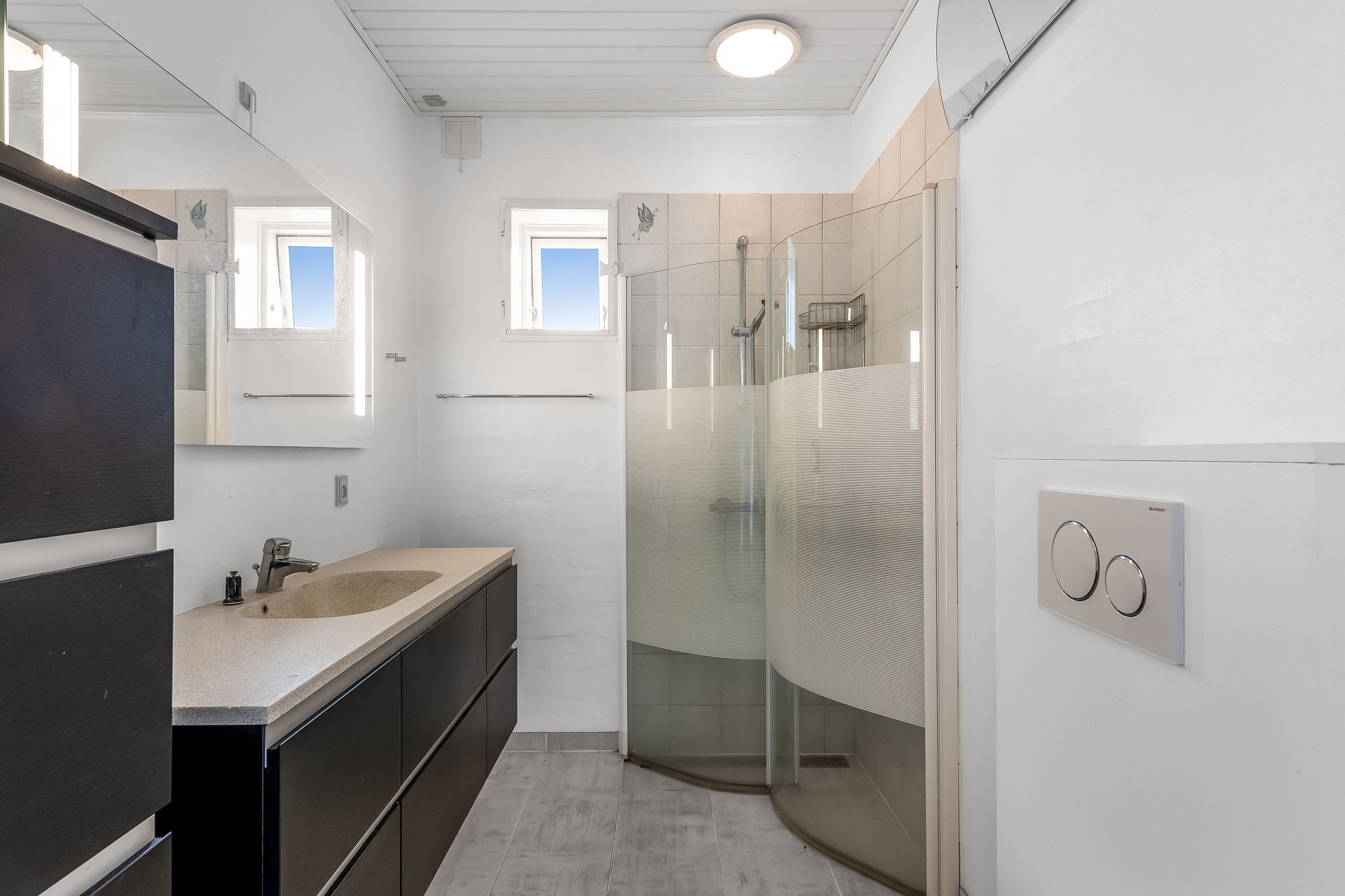 Huset byder på et pænt køkken, der fremstår funktionelt og er i en god stand. Køkkenet er et lyst rum, hvor der er tænkt over detaljer og materialevalg, hvilket giver et behageligt udtryk. Det er et sted, hvor du nemt kan forestille dig at tilbringe mange timer med madlavning og samvær. Badeværelset er ligeledes pænt og indrettet på en måde, der udnytter pladsen på bedste vis.