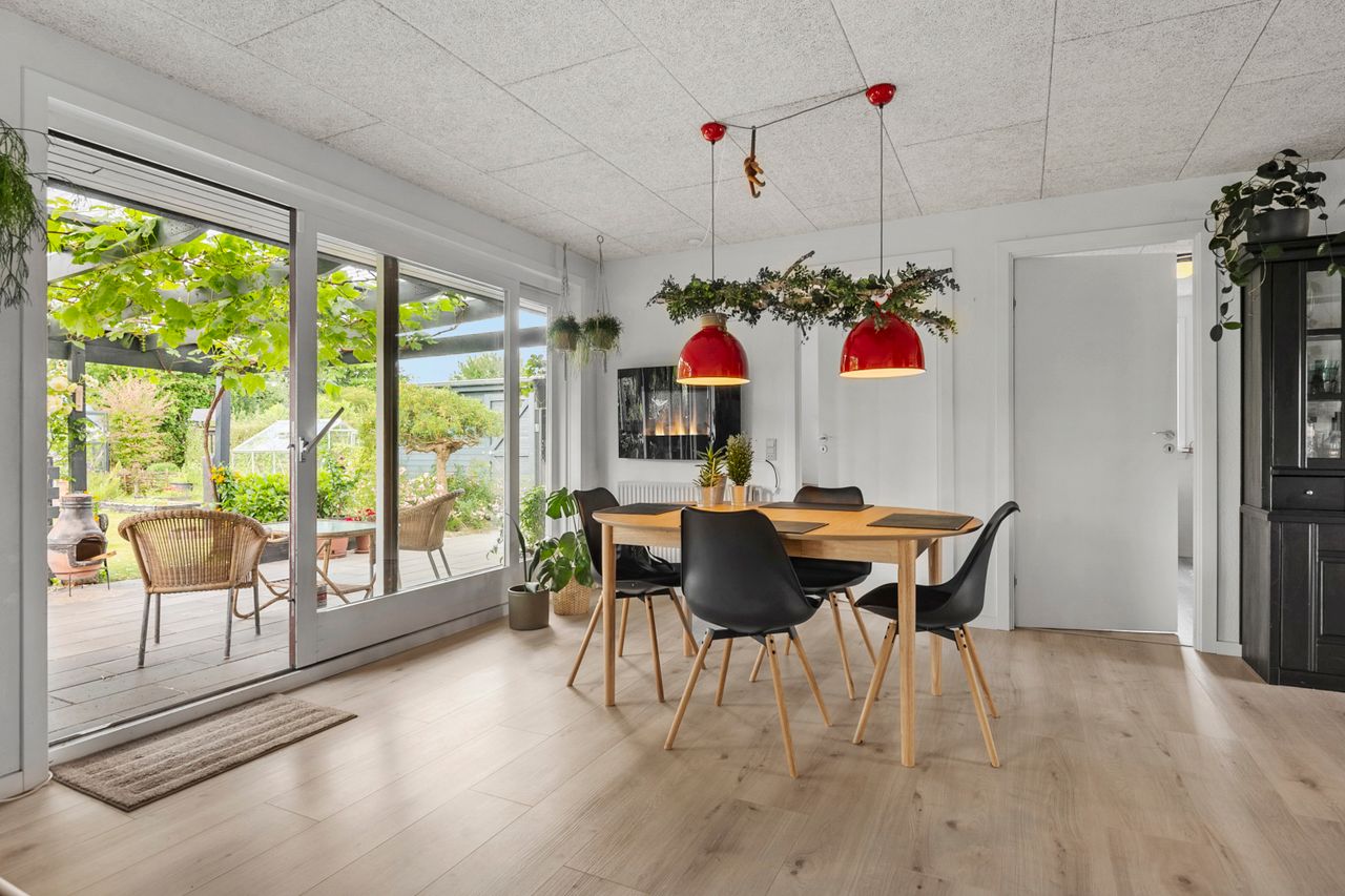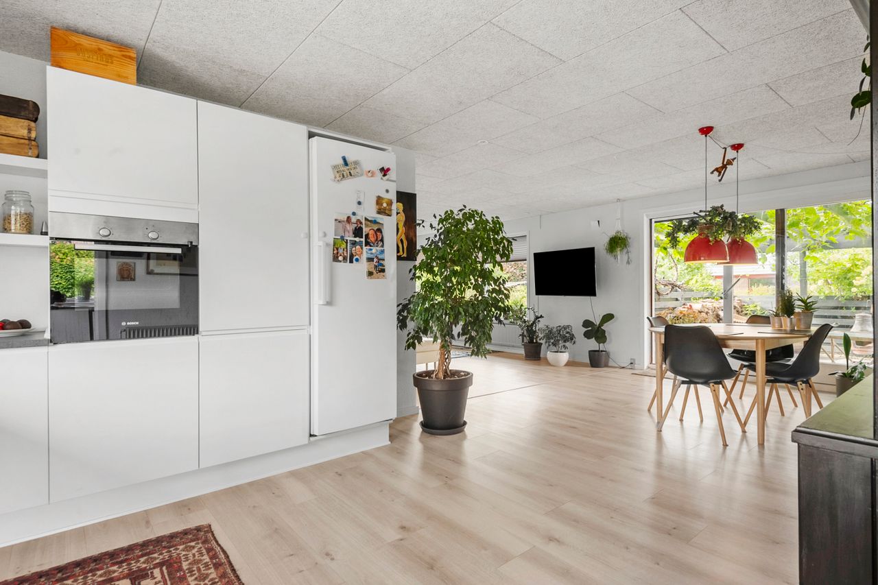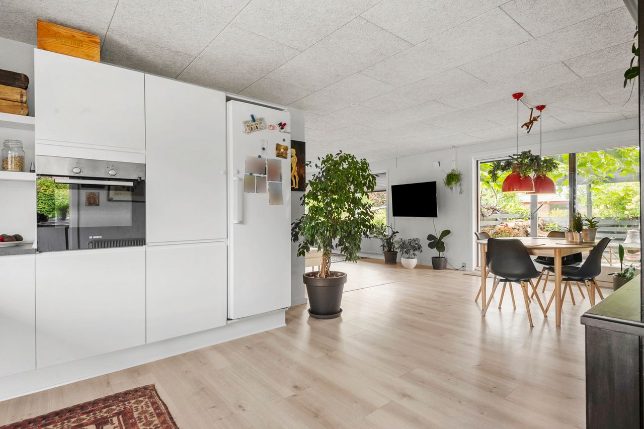 Boligens hjerte er uden tvivl det åbne køkken/alrum og stue-miljø, som samler familien i én stor og indbydende helhed. Her er plads til både madlavning, samvær og hygge, og fra spiseområdet er der direkte adgang til den sydvestvendte have, som indbyder til solrige eftermiddage og hyggelige aftener på terrassen.