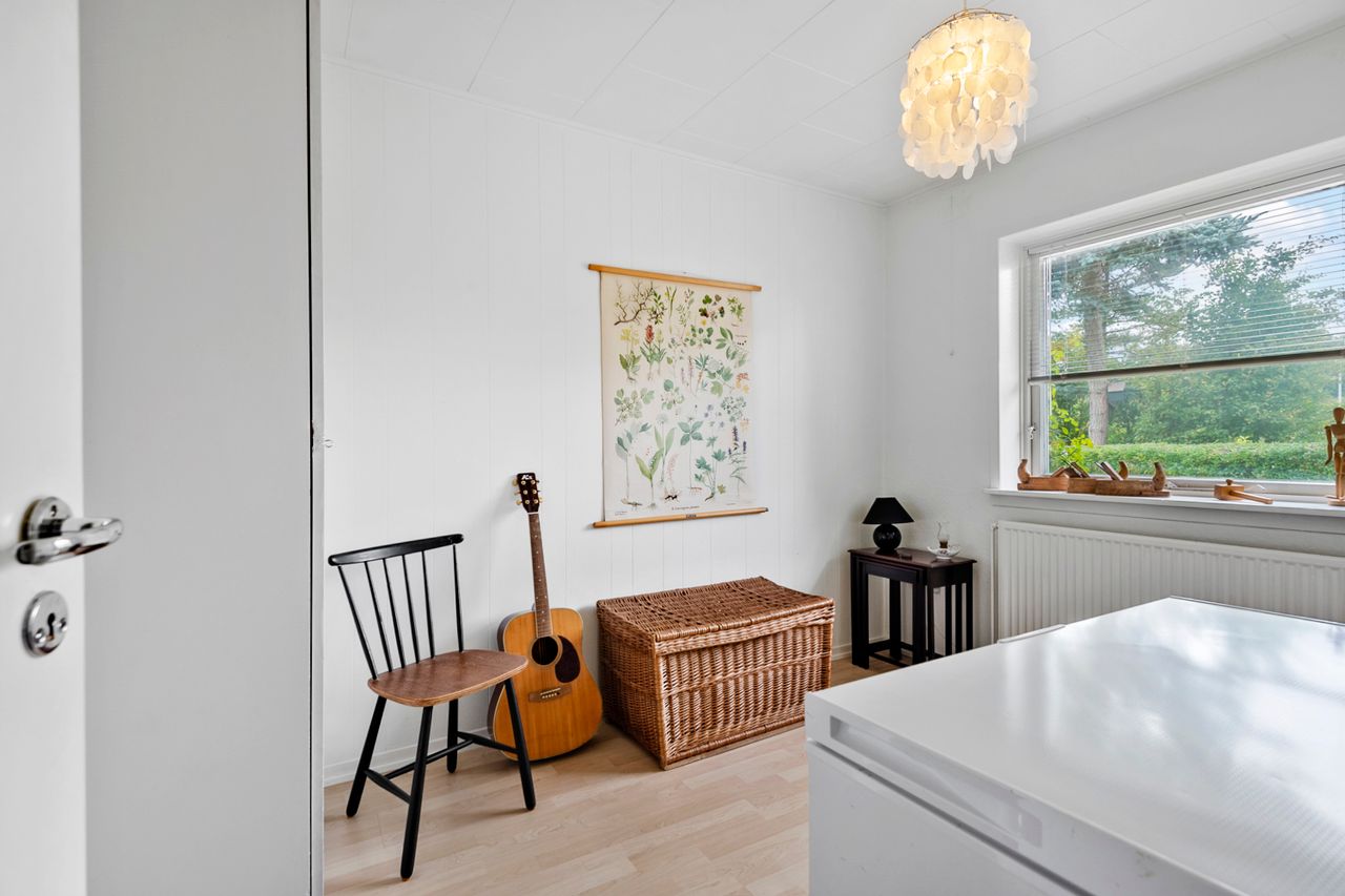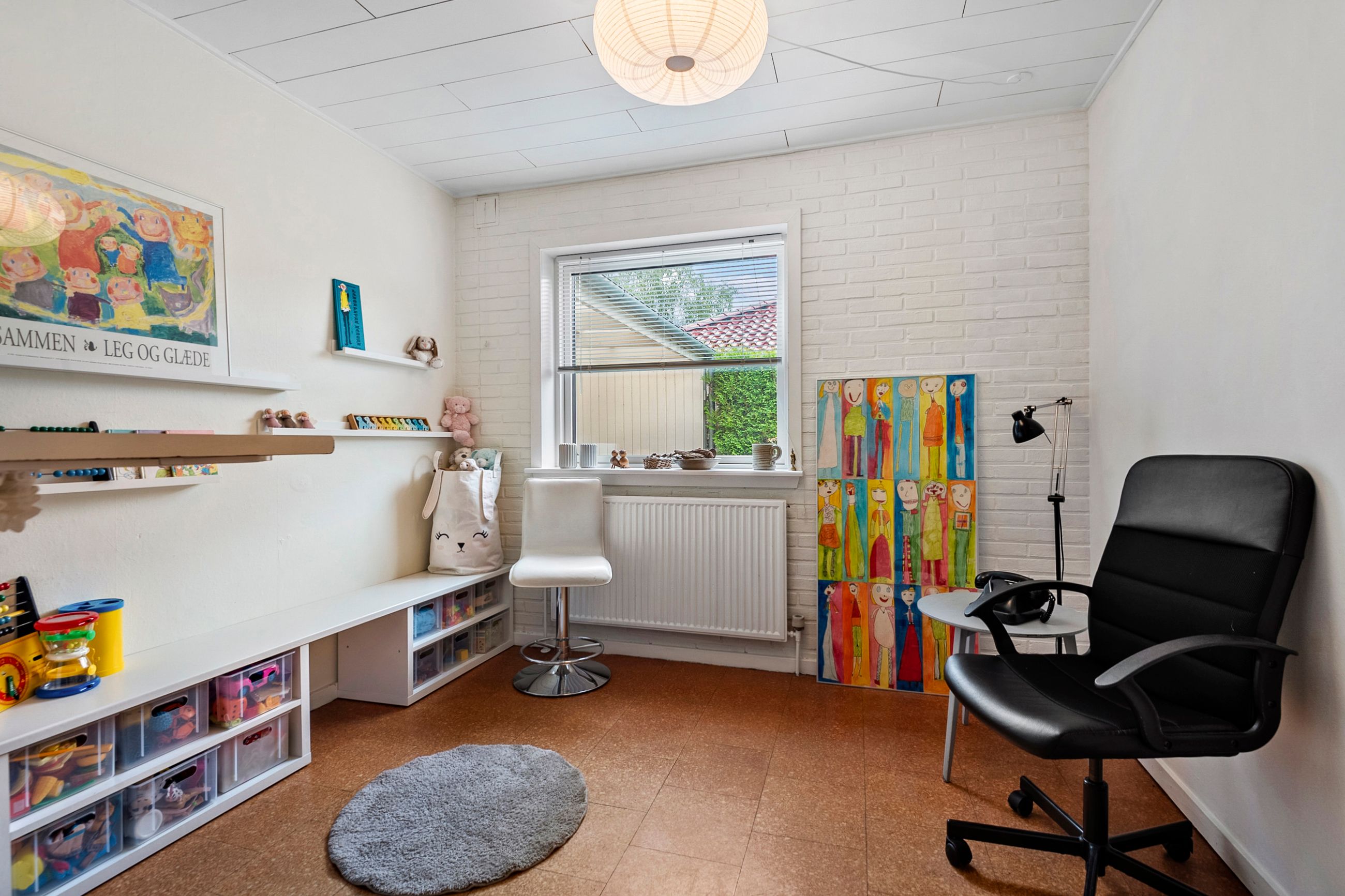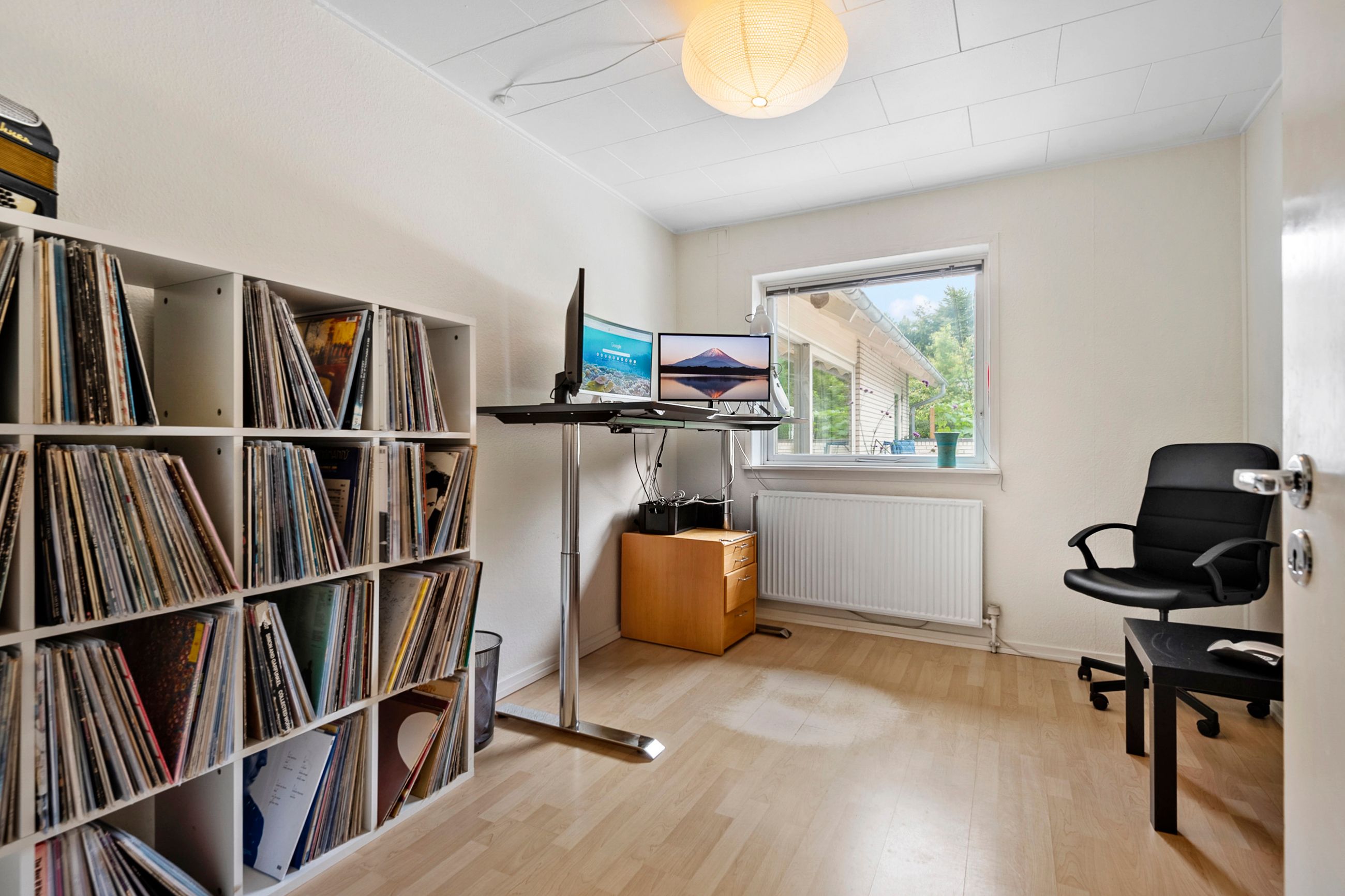 Villaen er gennemtænkt indrettet med en klar opdeling mellem forældre- og børneafdeling. I forældreafdelingen finder du et stort soveværelse med eget badeværelse og sauna – en privat oase i hverdagen. Børneafdelingen byder på hele tre store værelser samt et lyst og funktionelt badeværelse. Hertil kommer endnu et værelse, der med fordel kan indrettes som kontor eller gæsteværelse.