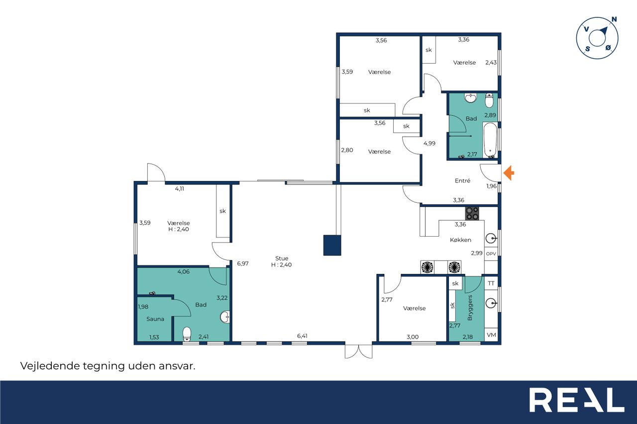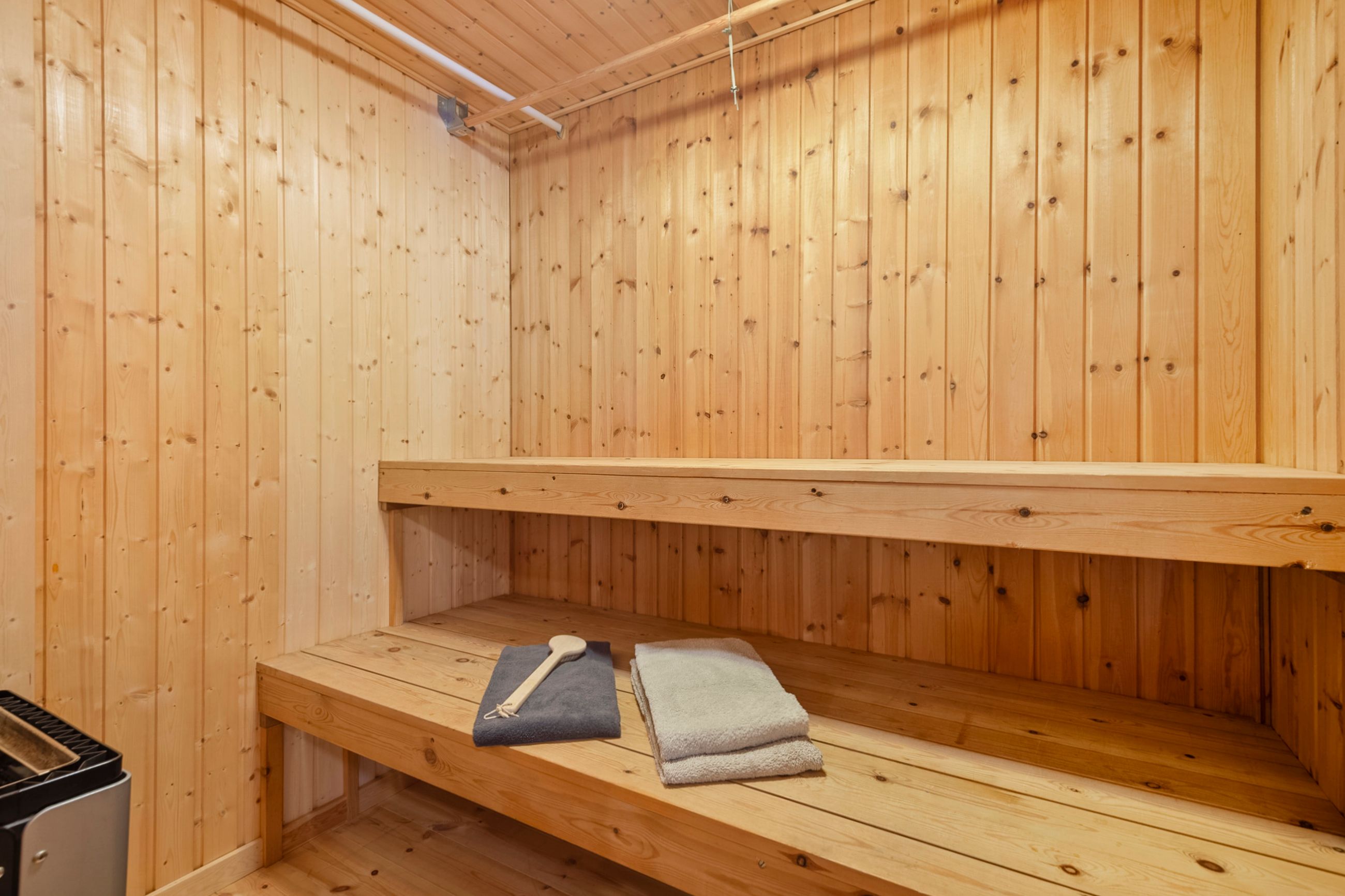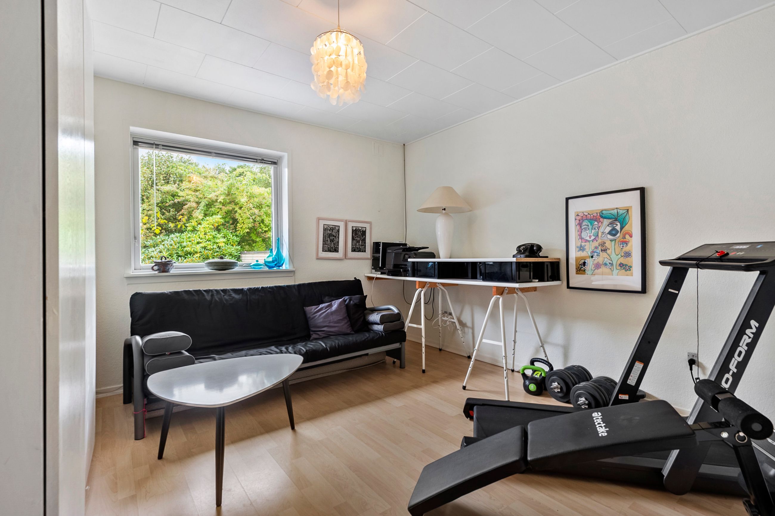 Villaen er gennemtænkt indrettet med en klar opdeling mellem forældre- og børneafdeling. I forældreafdelingen finder du et stort soveværelse med eget badeværelse og sauna – en privat oase i hverdagen. Børneafdelingen byder på hele tre store værelser samt et lyst og funktionelt badeværelse. Hertil kommer endnu et værelse, der med fordel kan indrettes som kontor eller gæsteværelse.